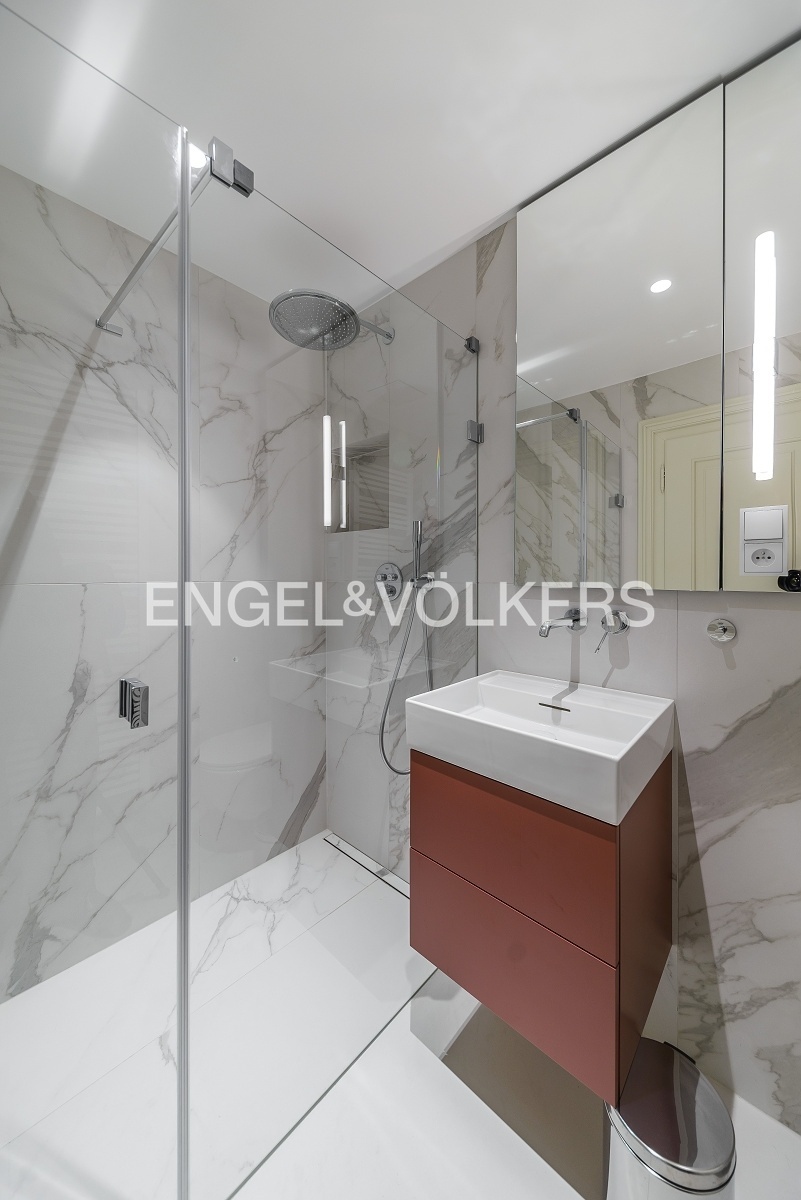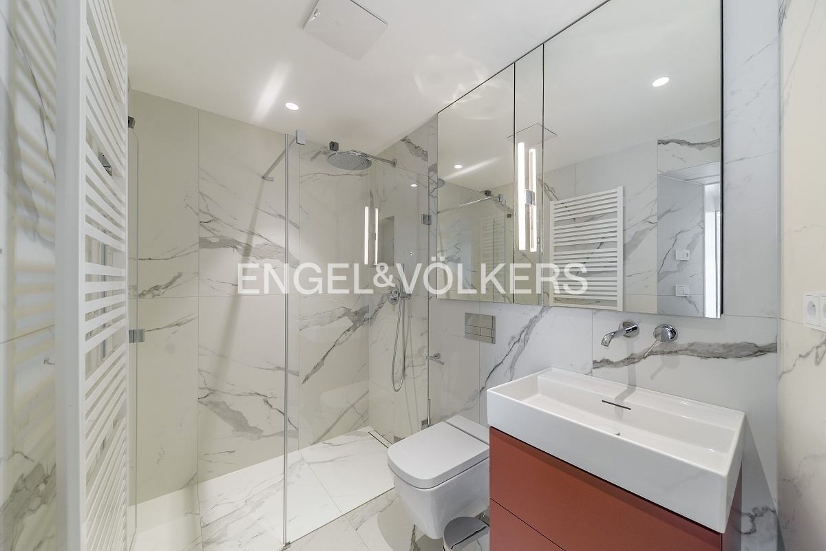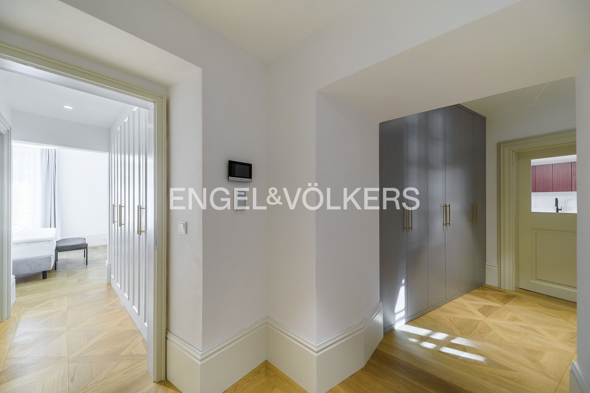V apartmánu jsou dřevěné podlahy, klimatizace, vestavěné skříně a elektronicky ovládané rolety.