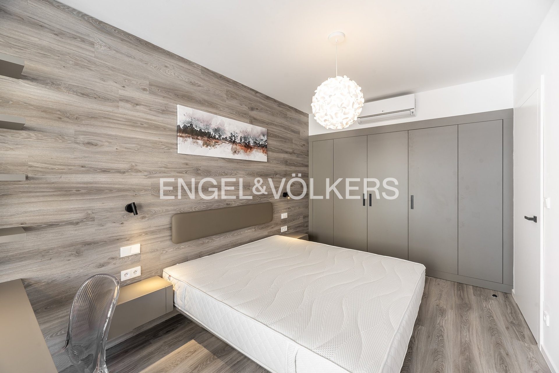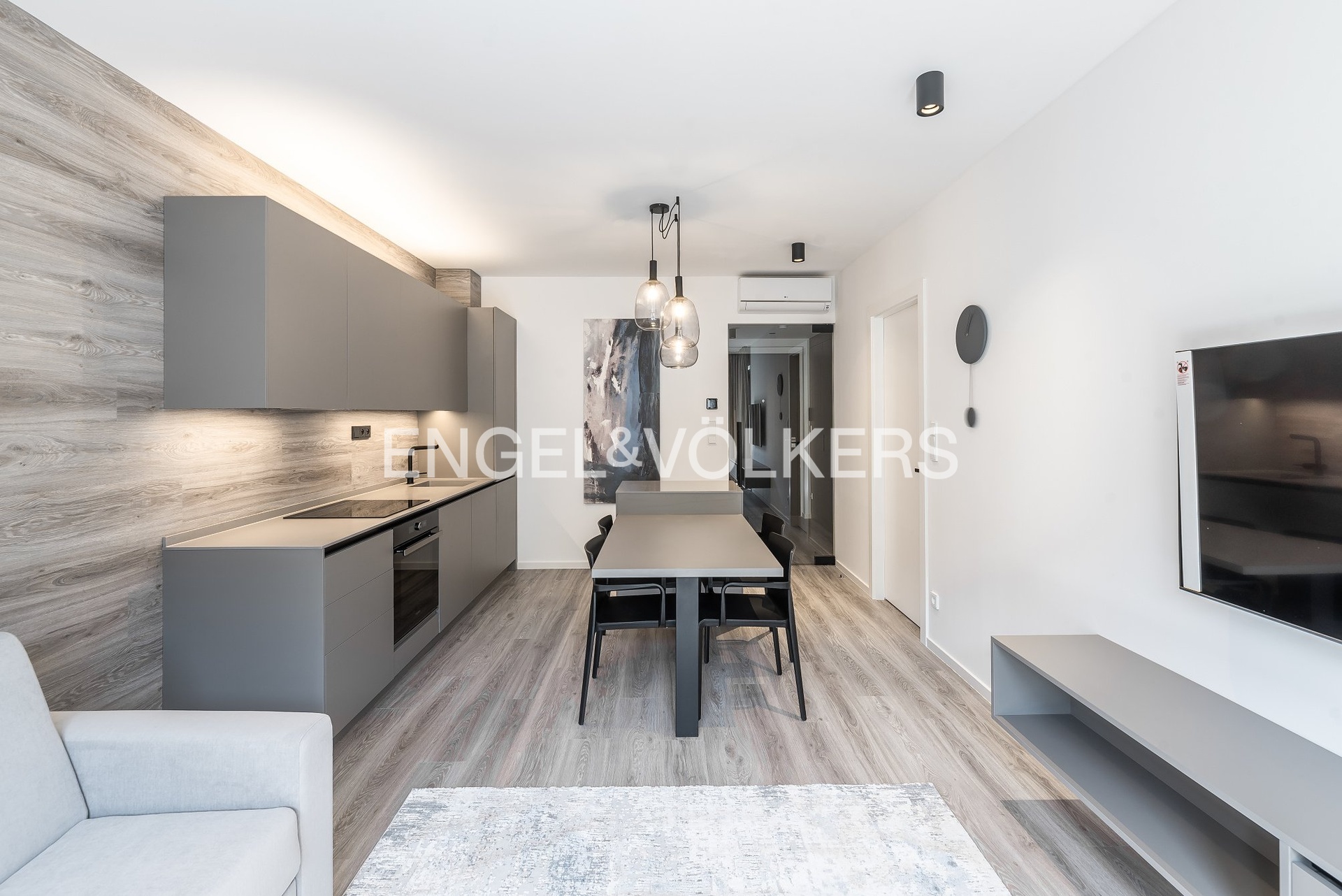 Dispozice bytu zahrnuje vstupní halu s vestavěnou skříní, prostorný obývací pokoj s plně vybaveným kuchyňským koutem, jídelním prostorem a přímým vstupem na balkon, ložnici vybavenou vestavěnými šatními skříněmi a koupelnu, která disponuje vanou, toaletou a pračkou. Byt je plně vybaven nábytkem včetně rozkládací pohovky, záclon, LED televize a kombinované pračky se sušičkou. Komfort zvyšuje klimatizace ve všech hlavních místnostech.