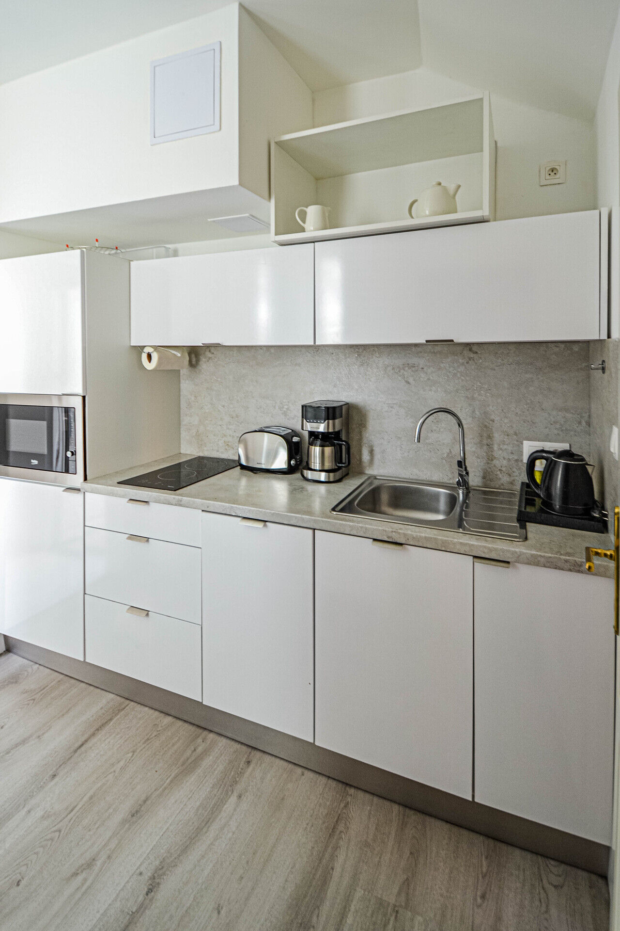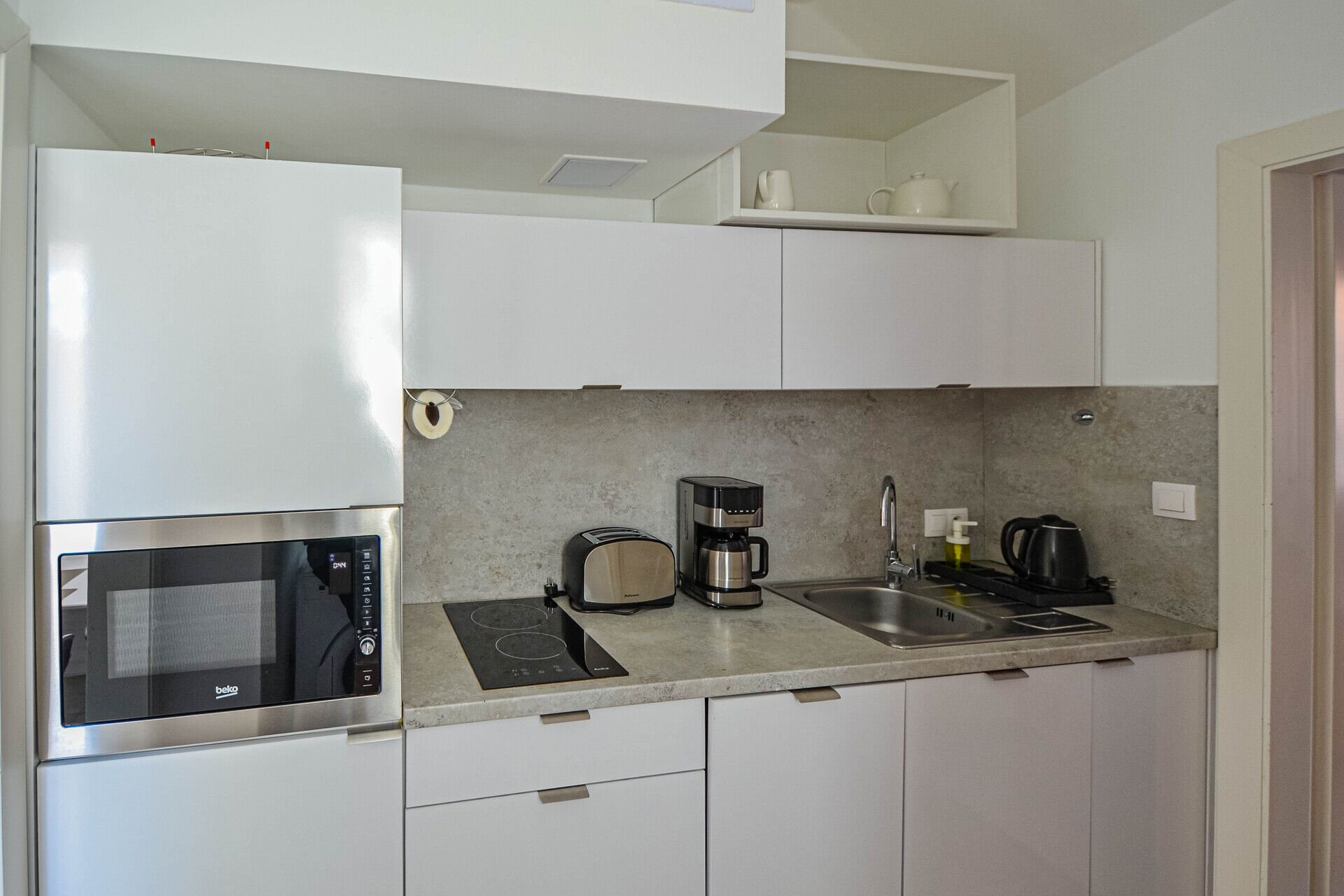 Kuchyňský kout je vybaven moderní kuchyňskou linkou s vestavěnými a drobnými spotřebiči (elektrická trouba, dvouplotýnková varná deska, mikrovlnná trouba, myčka, lednice s mrazničkou, kávovar, rychlovarná konvice, toustovač).