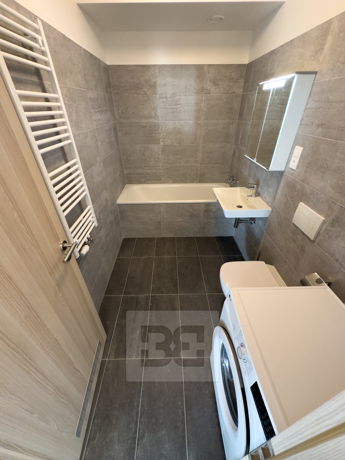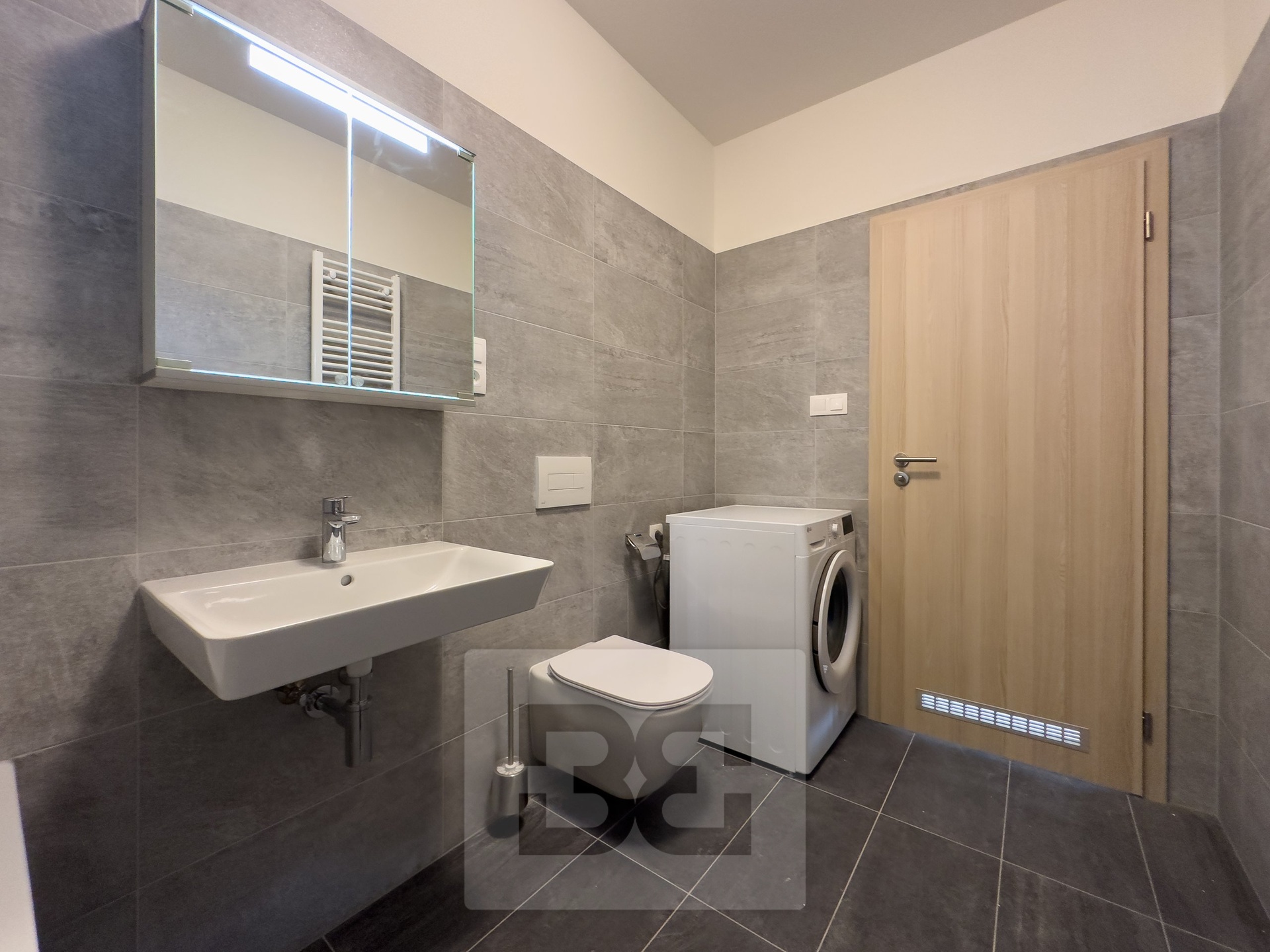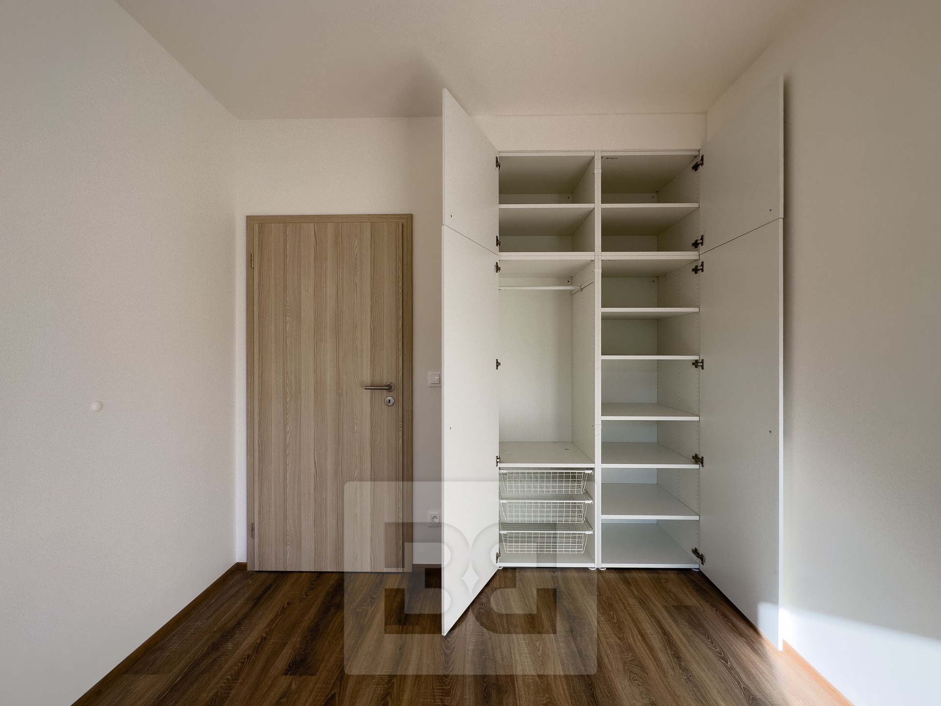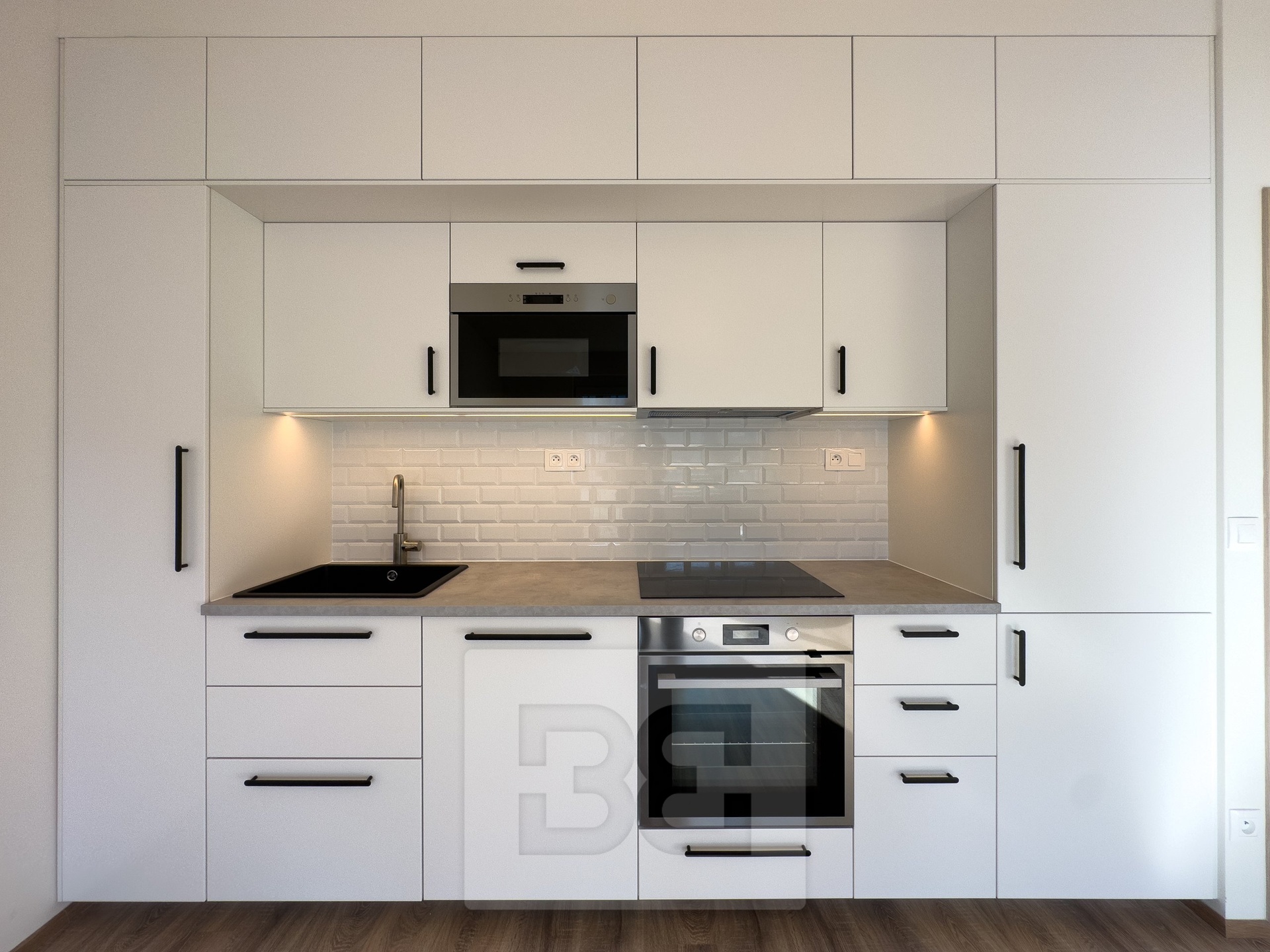 Byt je zcela nový a ještě nebyl obydlen. Byt se skládá z předsíně, koupelny s vanou a WC, obývacího pokoje s kuchyňským koutem, ložnice, šatny (komory) a balkonu. Kuchyň je vybavena kuchyňskou linkou s vestavěnými spotřebiči (pečící troubou, mikrovlnkou, varnou deskou, myčkou nádobí, digestoří a vestavnou chladničkou). Součástí bytu jsou šatní skříně v předsíni a ložnici. Koupena je vybavena pračkou. K bytu patří parkovací stání a sklep (v ceně nájmu). Obyvatelům domu je k dispozici velká kolárna s myčkou na kola.