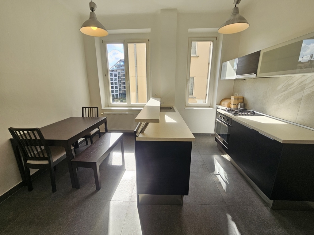 Byt prošel před 7 lety rekonstrukcí. Aktuálně je byt nově vymalovaný a uklizený a připravený pro nového nájemce. Byt sestává ze 3 neprůchozích pokojů, 1 pokoj (obývací nebo 1 ložnice) je průchozí. Byt je částečně zařízený nábytkem viz foto. Po dohodě je možné některé kusy nábytku odvézt. Kuchyně je vybavena plynovou varnou deskou, el. troubou, digestoří, myčkou a lednicí s mrazákem. V koupelně je sprchový kout, umývadlo a WC a dále pračka a sušička. Na podlaze jsou parkety a velkoformátová dlažba. Topení je etážové - vlastní plynový kotel, který zajišťuje jak ohřev teplé vody, tak i vytápění. Internet je v bytě veden optickým kabelem, který umožňuje široký výběr internetového poskytovatele.