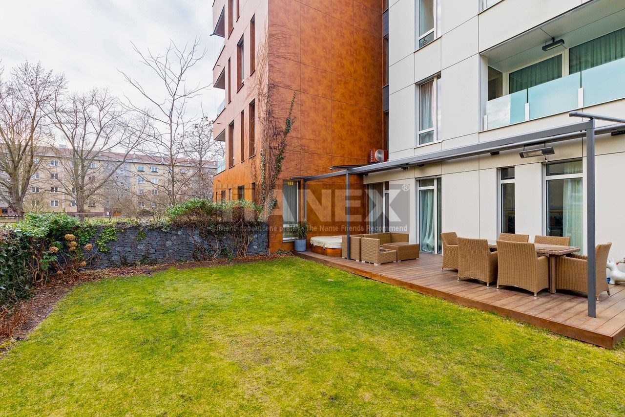 Moderní designový byt 3+kk (99 m2) s velkou privátní zahradou (200 m2), parkovacím stáním a sklepem v luxusní rezidenci v Praze 4 – Hodkovičkách. Nadstandardně vybavený a zařízený byt vás nadchne svou velkorysou dispozicí a vzdušností. Plně klimatizovaný byt nabízí 2 ložnice, prostornou šatnu – walk in closet, koupelnu s vanou, sprchový kout a toaletou a samostatnou toaletu. Z obývacího pokoje (40 m2) s kuchyňským koutem je přímý vstup do zahrady. Kuchyňská linka s ostrůvkem je vybavena kvalitními vestavěnými spotřebiči. Luxusní bydlení doplňuje krytá terasa s vířivkou. Předokenní žaluzie. Orientace bytu jih a východ.