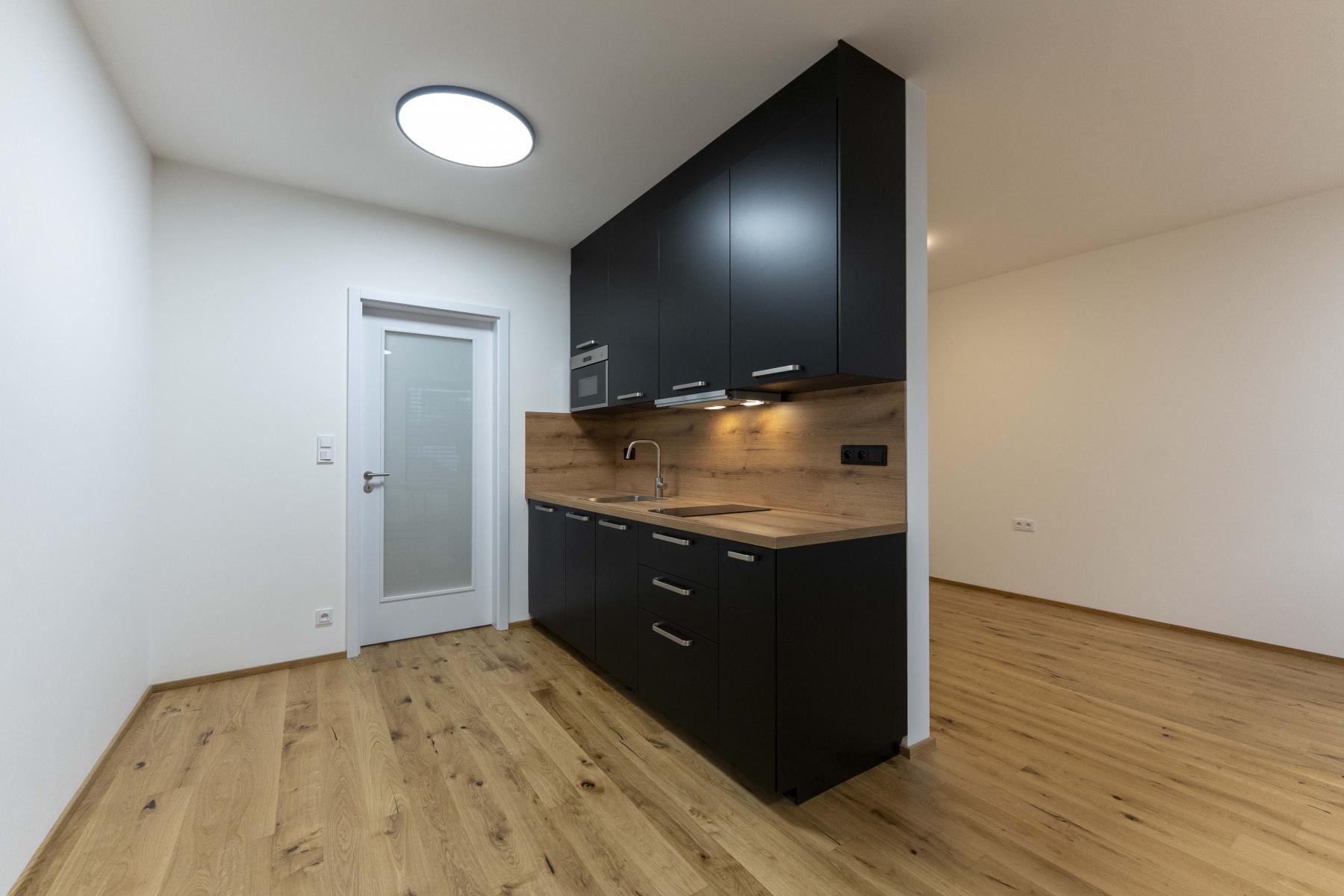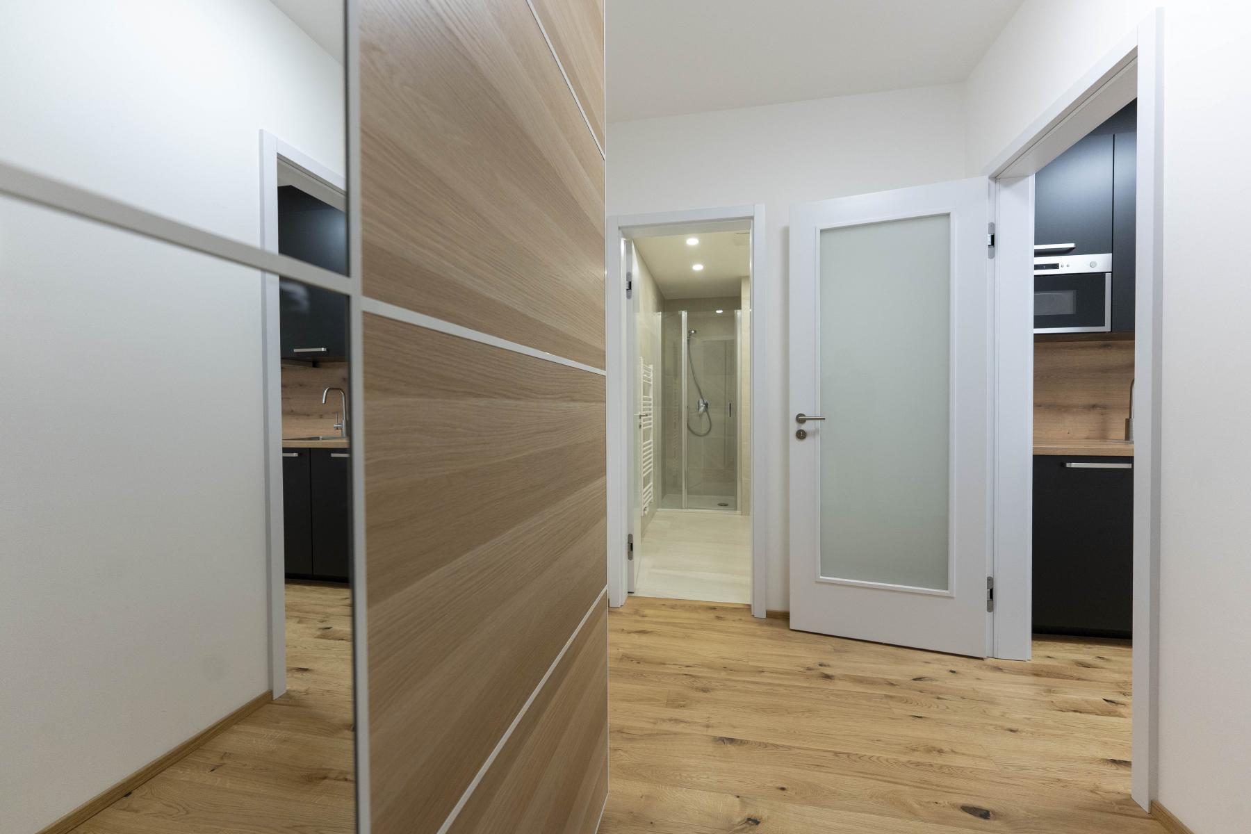 Byt má vstupní chodbu s velkou vestavnou skříní, obývací pokoj s kuchyňskou linkou vybavenou běžnými spotřebiči: keramickou varnou deskou, digestoří, lednicí, myčkou, mikrovlnnou troubou. Z obývacího pokoje můžete vejít na předzahrádku s terasou, která přímo vybízí k posezení od jara do zimy. Koupelna má sprchový kout a toaletu, nalézá se zde dále technická místnost pro uskladnění Vašich věcí. K bytu dále patří suchý, čistý sklep v suterénu domu. Je možno si extra pronajmout garážové parkovací stání.