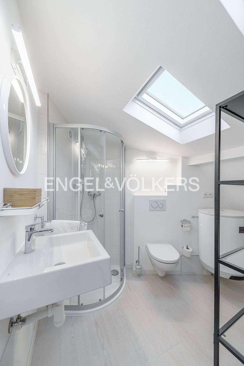 Koupelnová část se sprchovým koutem. V bytě je pro pohodlí nájemce instalována klimatizace, která slouží k chlazení i vytápění. Ohřev vody zajišťuje elektrický bojler.