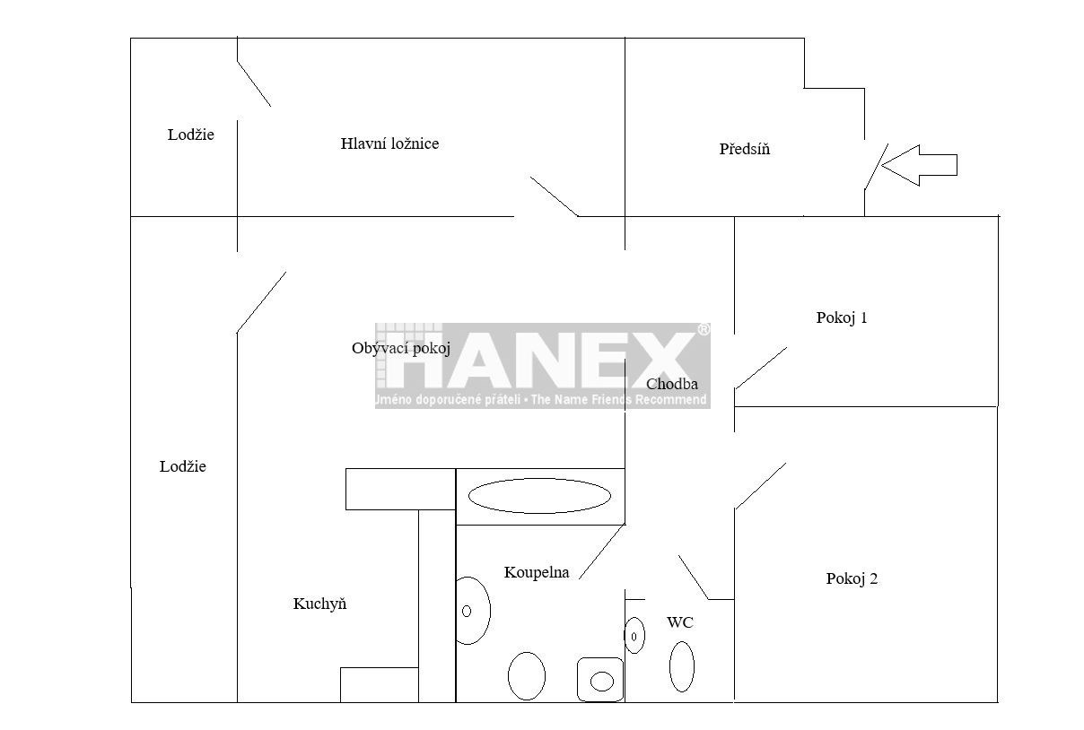 Byt se skládá z prostorné plně vybavené kuchyně, obývacího pokoje, který je opticky oddělen barovým pultem. Dále je zde hlavní ložnice se vstupem na lodžii. Z prostorné chodby, kde je místo pro vestavěné šatní skříně, se vchází do dvou menších pokojů či ložnic. V bytě je samostatná toaleta a koupelna s vanou, druhou toaletou, umyvadlem a pračkou. Veškeré vybavení dle fotografiích zůstává. Sklep k bytu není.