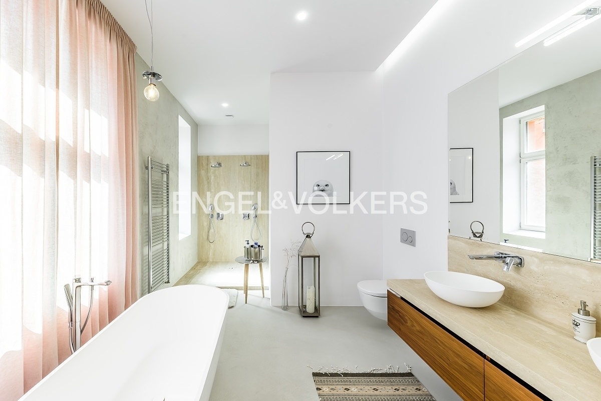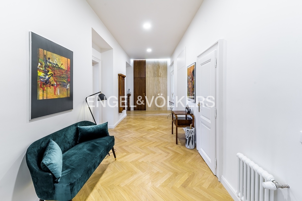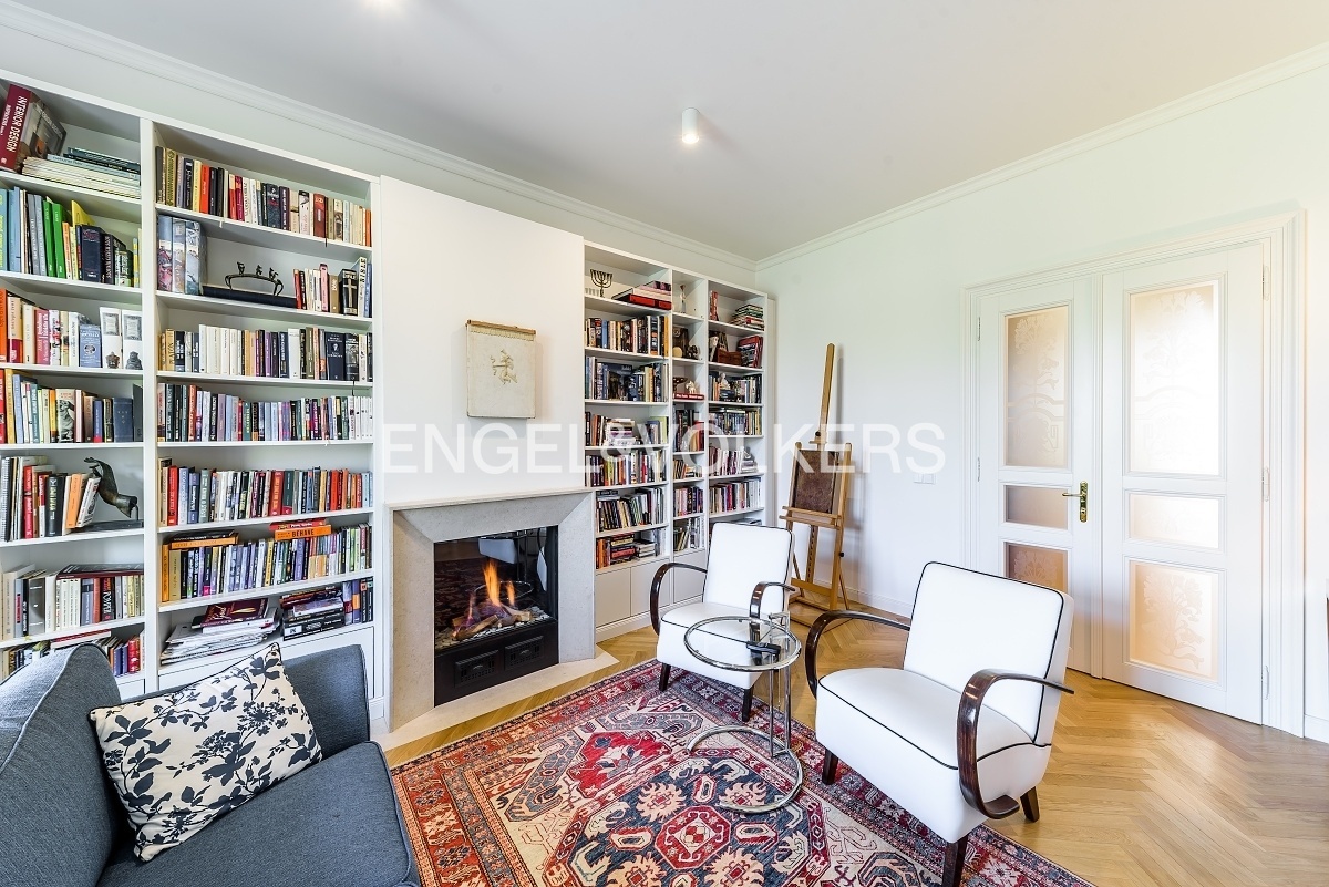 Byt je prošpikovaný luxusními materiály od dubových parket, přes ořechové obklady, mramorem obloženého krbu až po velkoformátové desky přírodního kamene, to vše osvětlují ručně dělaná svítidla.