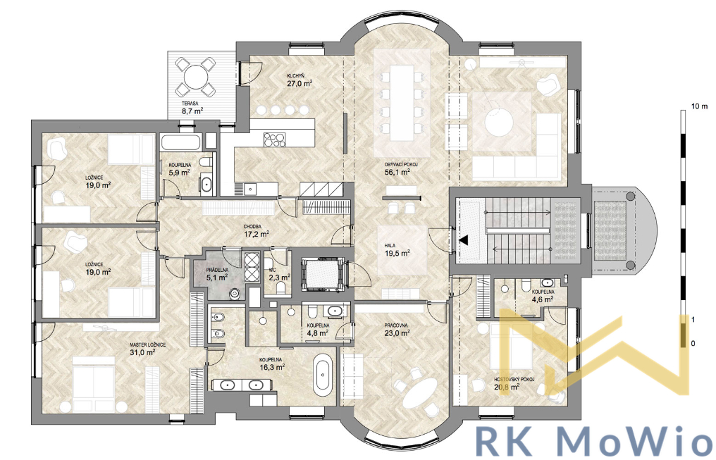 Na pronájem nabízíme částečně zařízený byt o dispozici 6+1 o podlahové ploše 273 m² s terasou o výměře 9 m², situovaný ve 2. patře (3. nadzemní podlaží) nově zrekonstruované prvorepublikové vily s výtahem a kamerovým systémem v rezidenčním komplexu Vila Marna, v ulici Na Marně na Praze 6 - Bubeneč.