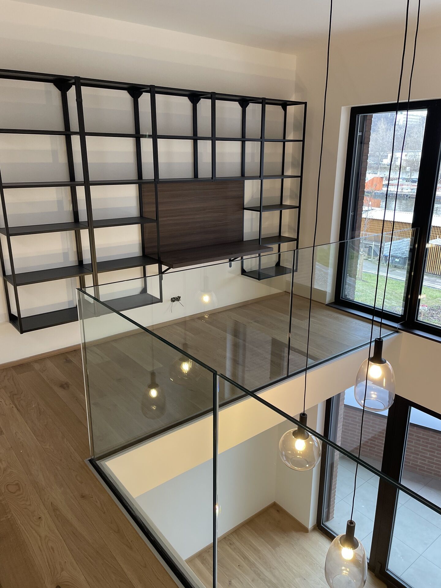 Velkorysý prostor obývacího pokoje přechází schodištěm do otevřeného patra, které zahrnuje prostor ložnice s knihovnou a pracovním koutem. Na tomto patře se nachází sestava vestavných skříní a koupelna.