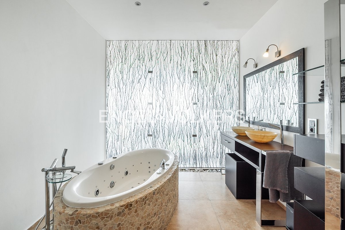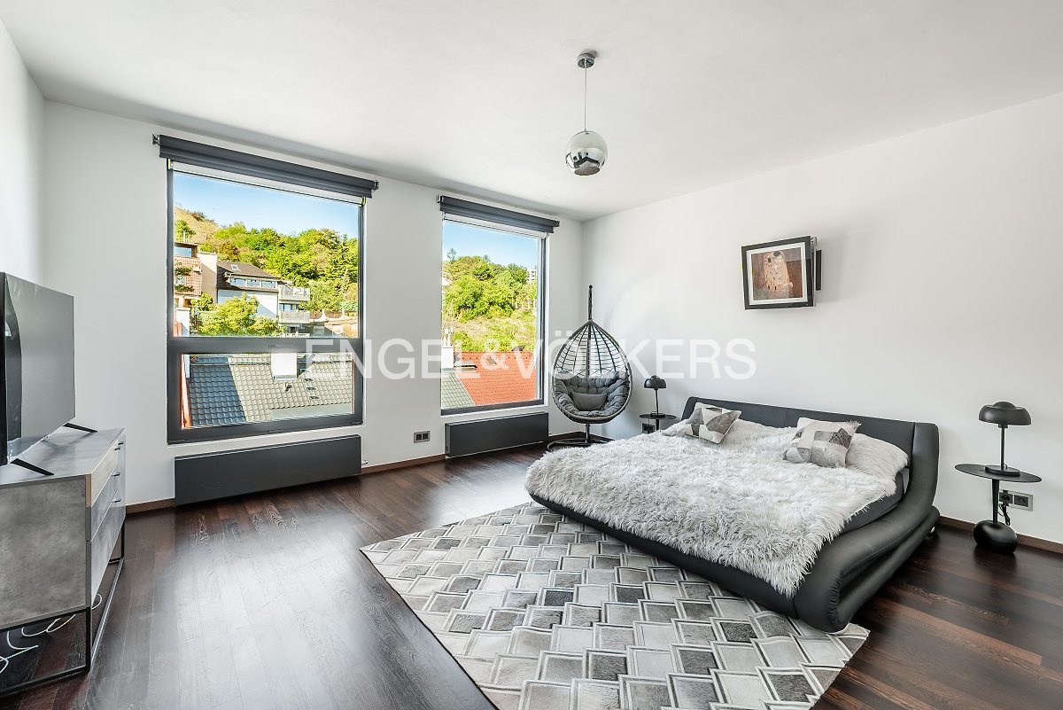 Luxusní materiály a provedení, velkoformátová okna, dřevěné podlahy, bezpečnostní vstupní dveře, vestavěné skříně a úložné prostory, vnitřní elektrické rolety.