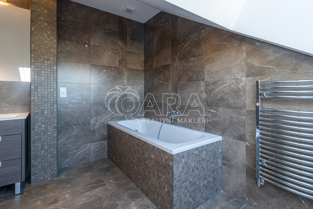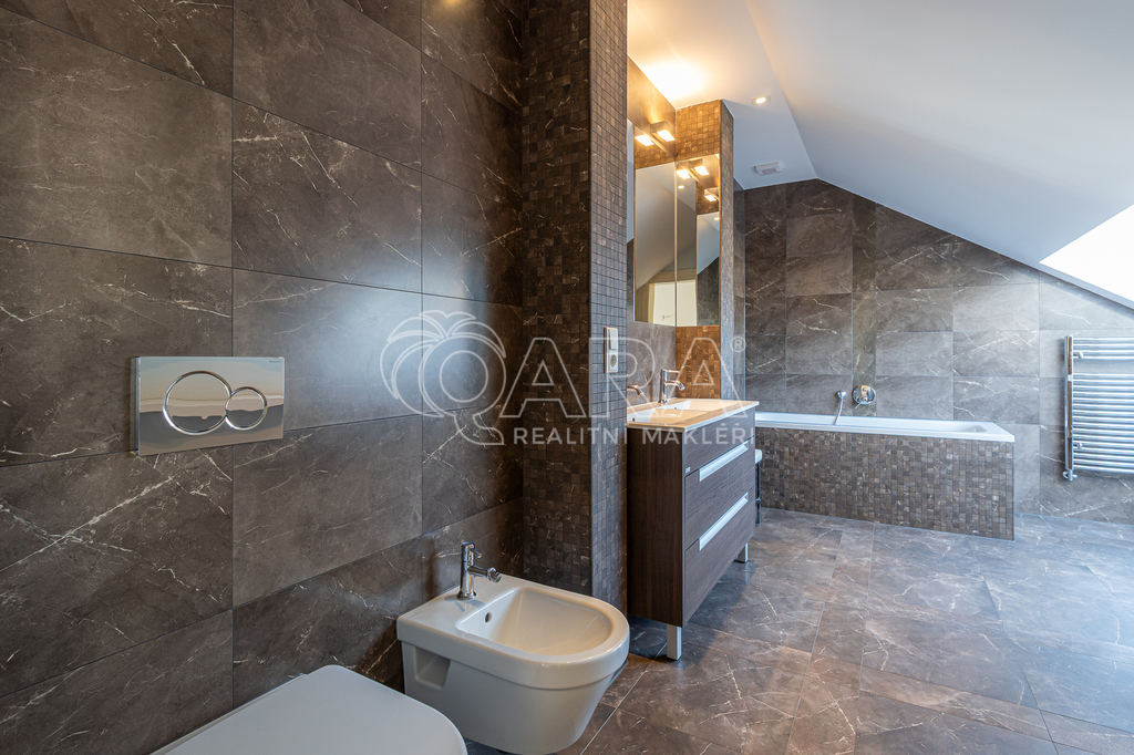 Horní úroveň (podkroví) slouží jako klidová zóna se dvěma ložnicemi a vlastní koupelnou. Ta je nadstandardně vybavena vanou, dvěma umyvadly, bidetem a toaletou, k dispozici je zde i pračka a sušička. Jedna z ložnic disponuje vlastní šatnou, druhá je klimatizovaná a nabízí přímý vstup na terasu (8,9 m²) s výhledem na Pražský hrad a střechy Starého Města. Byt má vlastní vytápění zajištěné plynovým kotlem. Na podlahách jsou dubové parkety, vzhledem k jejich údržbě je byt určen pro nájemce bez domácích mazlíčků.