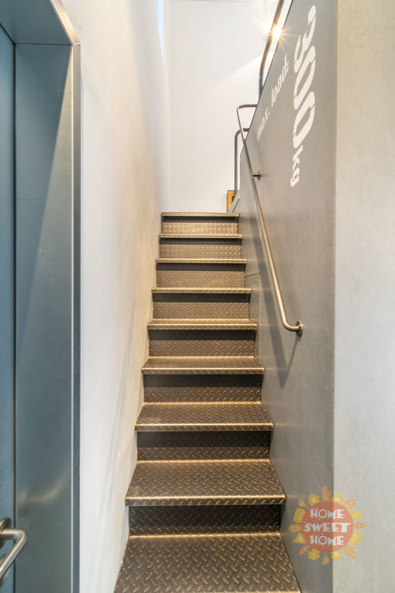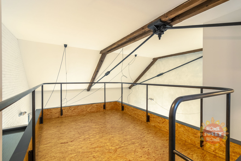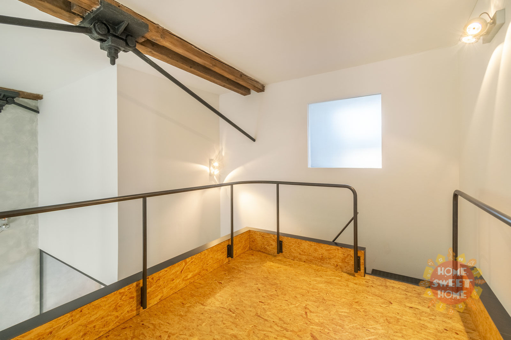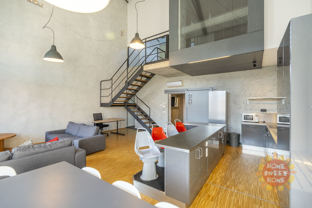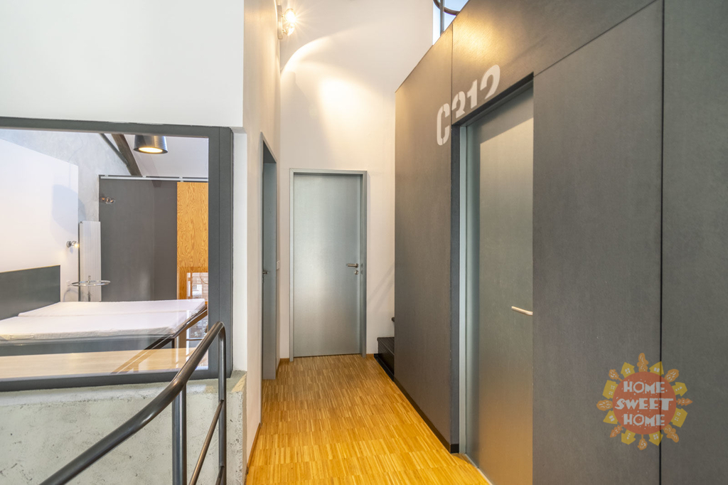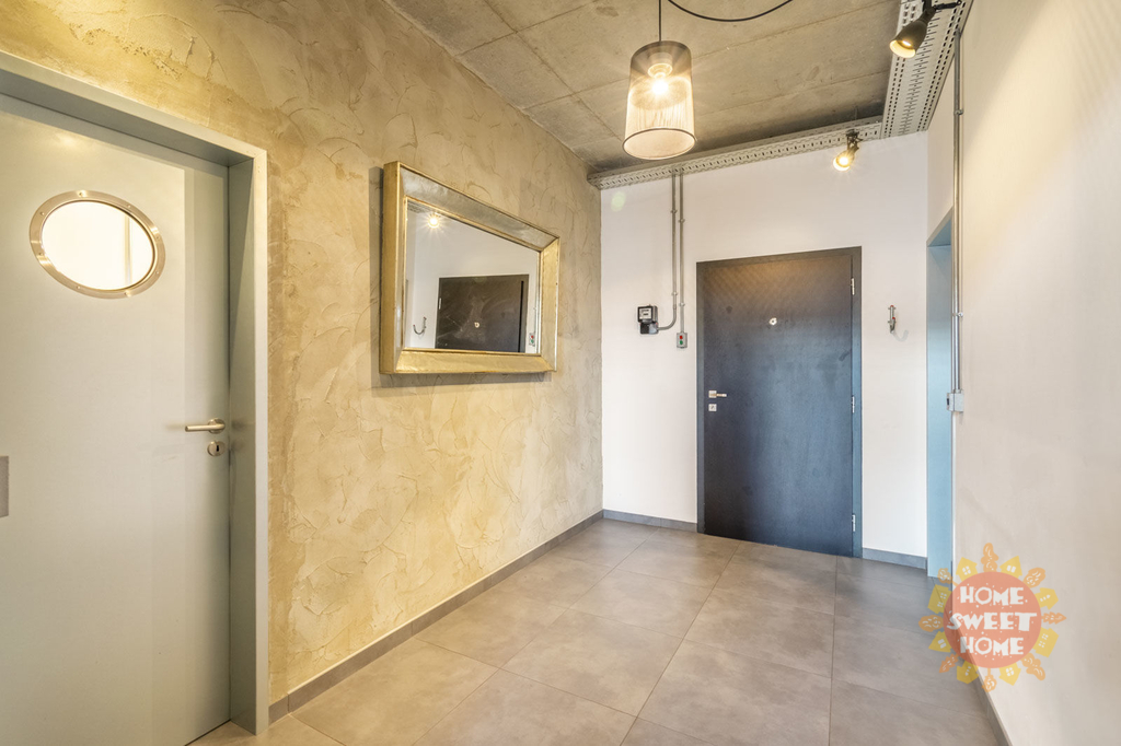 Byt je perfektně architektonicky řešený a jedinečné vnitřní uspořádání kombinuje moderní prvky s industriální stylem (velká vnitřní okna, třístupňové uspořádání s galerií, výška stropu obývacího pokoje 8m, ložnice výška stropu 5m). Je zde klenutý strop, ocelové nosníky a litinové sloupy. Ve spodním patře bytu se nachází vstupní hala, prádelna s pračkou a sušičkou, komora, toaleta, obývací pokoj spojený s kuchyňským koutem, který je plně vybavený vestavěnými spotřebiči (lednice s mrazákem, trouba, sporák, mikrovlnná trouba, myčka). Kuchyňský bar představuje originální pražské tramvaje Tatra T3 z roku 1960. Ve druhém patře se nacházejí dvě ložnice, každá s vlastní šatnou, koupelna s vanou, sprchovým koutem a toaletou. V posledním patře je galerie.