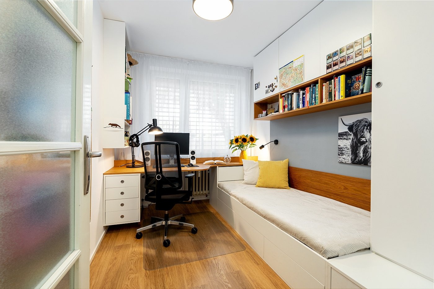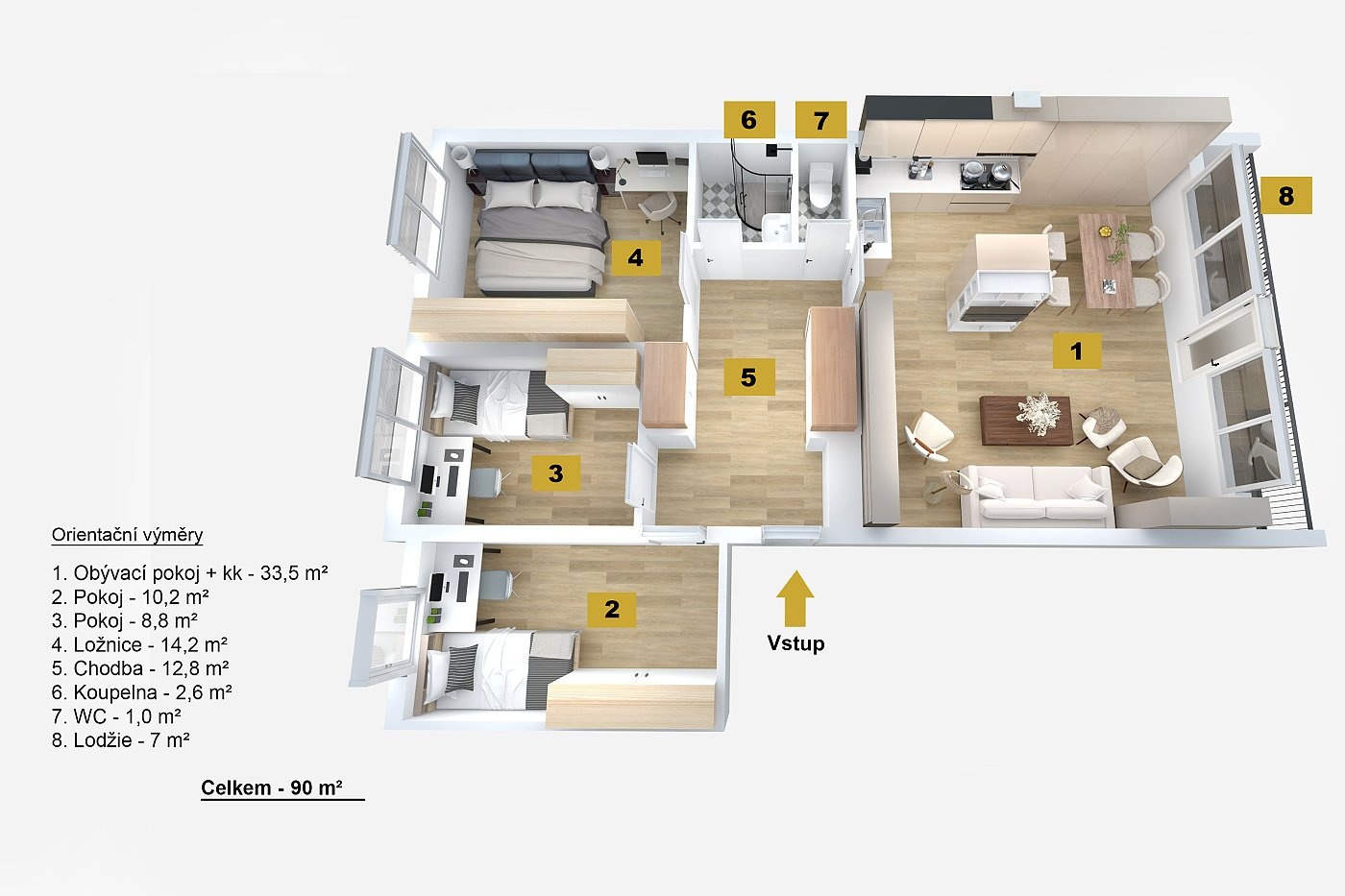 Dominantou bytu je prostorný obývací pokoj s kuchyňským koutem orientovaný na východ, kde vás každý den přivítá přirozené ranní světlo. Ložnice a dva dětské pokoje směřují na západ, což přináší klidnou atmosféru, příjemné odpolední světlo a ideální prostředí pro rodinný život.