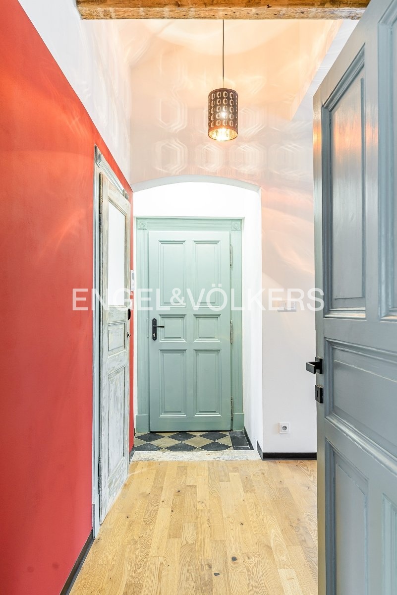 Srdcem bytu je velkorysá obývací místnost s novou kuchyňskou linkou. Tuto místnost lze případně dále rozdělit, čímž může vzniknout pokoj navíc. Dále je v bytě neprůchozí ložnice orientovaná do vnitrobloku, ze které je vstup na balkon, a podkrovní malá pracovna (úložný prostor) přístupná skrze schůdky. Dispozice nabízí dále koupelnu se sprchovým koutem a předsíň. Byt má vysoké stropy, přiznané trámy, zachovalé interiérové dveře, původní repasované či nové parkety a nová dřevěná izolační okna.