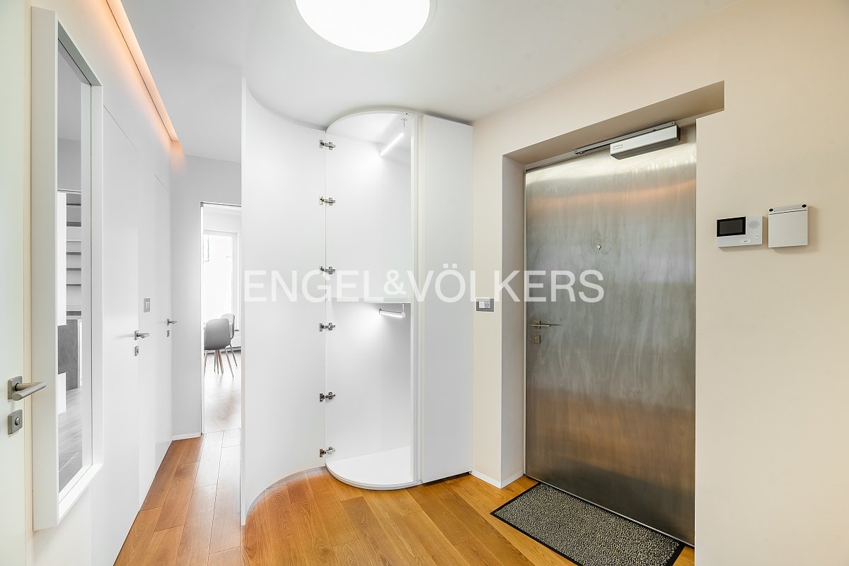 Vybavení bytu zahrnuje vestavěný nábytek a úložné prostory na míru, dubové podlahy, designové osvětlení, screenové rolety, podlahové vytápění, klimatizaci a ekologický krb. Koupelny jsou vybaveny sprchovými kouty, LED zrcadly a kvalitními bateriemi značky Gessi.