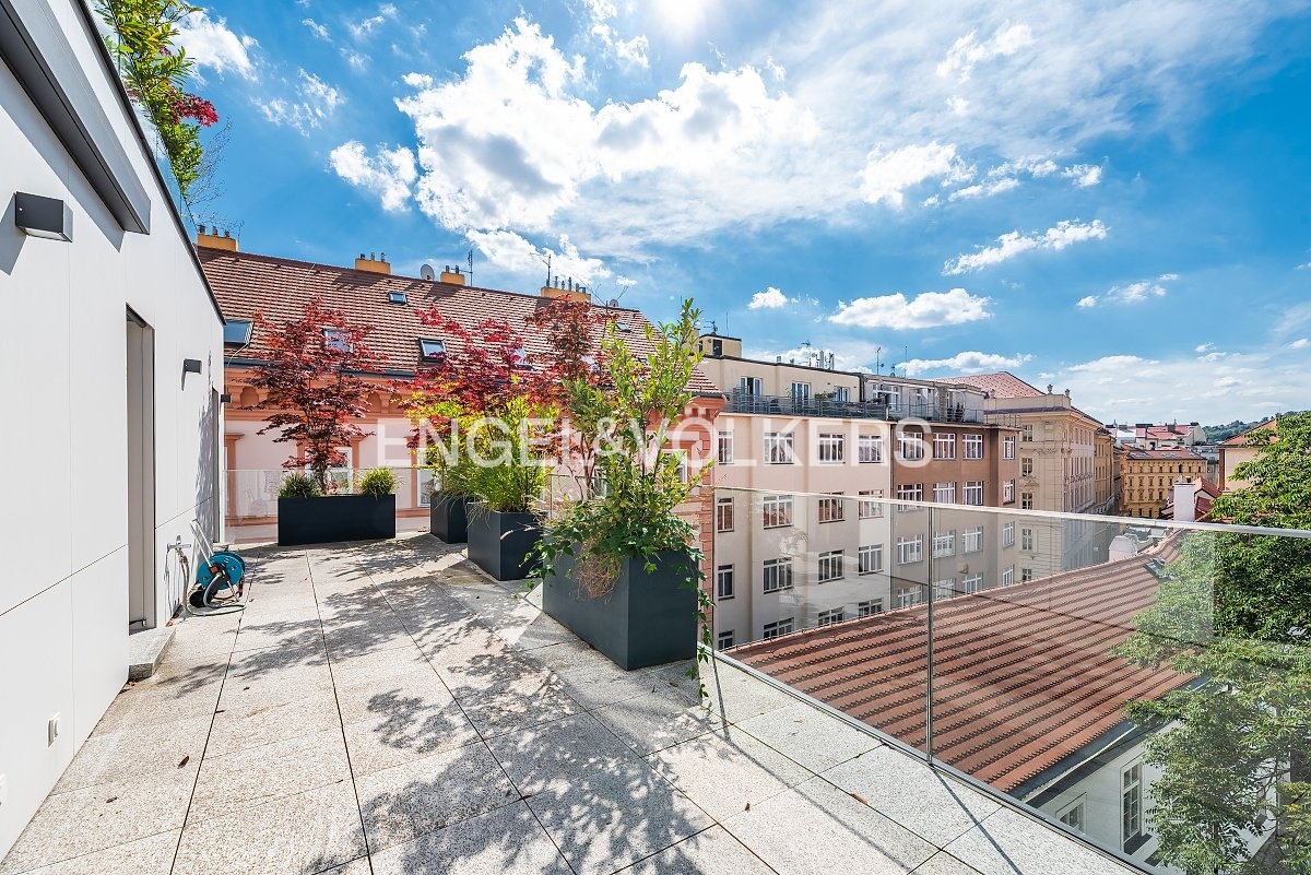 Terasy obklopují byt po obvodu obou podlaží a poskytují dostatek prostoru pro posezení i zeleň. Jsou osázeny velkokapacitními truhlíky se zavlažováním a část je zastřešena klimatickou pergolou. Odtud se otevírají výhledy na pražské střechy, historické věže a také na Národní divadlo.