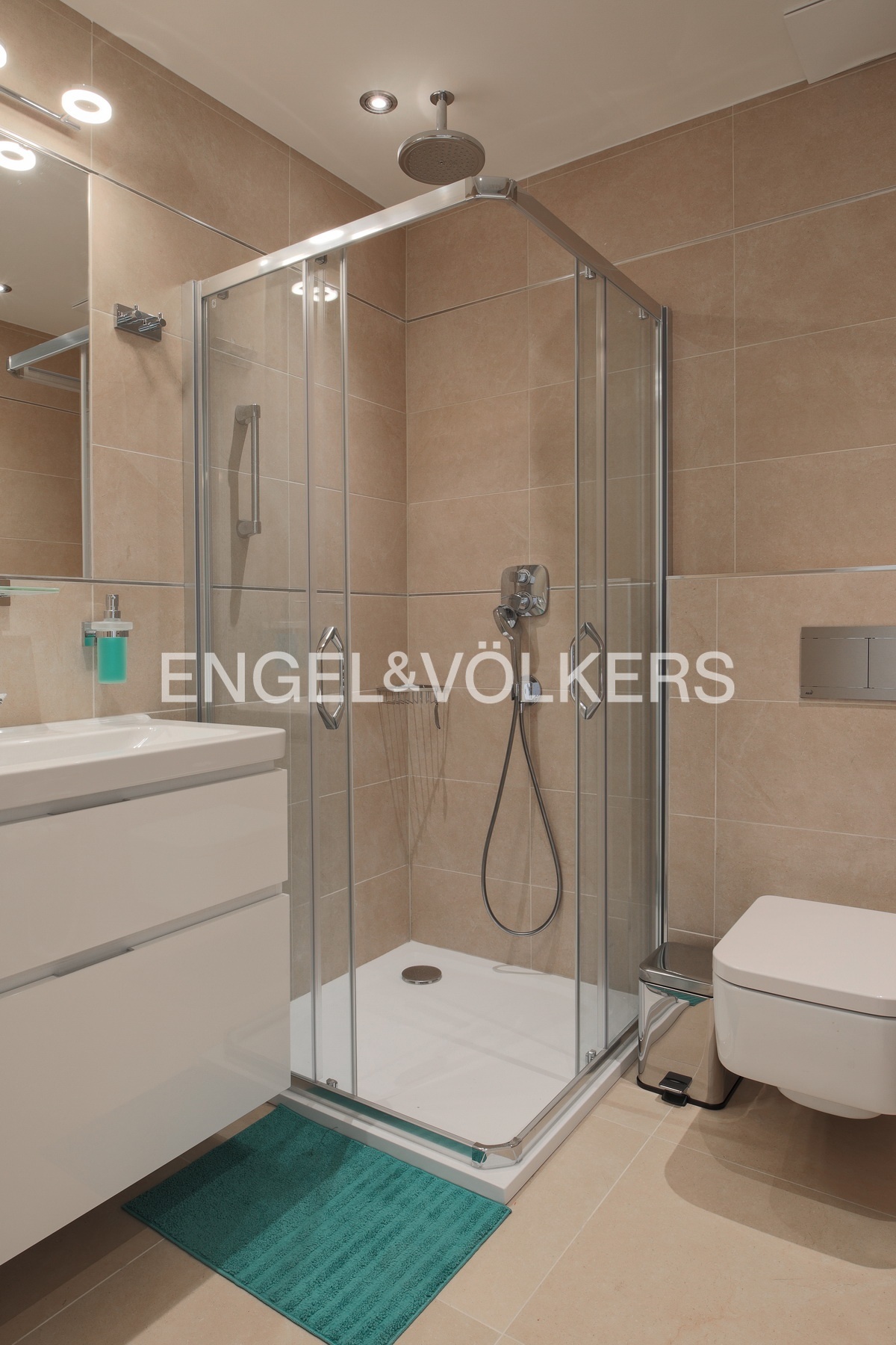 V bytě jsou dvě koupelny s vyhřívanými podlahami, jedna s vanou, druhá se sprchovým koutem.