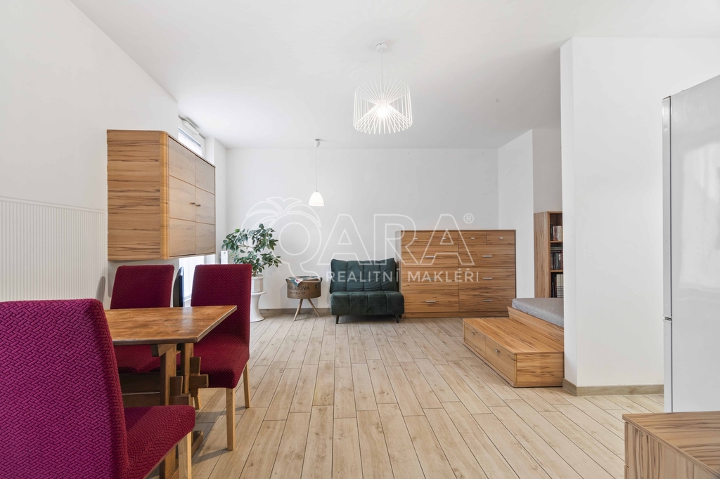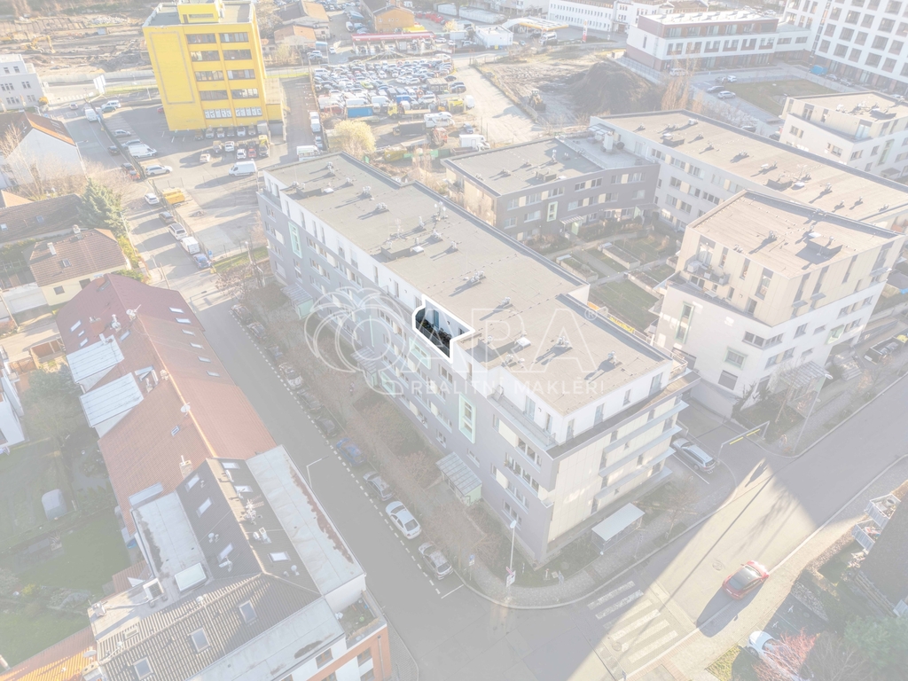Byt o dispozici 1+kk má vnitřní plochu 38,7 m2 a nachází se v 5. nadzemním podlaží. Největším tahákem je bezesporu velkorysá terasa o výměře 12,1 m2, která díky vyššímu patru nabízí skvělý výhled do okolí a dostatek prostoru pro venkovní posezení nebo relaxaci.