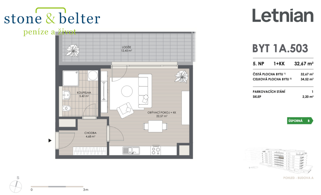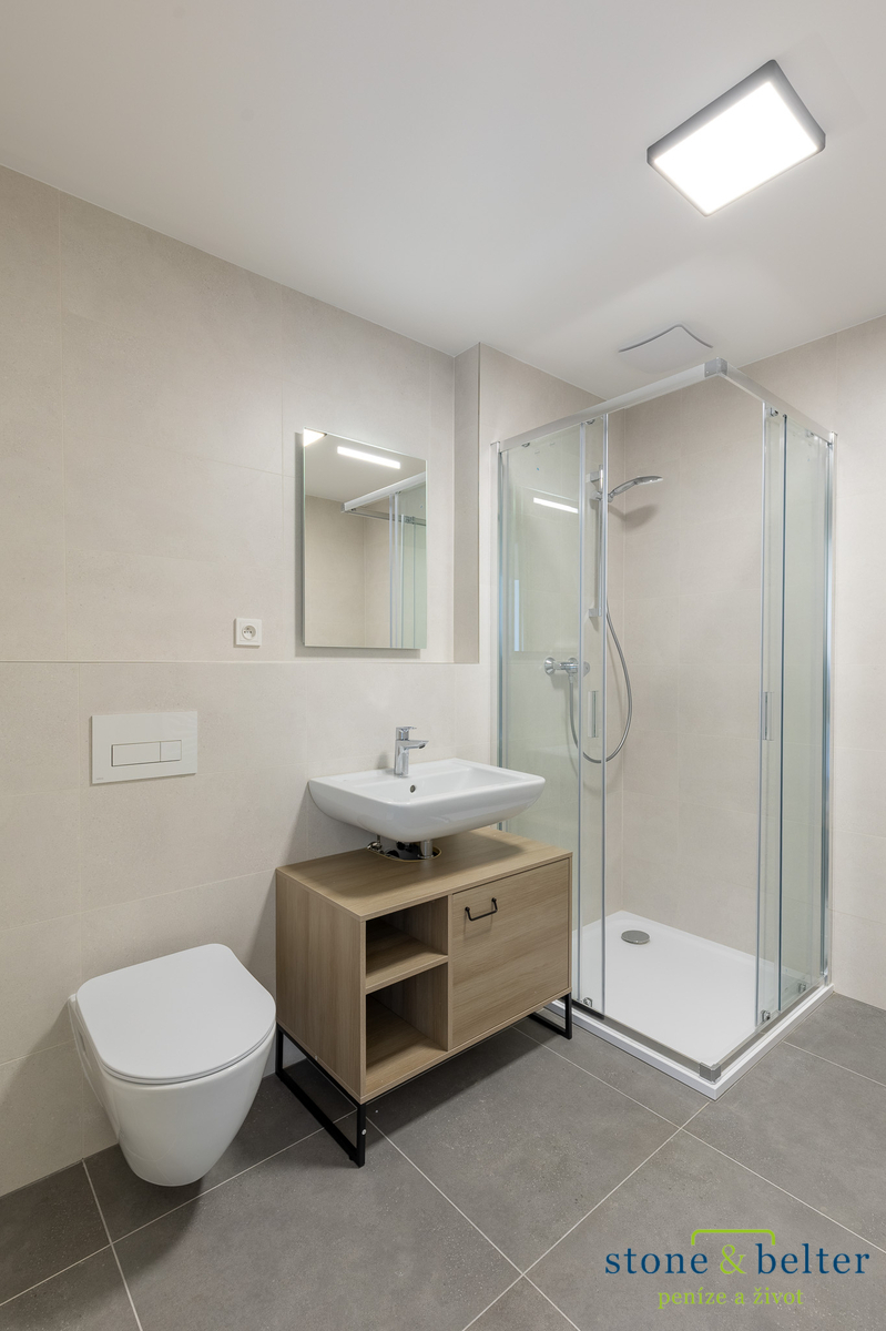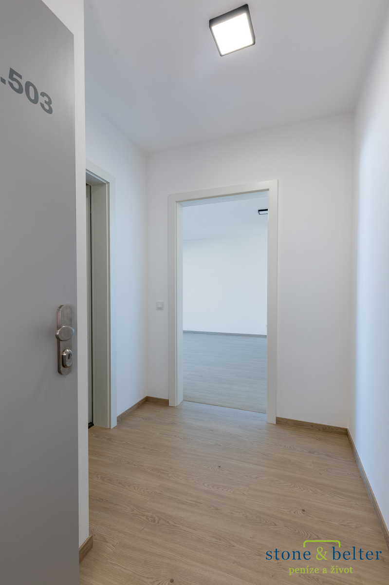 Byt zaujme světlým a vzdušným interiérem, prostornou vstupní chodbou, velkoryse řešenou koupelnou a příjemným propojením obytné části s venkovním prostorem. Hlavní obytná místnost je propojena s lodžií o velikosti cca 12,5 m² prostřednictvím velkoformátového proskleného portálu, který zajišťuje dostatek denního světla a příjemnou atmosféru.