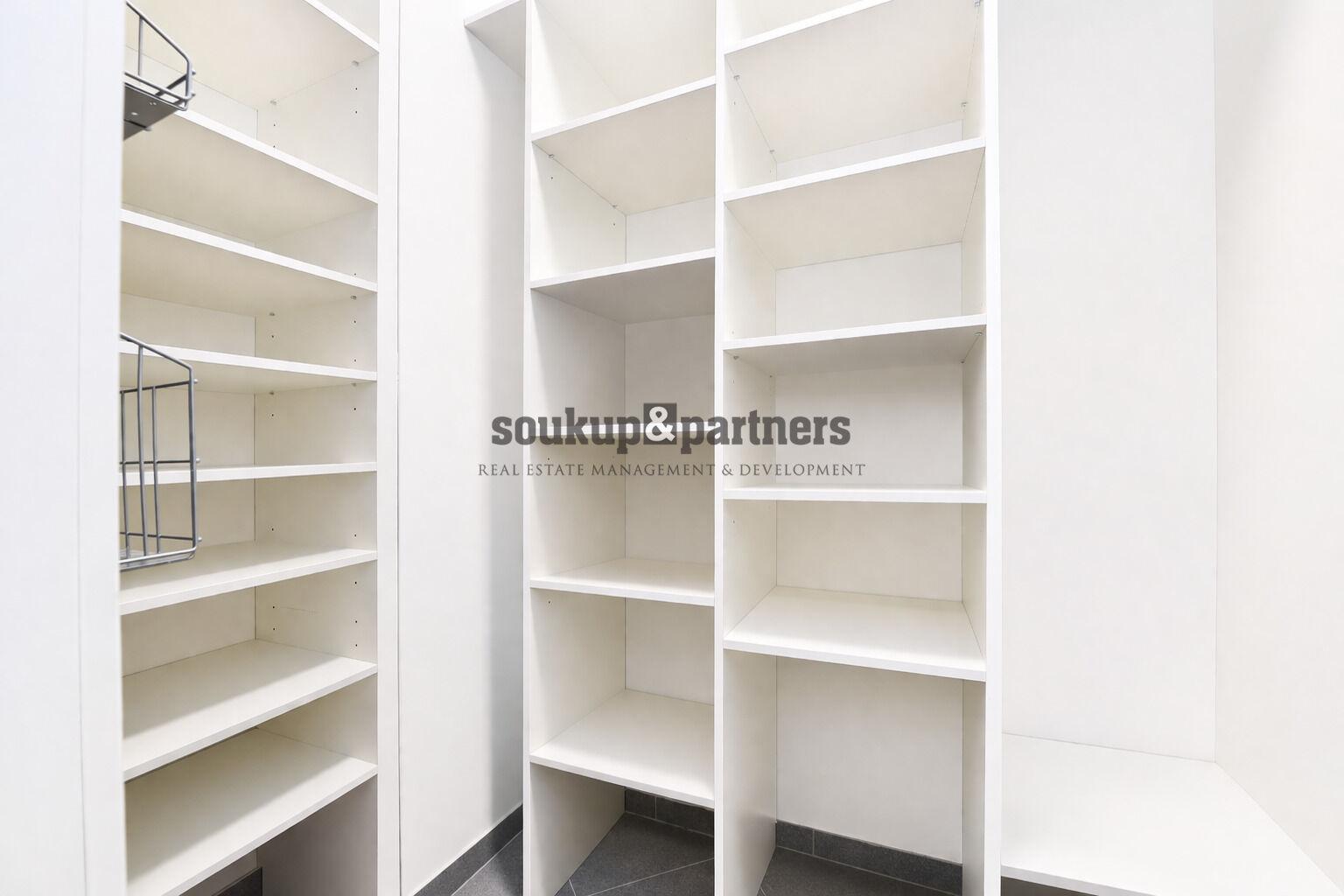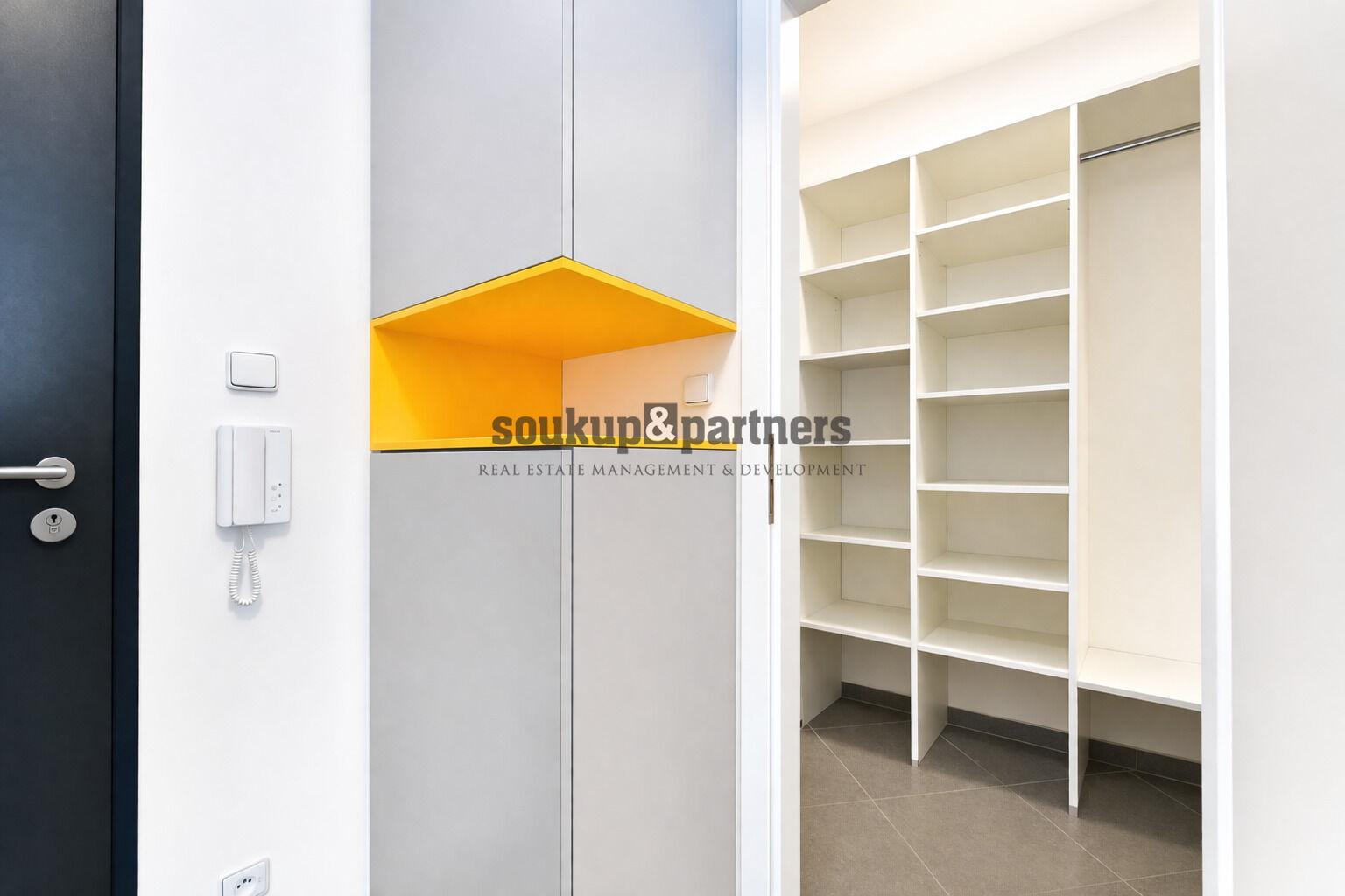 Interiér bytu je vybaven kvalitním moderním nábytkem a nabízí praktické dispoziční řešení včetně velké šatny s vestavěným nábytkem. Kuchyňská linka je plně vybavena spotřebiči – indukční varná deska, elektrická trouba, myčka nádobí, digestoř a kombinovanou lednicí.