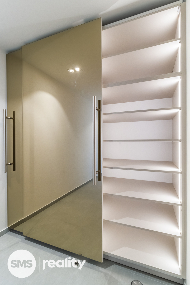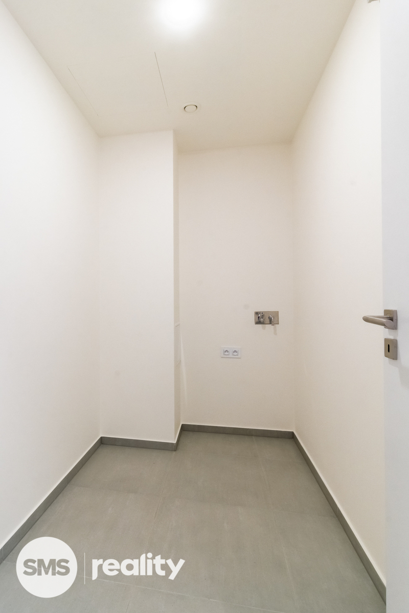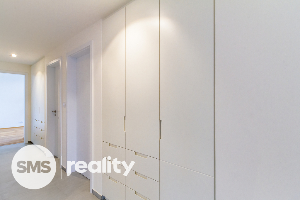 Moderní byt tvoří velkorysý obývací pokoj (52 m2) s kompletně zařízenou kuchyní na míru a vstupem na krytou terasu, hlavní ložnice s balkonem a vlastní koupelnou s toaletou, 2 samostatné pokoje, druhá koupelna s toaletou a vanou, samostatná toaleta a komora v bytě. Úložný prostor je řešen vestavěnými skříněmi v chodbě, vstupním prostoru a ložnici. V suterénu je k dispozici sklep o (6 m2). Velkoformátová okna a dlažba, dřevěné podlahy, bezpečnostní vstupní dveře.