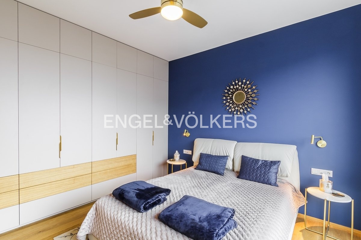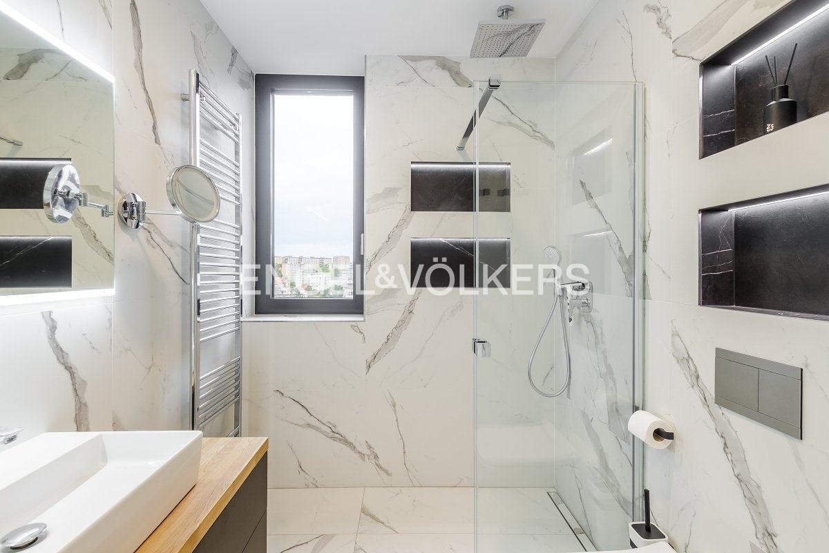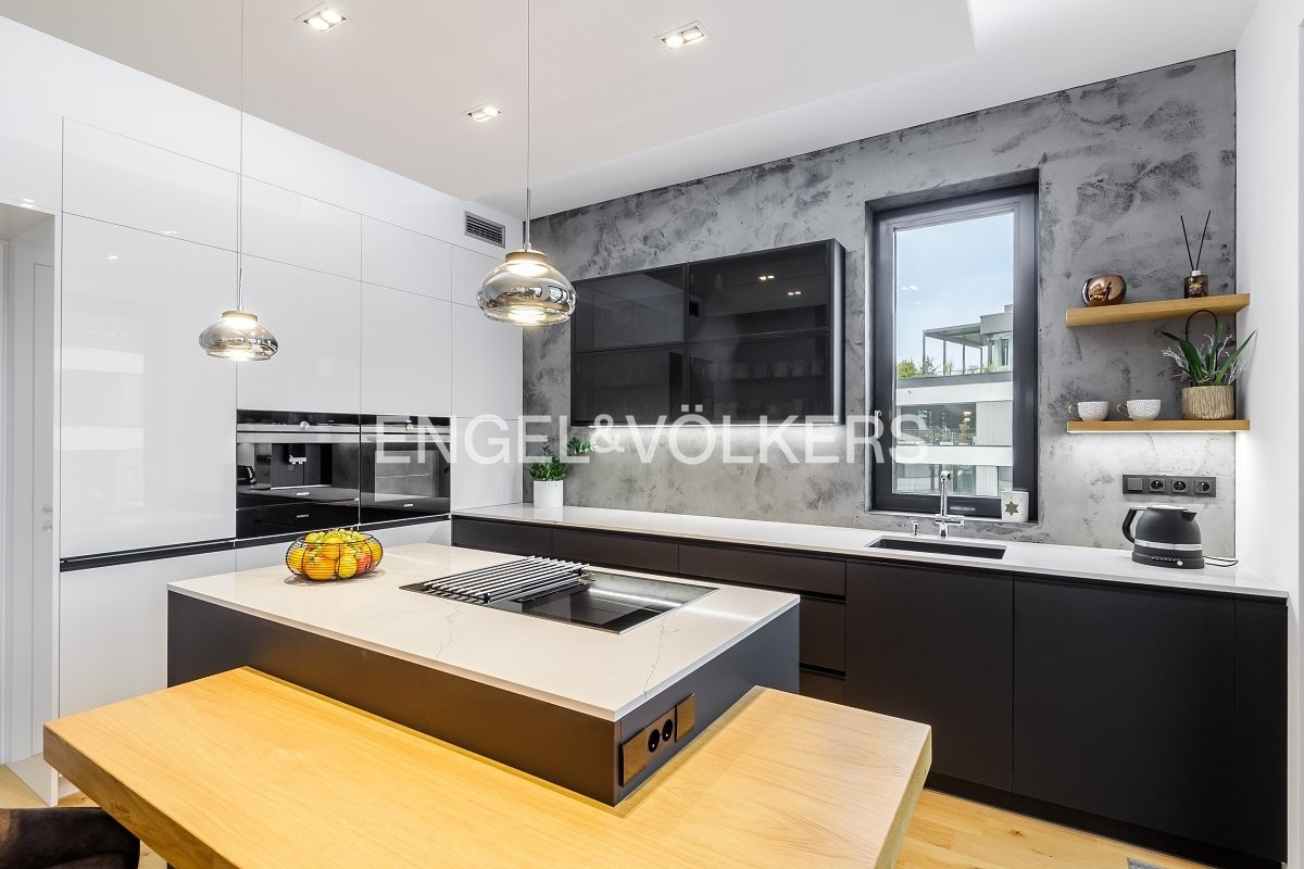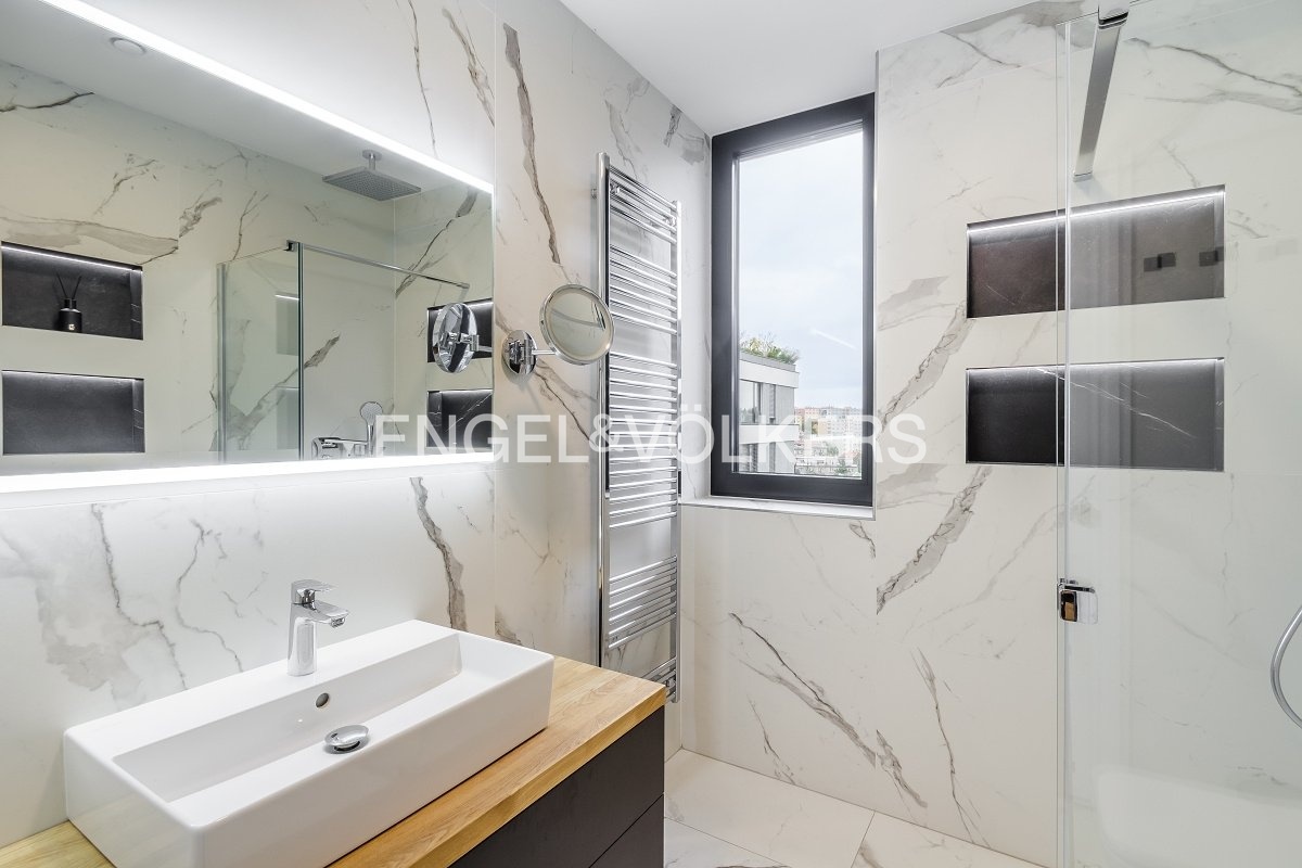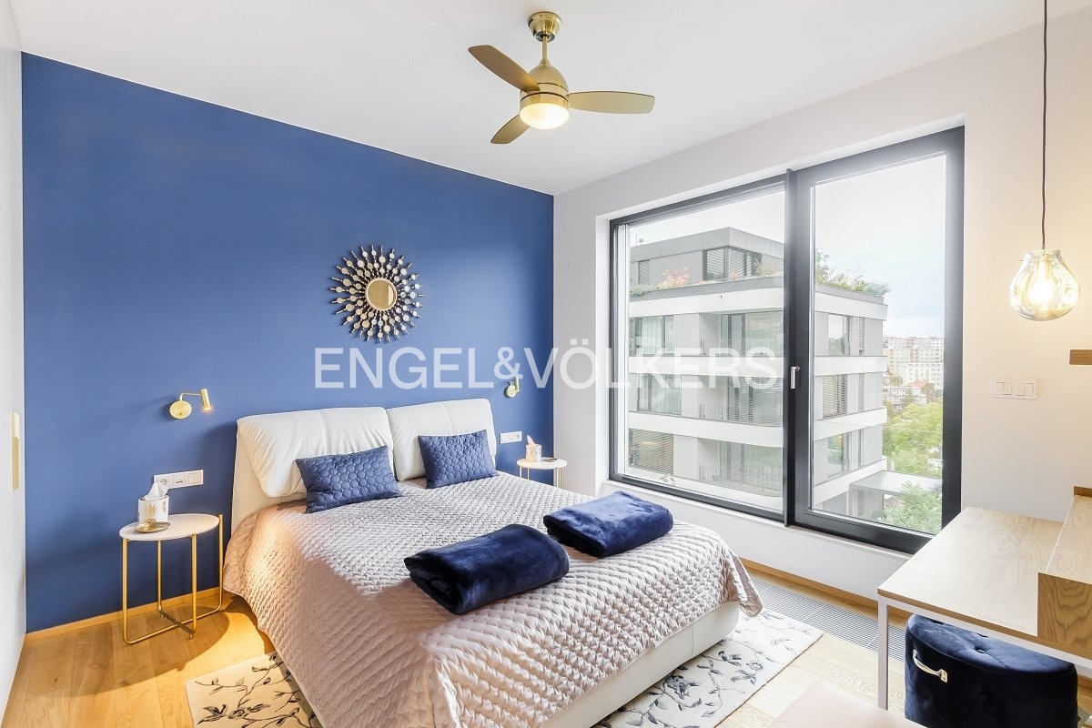Interiér je laděn do světlých harmonických tónů a vybaven designovým nábytkem na míru. V bytě je instalován systém rekuperace vzduchu, který zajišťuje neustálý přísun čerstvého vzduchu a zdravé vnitřní prostředí po celý rok.