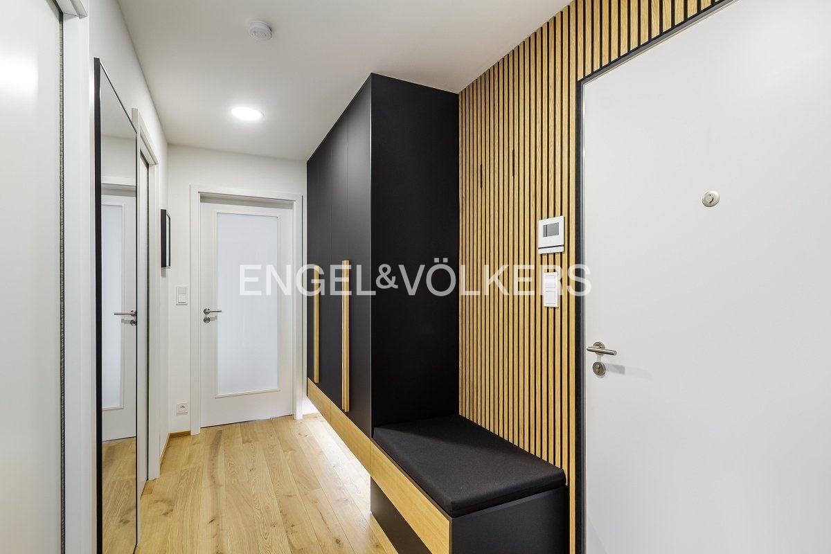 Byt poskytuje klidné a komfortní bydlení s důrazem na elegantní design a funkčnost. Jeho dispozici tvoří prostorný obývací pokoj propojený s moderní kuchyňskou linkou vybavenou vysoce kvalitními vestavěnými spotřebiči a přístupem na balkon, dále ložnice s dostatečnými úložnými prostory, koupelna se sprchovým koutem, praktická komora s pračkou, sušičkou a vestavěným úložným systémem a vstupní hala s vestavěnou skříní.