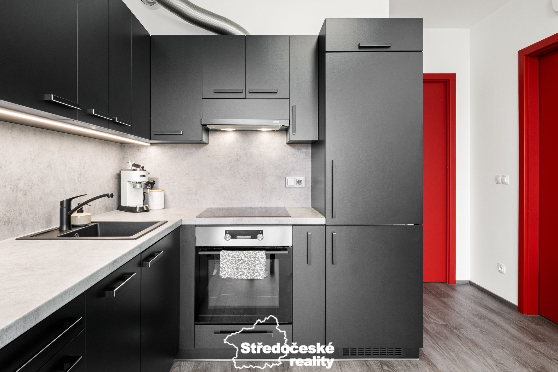 - moderní kuchyňská linka se spotřebiči (myčka, vestavěná lednice, indukční deska, trouba)