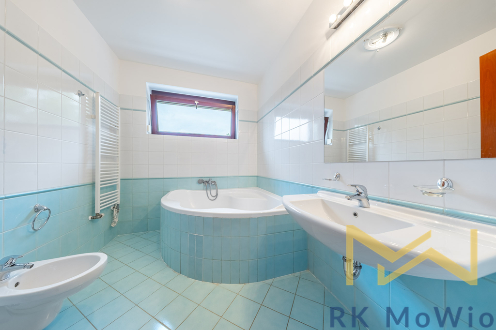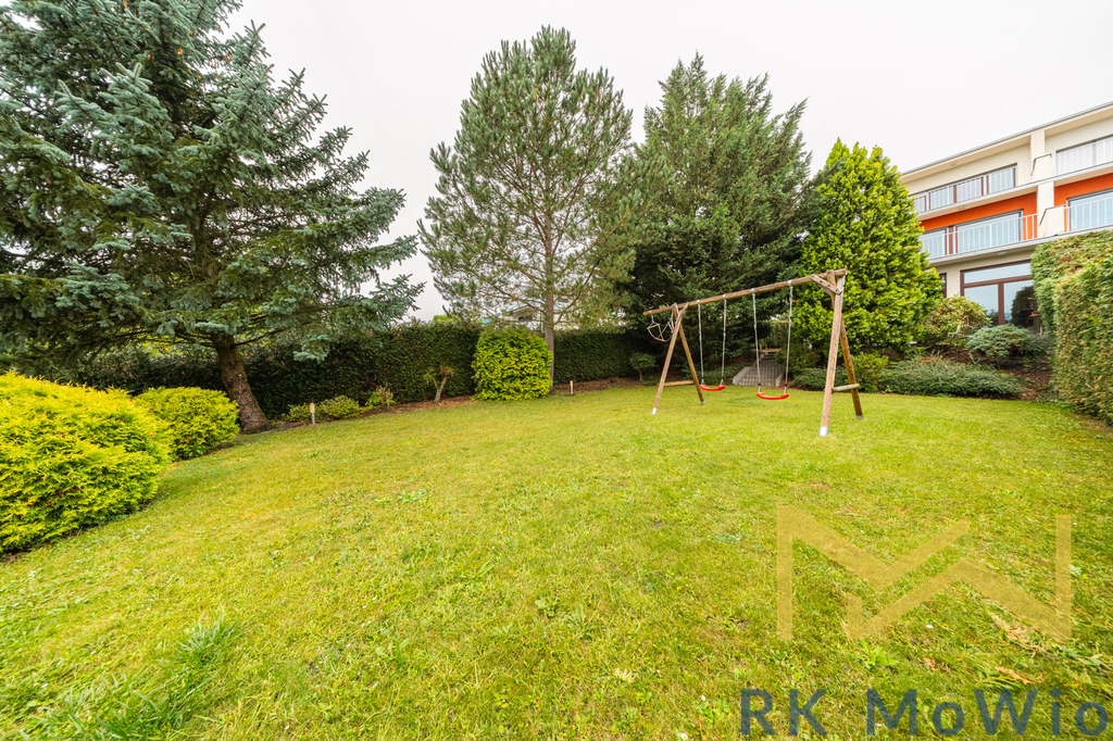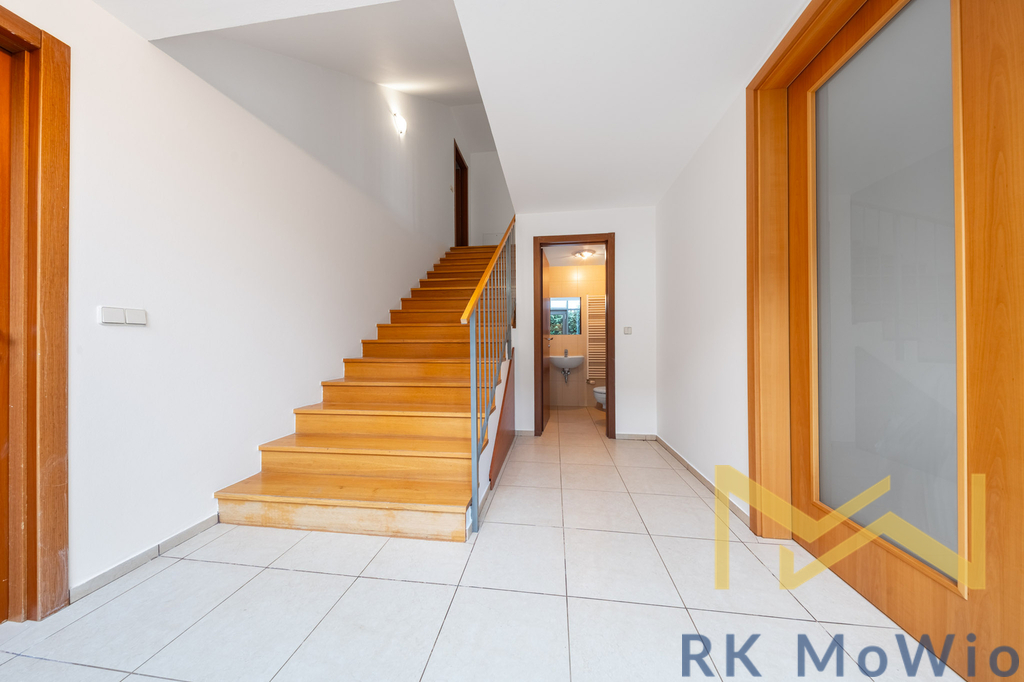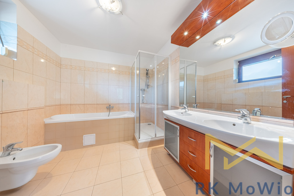 Půdorys domu v přízemí tvoří vstupní hala, prostorný obývací pokoj se vstupem na terasu a zahradu, kuchyňský kout a jídelní prostor, špaiz, toaleta pro hosty, 2 sklady a přímý vstup do garáže. V 1. patře naleznete halu, hlavní ložnici se šatnou a vlastní koupelnou (s vanou, sprchou, dvěma umyvadly, bidetem a toaletou), 2 ložnice (každá se soukromou koupelnou a vstupem na terasu) a šatnu. 2. patro disponuje halou a multifunkční místností se vstupem na terasu, 1 koupelnou (s rohovou vanou, umyvadlem. bidetem a toaletou) a prádelnou. Vybavení domu: moderní kuchyňská linka (včetně lednice s mrazákem, sklokeramické varné desky, digestoře, myčky, elektrické a mikrovlnné trouby), vestavěné skříně, přípojka pro pračku a sušičku, příprava pro vysokorychlostní internet, dřevěné podlahy a dlažba. Výhodou nemovitosti je garáž pro 2 vozidla. Fotografie jsou z druhé poloviny dvoj domu.