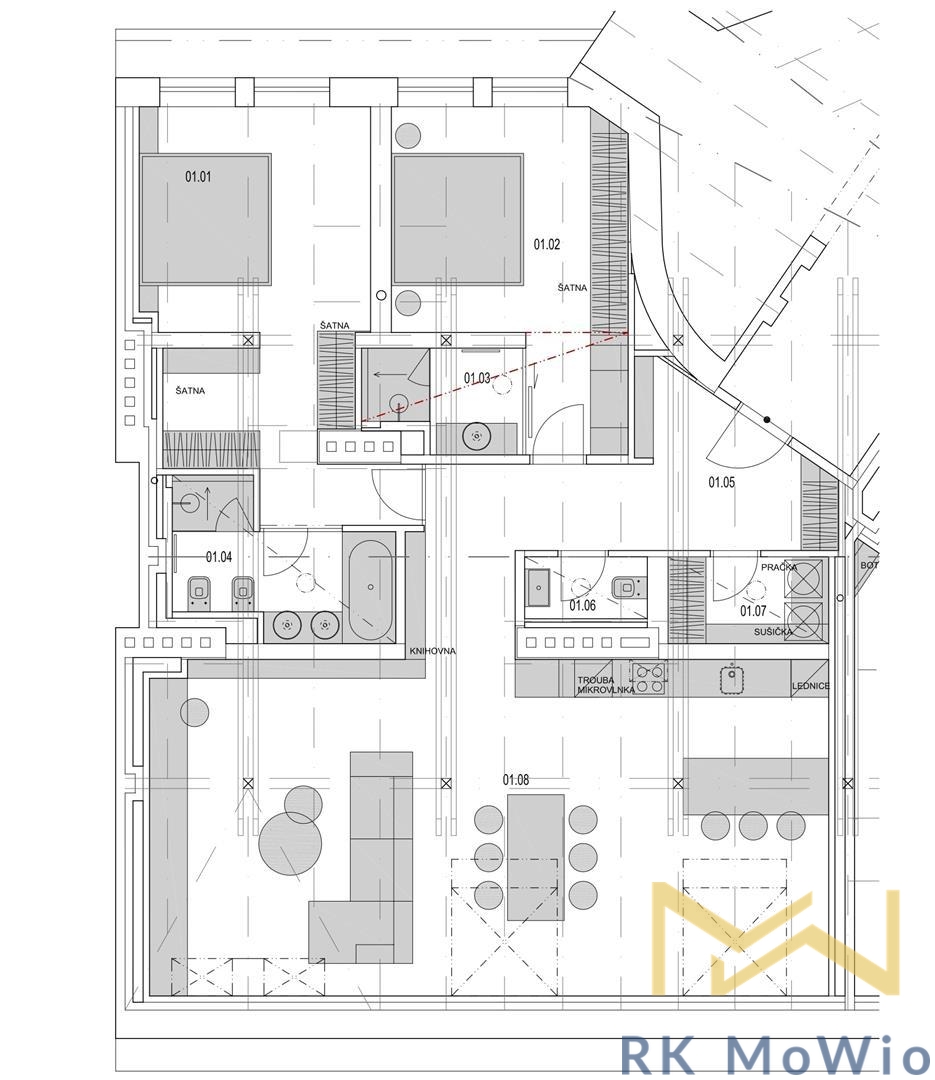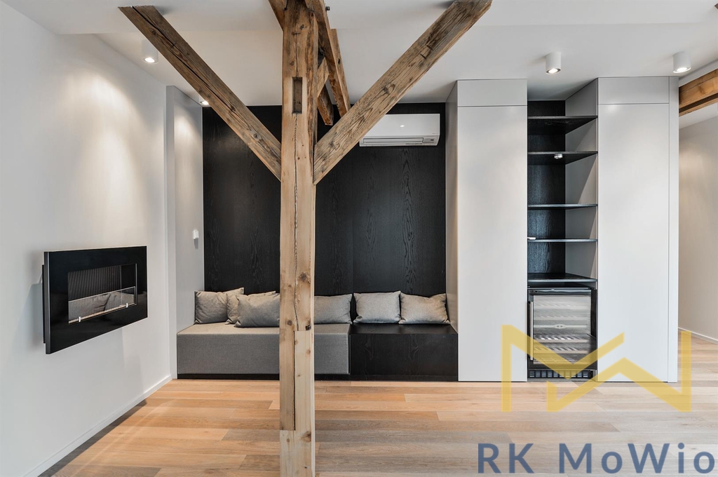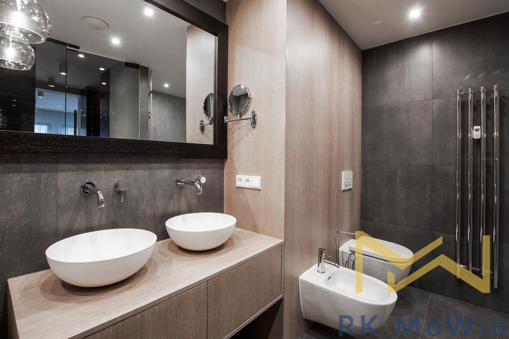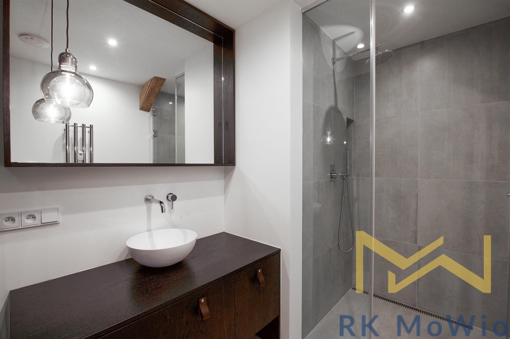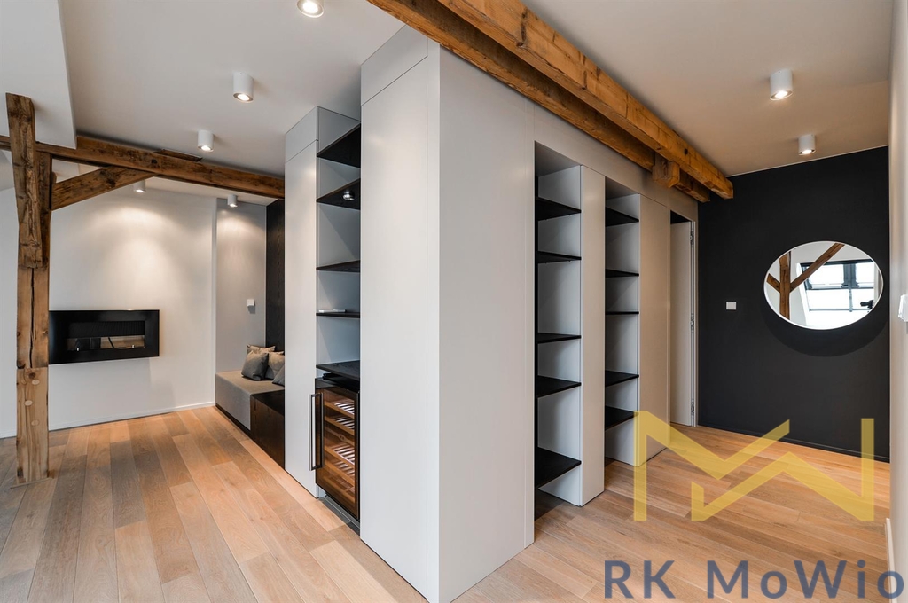 Půdorys bytové jednotky nabízí vstupní halu, světlý obývací pokoj se střešními okny a dřevěnými trámy, kuchyňský kout s ostrůvkem a jídelní částí, hlavní ložnici s průchozí šatnou a vlastní koupelnou (s vanou, sprchou, dvěma umyvadly, bidetem a toaletou), druhou ložnici s privátní koupelnou (se sprchou a umyvadlem), toaletu pro hosty a komoru/prádelnu. Další vybavení bytu: kuchyňská linka včetně lednice s mrazákem, sklokeramické varné desky, zabudované elektrické a mikrovlnné trouby; vestavěné skříně, pračka a sušička, klimatizace, vinotéka, dřevěné dubové podlahy, dlažba, nová okna s izolačním dvojsklem. K bytu je nutno pronajmout 1 parkovací stání za příplatek 6.500,- Kč/měsíc + DPH 21% = 7.865,- Kč/měsíc. Za zvýšené nájemné možno zařídit.