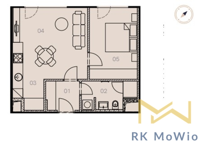 Půdorys bytové jednotky disponuje vstupní halou, obývacím pokojem s kuchyňským koutem a jídelním prostorem, 1 ložnicí, 1 koupelnou (s vanou/sprchou, umyvadlem a toaletou). Vybavení bytu: kuchyňská linka (včetně lednice s mrazákem, sklokeramické varné desky, digestoře, myčky a elektrické trouby), vestavěné skříně, příprava pro vysokorychlostní internet, dřevěné podlahy a dlažba. Možnost pronajmout parkovací stání a sklep za extra příplatek. Fotky jsou ilustrativní.