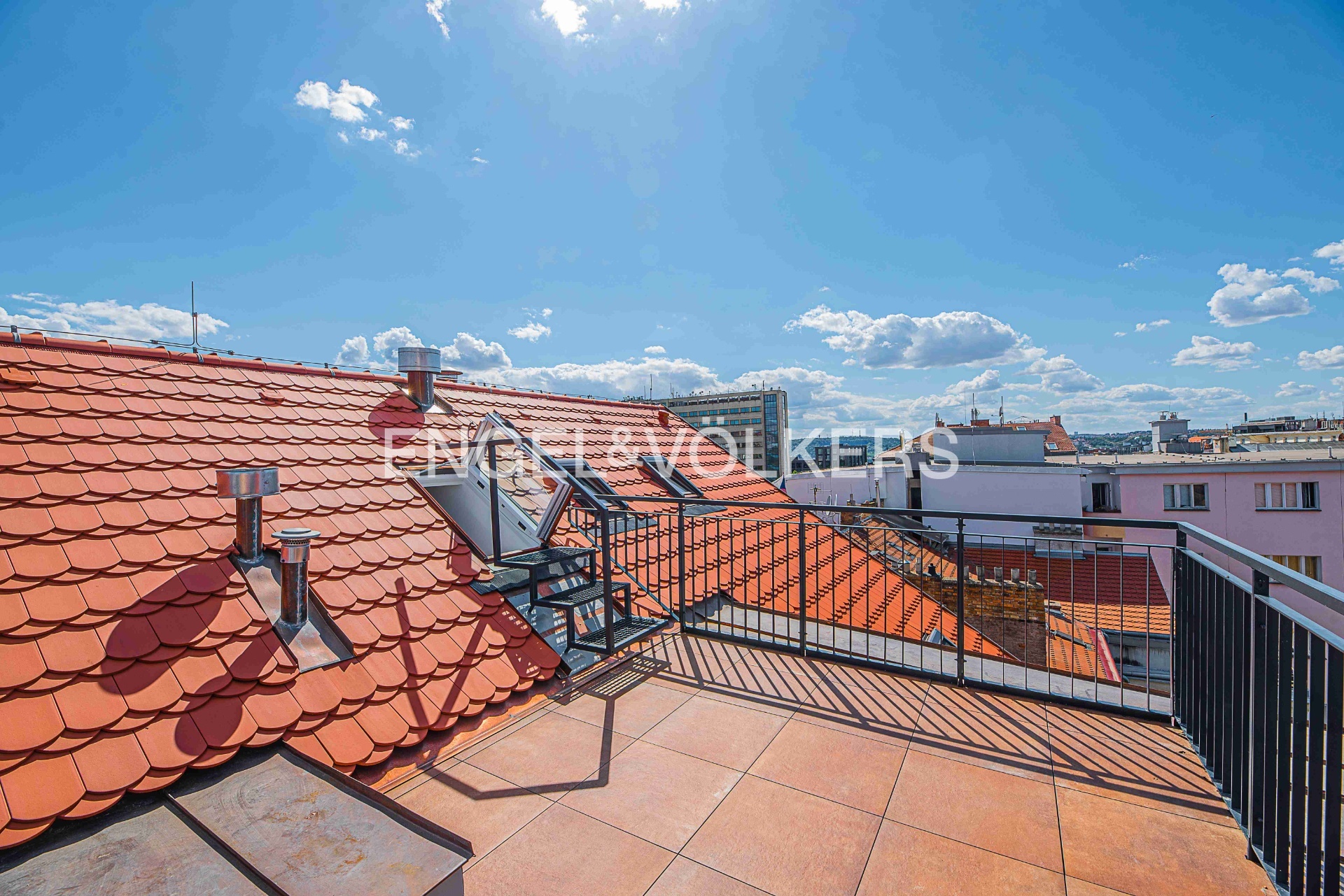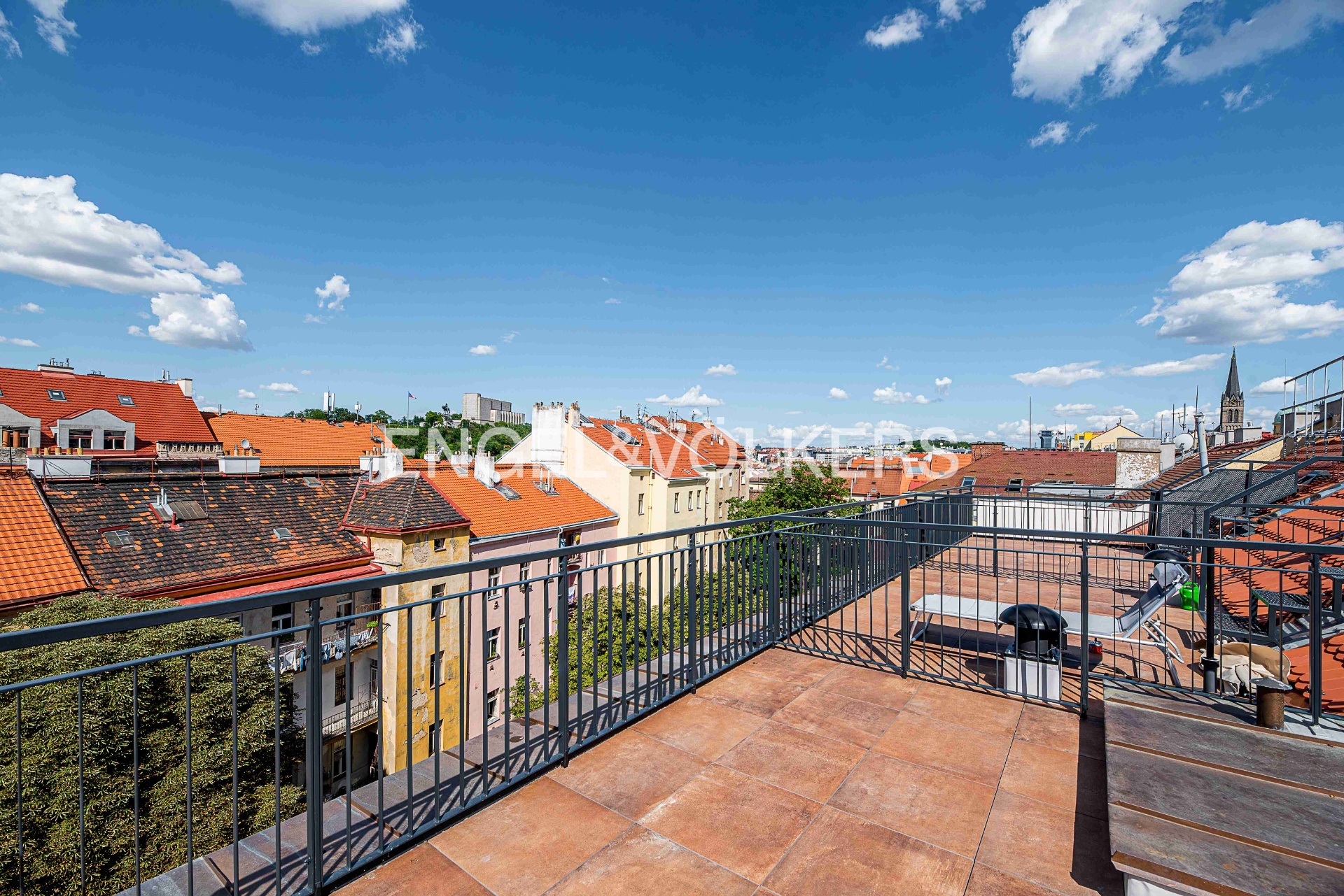 Praktická dispozice této jednotky nabízí vstupní místnost s vestavěnými skříněmi, dvě ložnice s okny do klidného vnitrobloku. Koupelna s vanou a toaletou, druhá koupelna se sprchovým koutem a toaletou, prostorný obývací pokoj, kompletně vybavená kuchyň s kvalitními spotřebiči včetně myčky a elektrickými roletami. Z obývacího pokoje se po schodech dostanete na galerii se vstupem na velkou střešní terasu s výhledy do okolí.