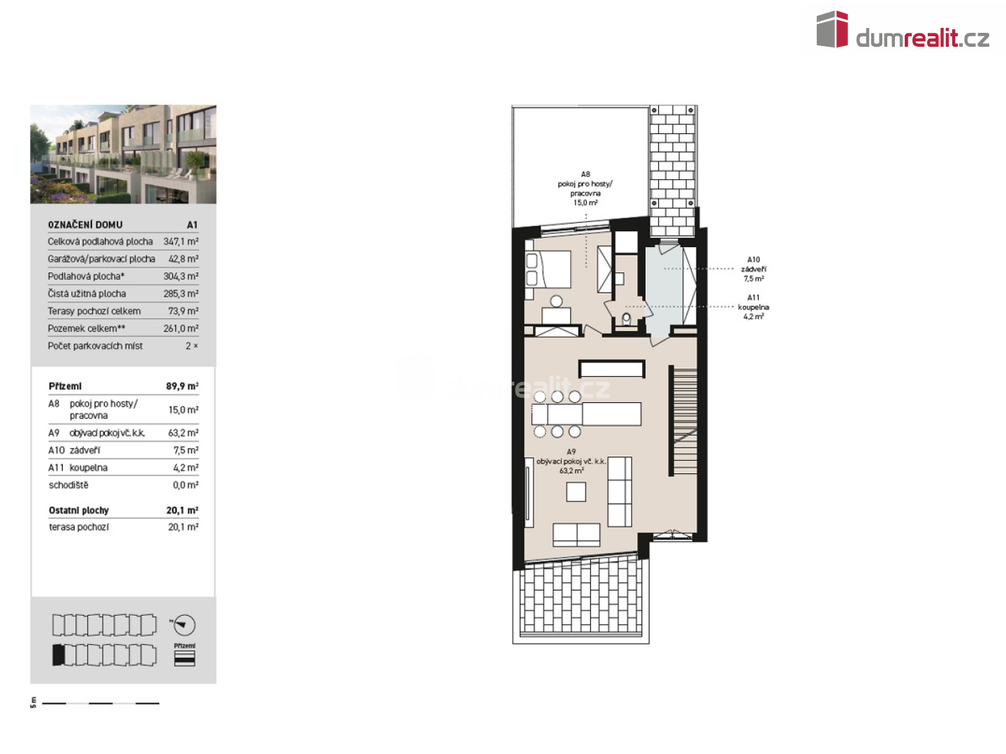 Hledáte nadstandartní dům v blízkosti budoucí stanice metra? Tak právě pro vás zde mám multifunkční, vícegenerační rodinný dům s dispozicí 6+kk v Praze 12 – Libuš, který je vzdálen pouze 2 minuty pěšky od budoucí stanice metra D a je v uzavřeném rezidenčním areálu s dalšími 15 domy. Celková podlahová plocha domu je 285,3 m², jsou zde dvě terasy (73,9 m²), plocha pozemku je 261 m² z toho zahrada má celkem 128 m². Dispozice tohoto moderního, nízkoenergetického domu tvoří v přízemí: prostorný obývací pokoj + kk (63,2 m²) se vstupem na terasu (20,1 m²), pracovna (15 m²) s vlastní koupelnou s WC (4,2 m²) a zádveří (7,5 m²). Po schodišti (6,6 m²) obloženém dřevem se dostaneme do 1. patra (2NP), kde je hlavní ložnice (21 m²) s šatnou a vlastní koupelnou s WC (8,5 m²), dále centrální koupelna (6,6 m²) s WC a bidetem, hala (5,8 m²) a dva dětské pokoje (18,6 + 19,5 m²). Po dalším schodišti se dostaneme do menší chodby (6,3 m²), která velkoformátovým oknem s HS portálem navazuje na panoramatickou terasu 74,4 m², která je z části krytá (prostor na vířivku) a je orientována na východ, sever a západ. Z obývacího pokoje se po schodišti dostaneme do suterénu domu, kde je multifunkční místnost, kterou můžete zcela upravit podle svých potřeb. Tato místnost má nadstandartních 62,4 m² a můžete zde mít opravdu cokoliv – např. samostatnou bytovou jednotku 1+kk s koupelnou a WC, kinomístnost, karaoke, panský klub, fitness anebo svoji soukromou pracovnu (např. pro advokáty, architekty, projektanty, daňové poradce apod.). Tato místnost je nedokončená a je připravena na úpravy dle vašich představ. Místnost má také přístup přímo z garáží – velmi výhodné. V suterénu domu je dále chodba se zádveřím a sklep / tech. místnost (12,3 m²) a komora (5 m²), kde je umístěný plynový kondenzační kotel. Ze suterénu je také vstup na zahradu (98 m²), která je kaskádovitá. Další zahrada je před vstupem do domu (30 m²) ve vnitrobloku. V celém domě je podlahové topení, okna jsou dřevěná, v obývacím pokoji a na terase je HS portál, u všech oken je příprava ne před okenní žaluzie, v domě je zavedeno optické vlákno na internet, podlahy jsou dřevěné vč, obložení schodiště. Vstupní dveře do domu jsou bezpečnostní, interiérové pak také dřevěné s obložkami. V areálu tohoto projektu je klid a soukromí. Osobně mohu doporučit, můj velmi blízký přítel zde bydlí, rád vám jako zájemci o koupi může předat další informace. Tento dům je rohový a celý projekt je umístěn na konci slepé ulice se vstupem do budoucího parku navazují až ke stanici metra D. Velmi vám doporučuji prohlídku tohoto domu 6+kk (285,3 m²), který vás svou velikostí ohromí, dispozicí nadchne, a nakonec chytí za srdce. Ev. číslo: 655256.