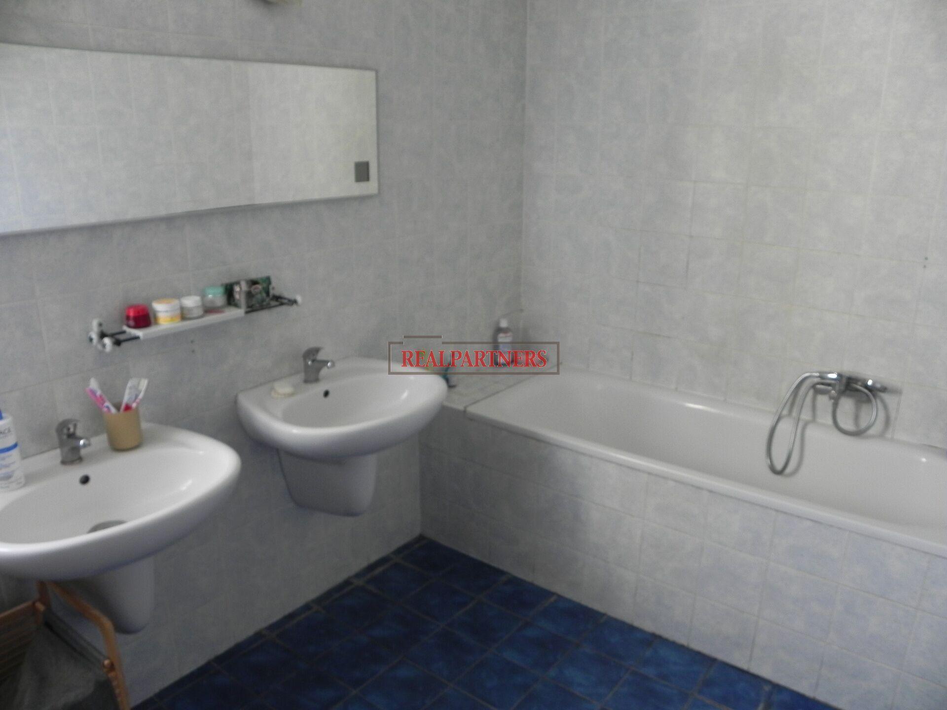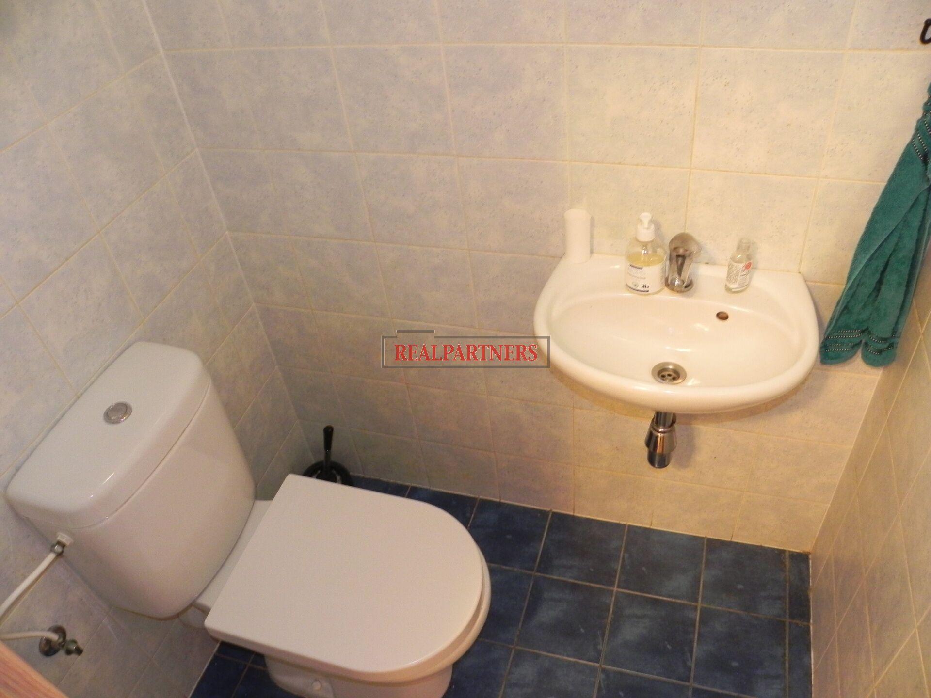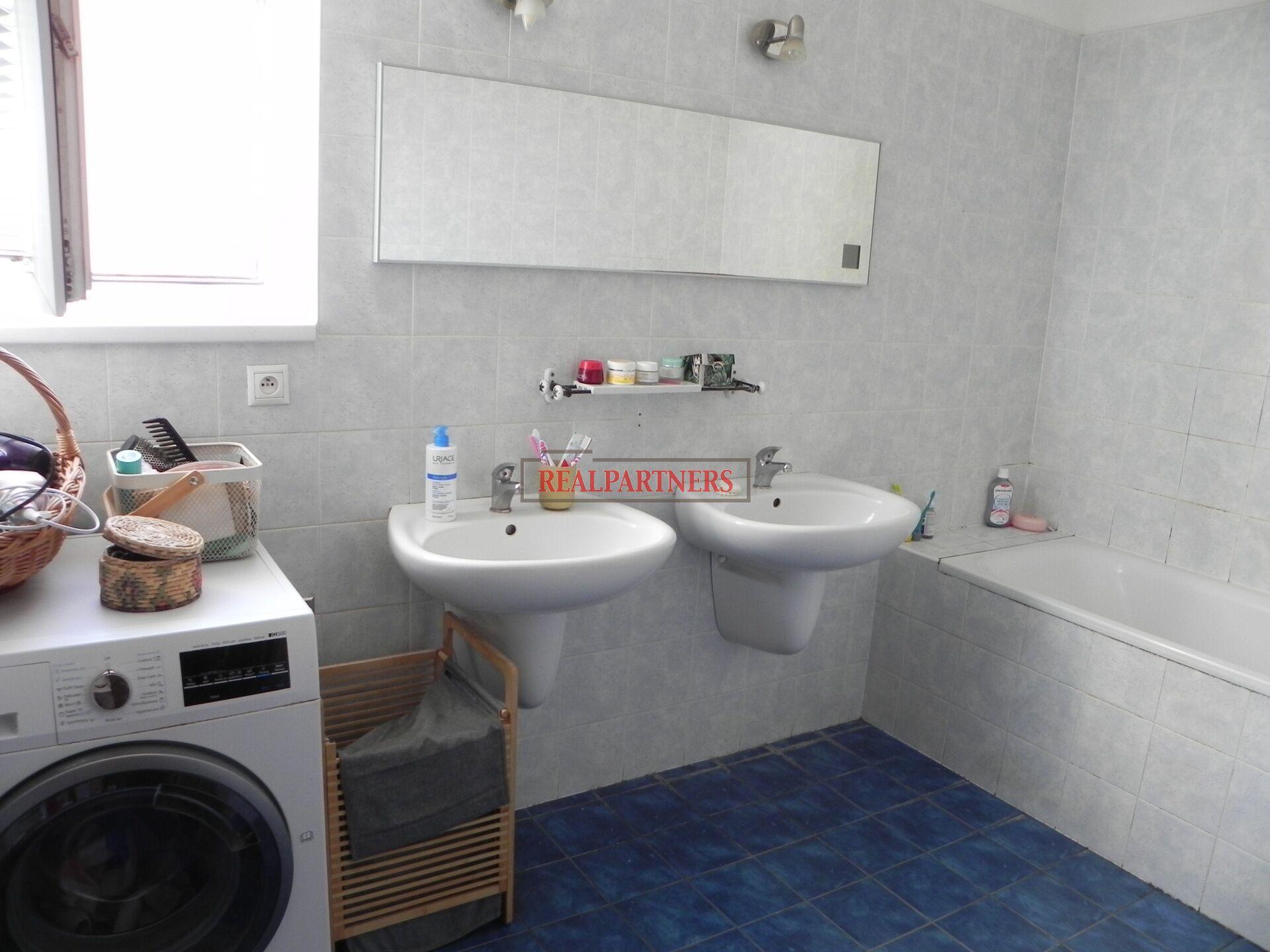 Zděna koupelna s vanou, v koupelně je okno, toaleta zvlášť.