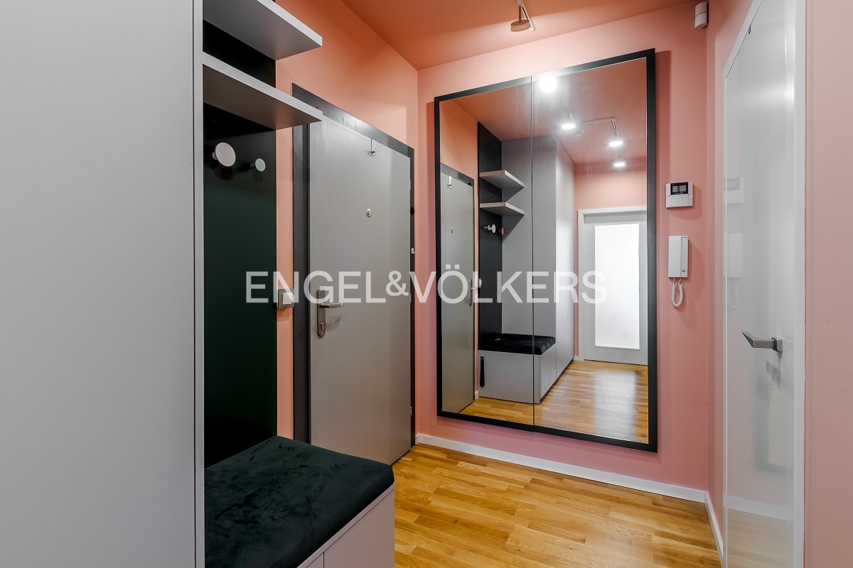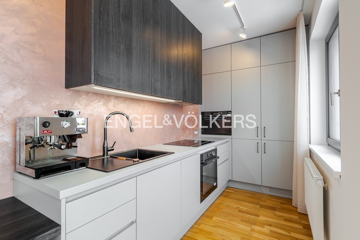 Byt nabízí prostorný obývací pokoj s plně vybavenou kuchyní s vestavěnými spotřebiči De Dietrich. Z obývacího pokoje je přímý vstup na prostornou lodžii. Součástí dispozice je ložnice s vestavěnou šatní skříní, koupelna se sprchovým koutem a samostatná komora s pračkou a sušičkou. Byt je vybaven elektricky ovládanými předokenními roletami a klimatizací v obývacím pokoji i ložnici. K bytu náleží garážové stání v podzemním parkovišti a sklep. K dispozici je také společná zahrada.