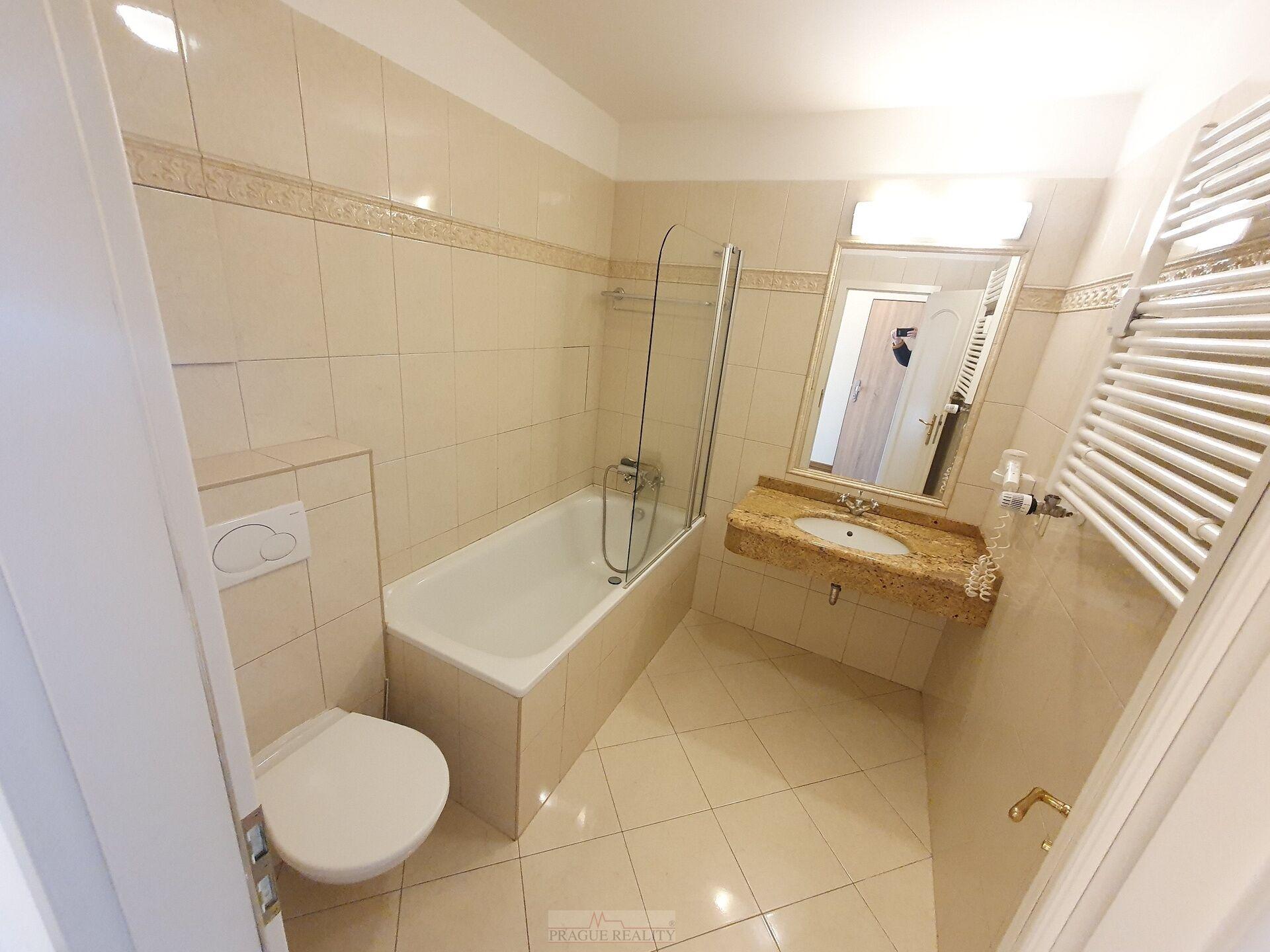 Byt má předsíňku, velkou koupelnu s vanou a WC, a dále pokoj s moderní kuchyňskou linkou a spotřebiči (varná el. dvouploténka, digestoř, dřez s baterií, malá lednice). V pokoji je klimatizace. Byt je byt pronajímán nezařízený, zůstala zde pračka po původní podnájemnici. Topení a ohřev vody je ústřední, velmi pohodlné a bez starostí z centrální kotelny v domě (každý byt má vlastní měřič). Elektroměr je převáděn na klienta.