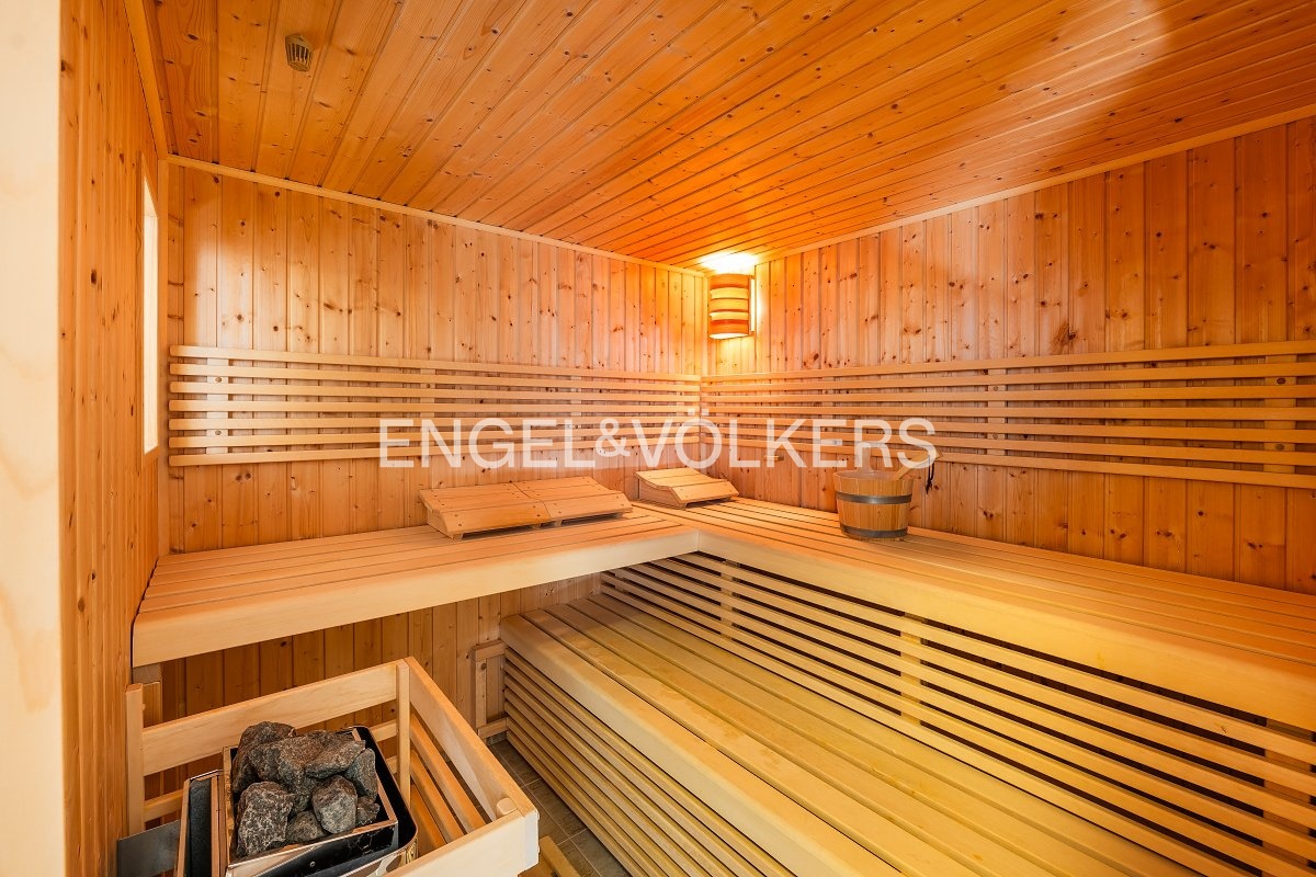 V suterénu domu je obývací místnost s krbem a vybavenou kuchyňskou linkou. Tuto místnost lze využívat jako společenský prostor pro návštěvy či jako vinný sklípek. V suterénu je i posilovna a finská sauna u které je sprcha, samostatná toaleta, dále je zde sklad a technická místnost. K tomuto rodinnému domu náleží garáž se dvěma parkovacími místy a také zahrada s automatickým zavlažováním.