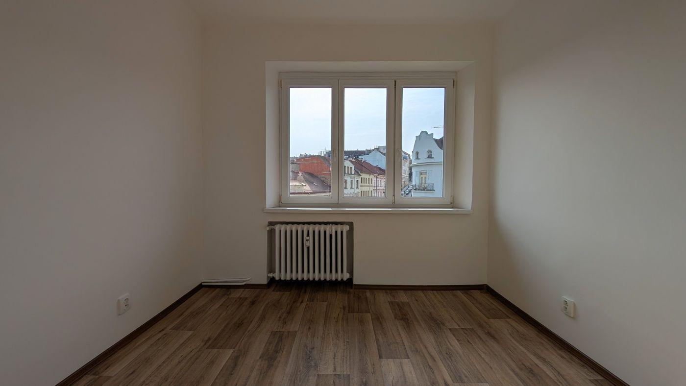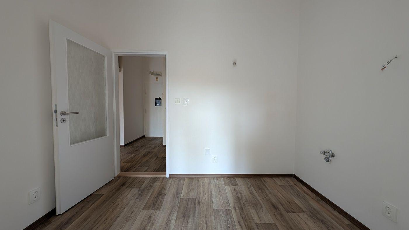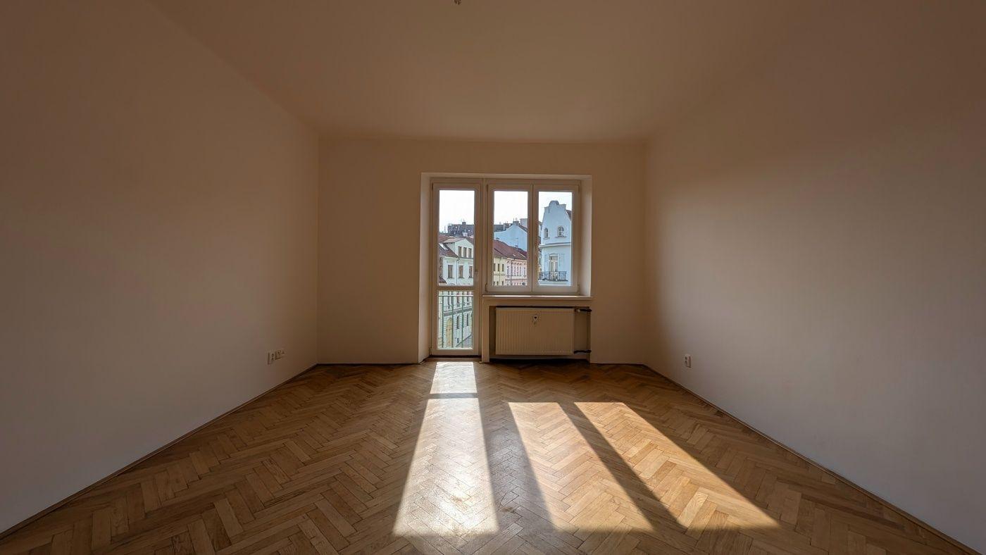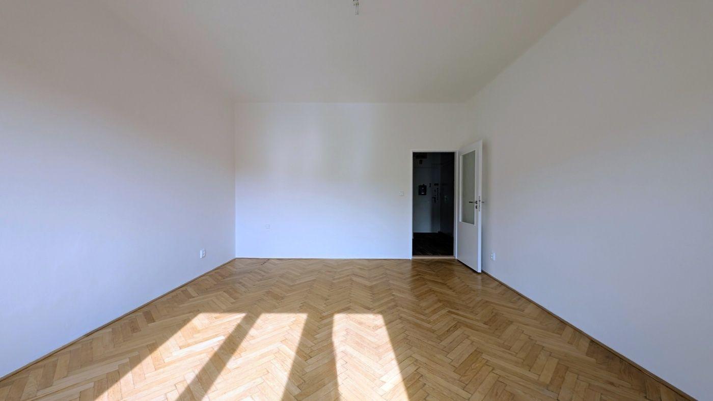 Byt o dispozici 2+kk ve 4. NP nabízí obývací pokoj (22,4 m²) připravený pro instalaci kuchyňského koutu a samostatnou ložnici (12 m²). V obytných místnostech jsou zachovány klasické parkety (rybí kost) a vysoké stropy přes 3 metry. Koupelna v neutrálních barvách je vybavena vanou, v pokojích jsou instalovány radiátory. Jednotka se pronajímá bez kuchyňské linky.