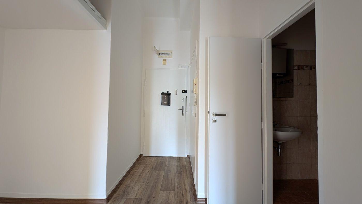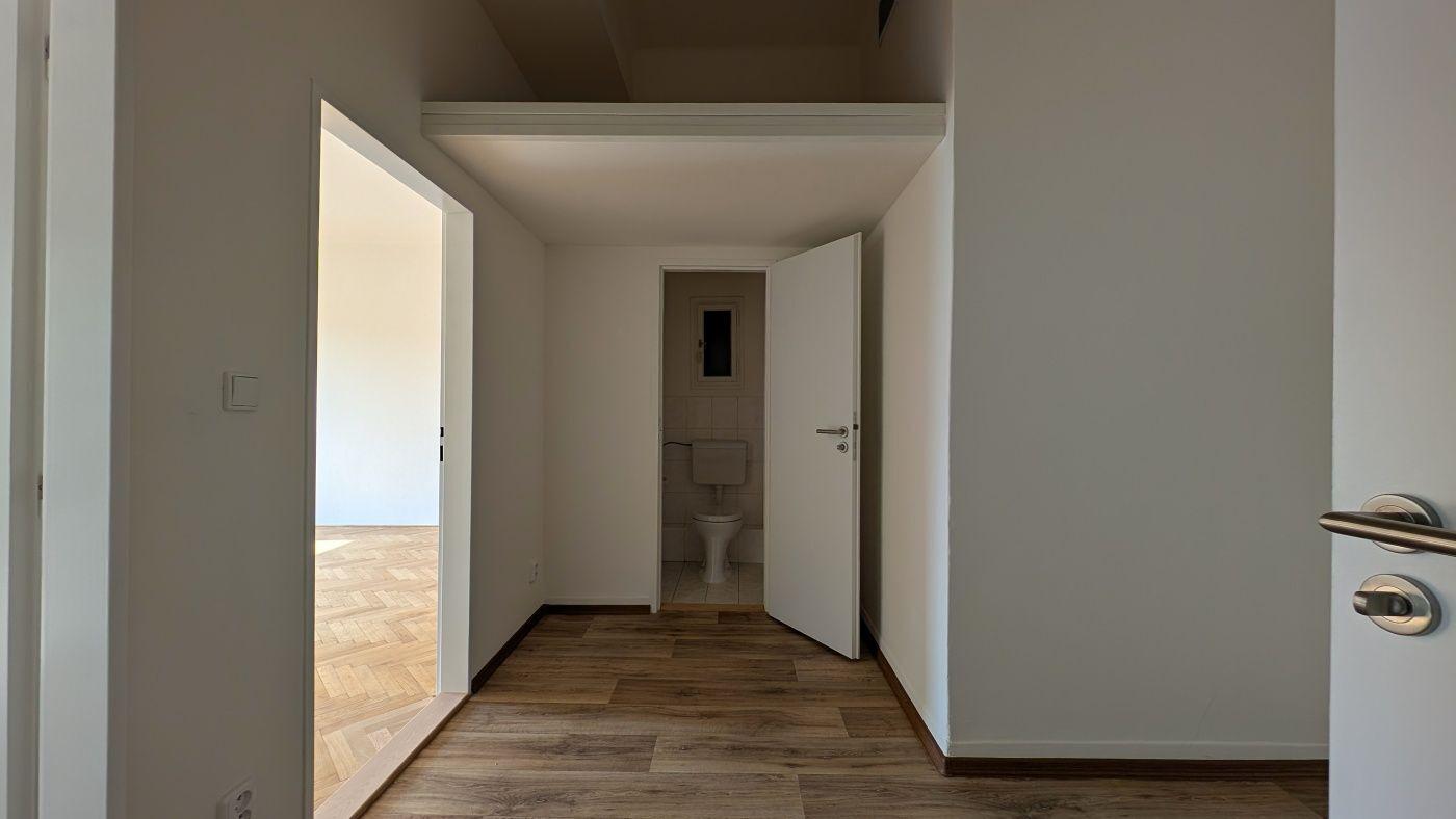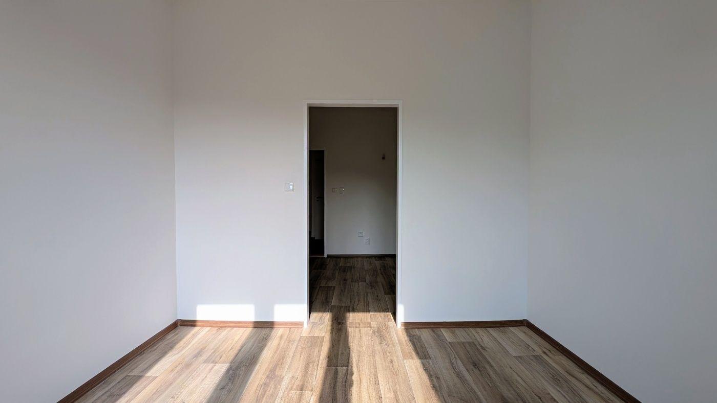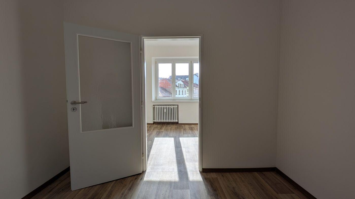 Byt o dispozici 2+kk ve 4. NP nabízí obývací pokoj (22,4 m²) připravený pro instalaci kuchyňského koutu a samostatnou ložnici (12 m²). V obytných místnostech jsou zachovány klasické parkety (rybí kost) a vysoké stropy přes 3 metry. Koupelna v neutrálních barvách je vybavena vanou, v pokojích jsou instalovány radiátory. Jednotka se pronajímá bez kuchyňské linky.