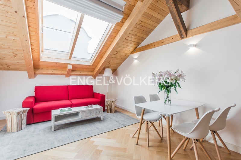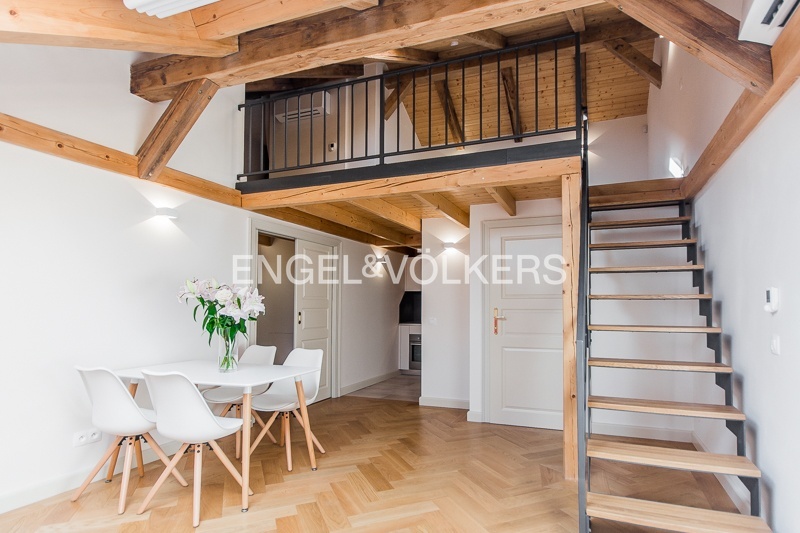Tento jedinečný apartmán může být díky svému dispozičnímu řešení jednoduše změněný z jednopokojového na dvoupokojový byt. Srdce tohoto bytu tvoří útulný obývací pokoj s originálně řešeným střešním oknem, který je propojený s kuchyní a galerií. Galerie v patře je zařízená dvojlůžkem a může fungovat jako regulérní ložnice.
