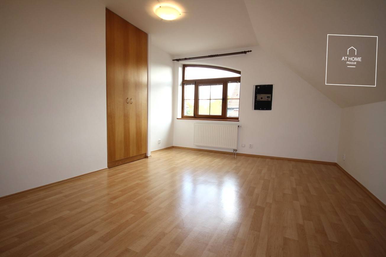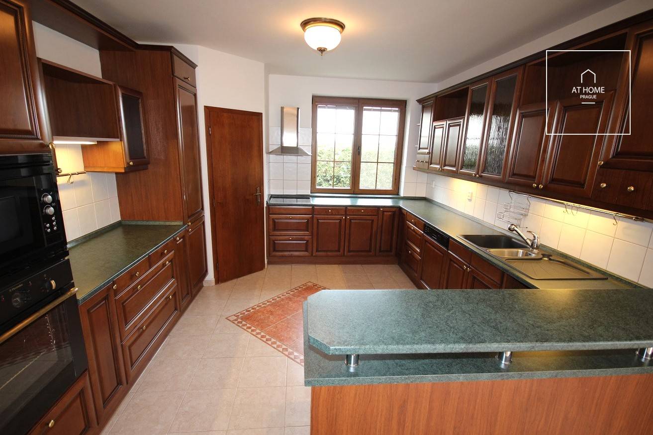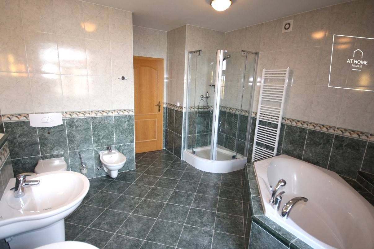 Prostorná vila 9+1 na Praze 6, v Nebušicích. 384m2, 2 patra, zahrada, vyhřívaný venkovní bazén, terasa a garáž pro 2 vozy. Další parkování na pozemku. Obývací pokoj se vstupem na terasu a do zahrady, plně vybavená kuchyň s jídelní částí, 2 ložnice v přízemí a 6 ložnic v horním patře. 4 koupelny (jedna z koupelen je u sauny - sprchový kout), komora, úklidová místnost, kotelna, spíž a 2 balkony. Udržovaná zahrada, alarm, trezor, vestavěné skříně. V blízkosti mezinárodní školy, dobrá dostupnost do centra i na letiště. Energetický štítek G (údaj bude aktualizován). Unfurnished, spacious 8-bedroom family house in Nebušice, Prague 6. 384 sq m, 2 levels, garden, heated outdoor swimming pool, terrace. Living room with access to the terrace and the garden, well-equipped kitchen with dining area, 2 bedrooms on the ground floor and 6 bedrooms on the upper floor. 4 bathrooms, sauna, pantry, utility room, 2 balconies. Indoor parking for 2 cars + parking places on the yard. Maintained garden, alarm-system, safe, built-in wardrobes. Close to the international school. Easy access to the city center and the airport. Energy label G (will be updated).
