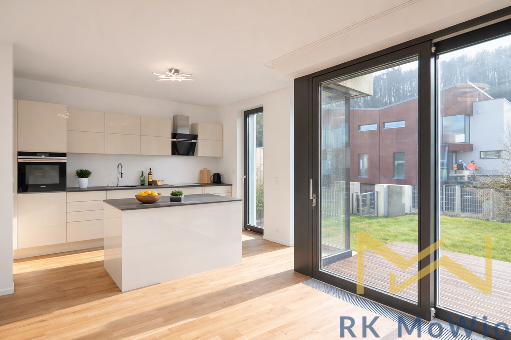 Dispoziční řešení domu zahrnuje obývací pokoj propojený s kuchyní a jídelním prostorem se vstupem na terasu a zahradu, které vytváří příjemné zázemí pro každodenní život i relaxaci. Dále jsou k dispozici tři samostatné ložnice, pracovna vhodná například jako home office či pokoj pro hosty, koupelna (vana, umyvadlo) a samostatná toaleta. Kuchyň je vybavena novou moderní kuchyňskou linkou s ostrůvkem, která poskytuje dostatek pracovního prostoru i úložných možností. Dům nabízí praktické dispoziční řešení s dostatkem denního světla a komfortními prostory pro rodinné bydlení. Součástí nemovitosti je také terasa, zahrádka a dvougaráž umístěná pod domem.