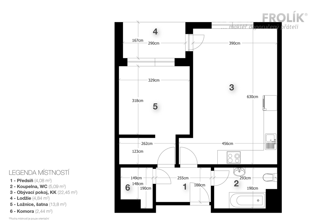 Byt má výměru cca 51 m2 + cca 5 m2 lodžii. Je celý otočený na východní stranu, do areálu. Okna jsou plastová s trojskly, takže krásně zvukově těsní. Navíc mají i mikroventilaci a vnitřní žaluzie. Kuchyňská linka je vybavena vestavěnými spotřebiči - lednice s mrazákem, el. trouba, mikrovlnka, myčka, indukční varná deska, digestoř. V chodbě bytu je komora/šatna a v ložnici je oddělený šatní kout s vlastním světlem.