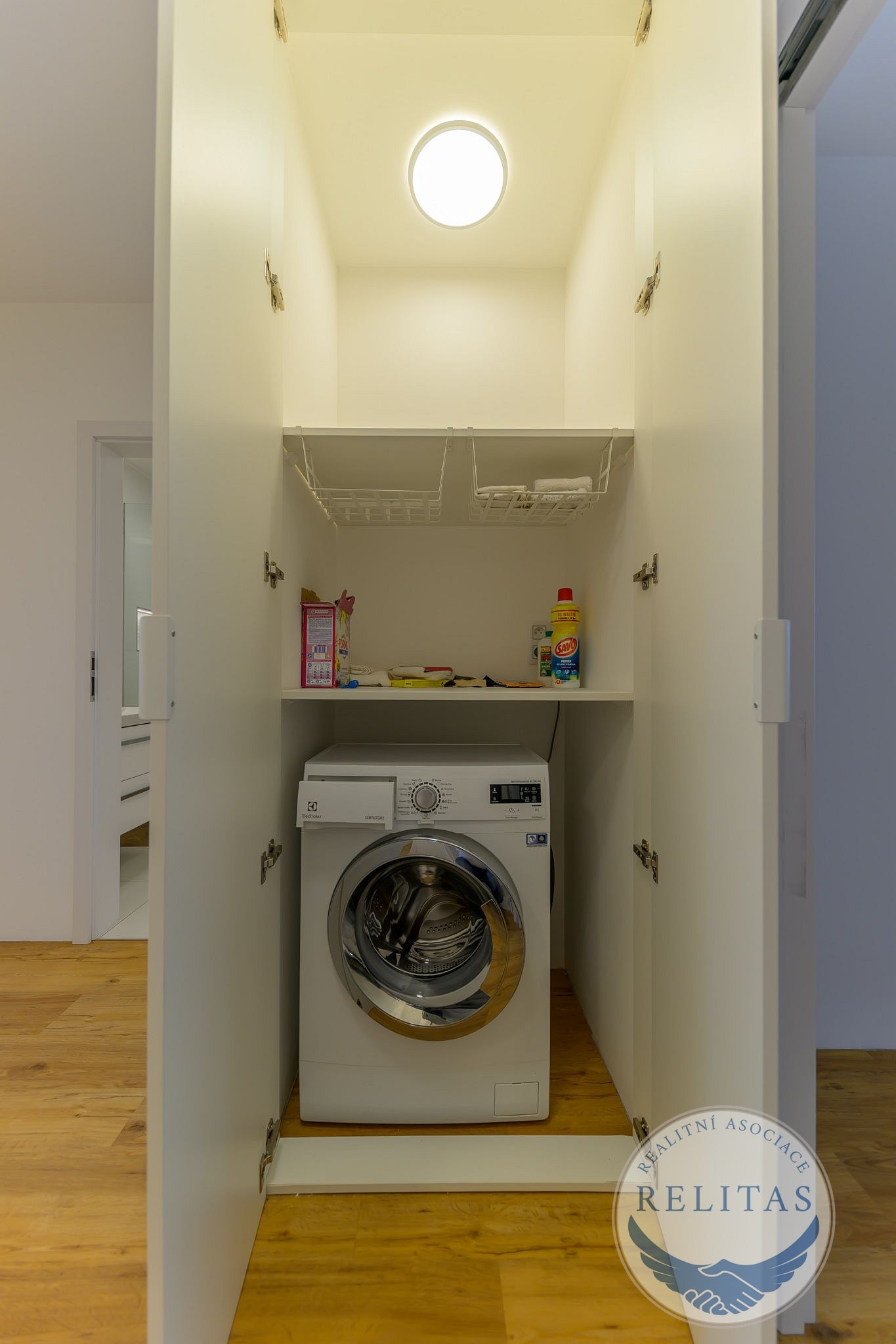 Dispozice bytu tvoří vstupní předsíň, prostorný obývací pokoj s moderní kuchyňskou linkou vybavenou indukční varnou deskou a přímým vstupem na lodžii, dvě samostatné neprůchozí ložnice (z nichž jedna disponuje šatní skříní), koupelna se sprchovým koutem a toaletou, dále praktická komora a vestavěná skříň s pračkou.