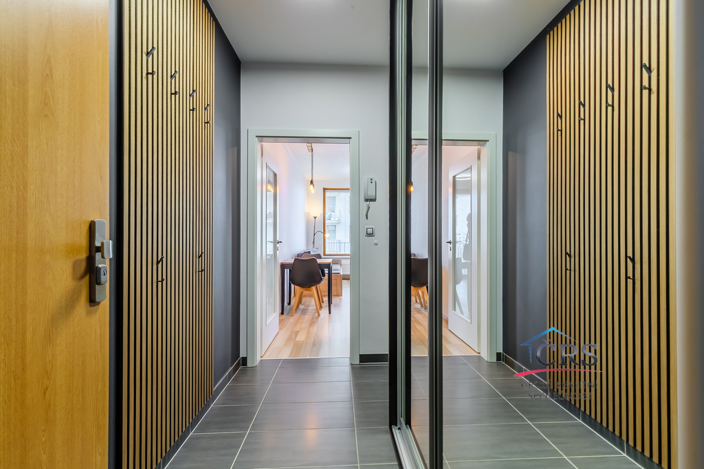 V bytě nová kuchyňská linka s elektrickou dvouplotýnkou, elektrickou troubou, digestoří, lednicí, myčkou a mikrovlnou troubou, v obývacím pokoji je TV stěna, rozkládací plnohodnotná manželská postel, stropní světlo s integrovaným ventilátorem, vstup na balkón. V chodbě vestavěná skříň na míru se zabudovanou pračkou a sušičkou, bezpečnostní dveře, obložkové zárubně a interiérové dveře, koupelna se sprchovým koutem a WC dohromady. Dřevěná euro-okna orientovaná na západní stranu. Nízké měsíční poplatky 2650,- kč