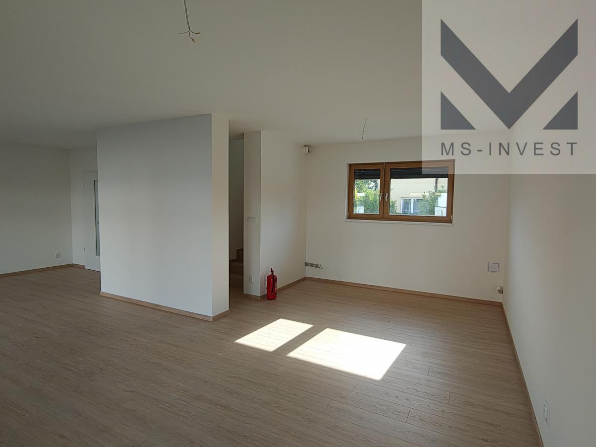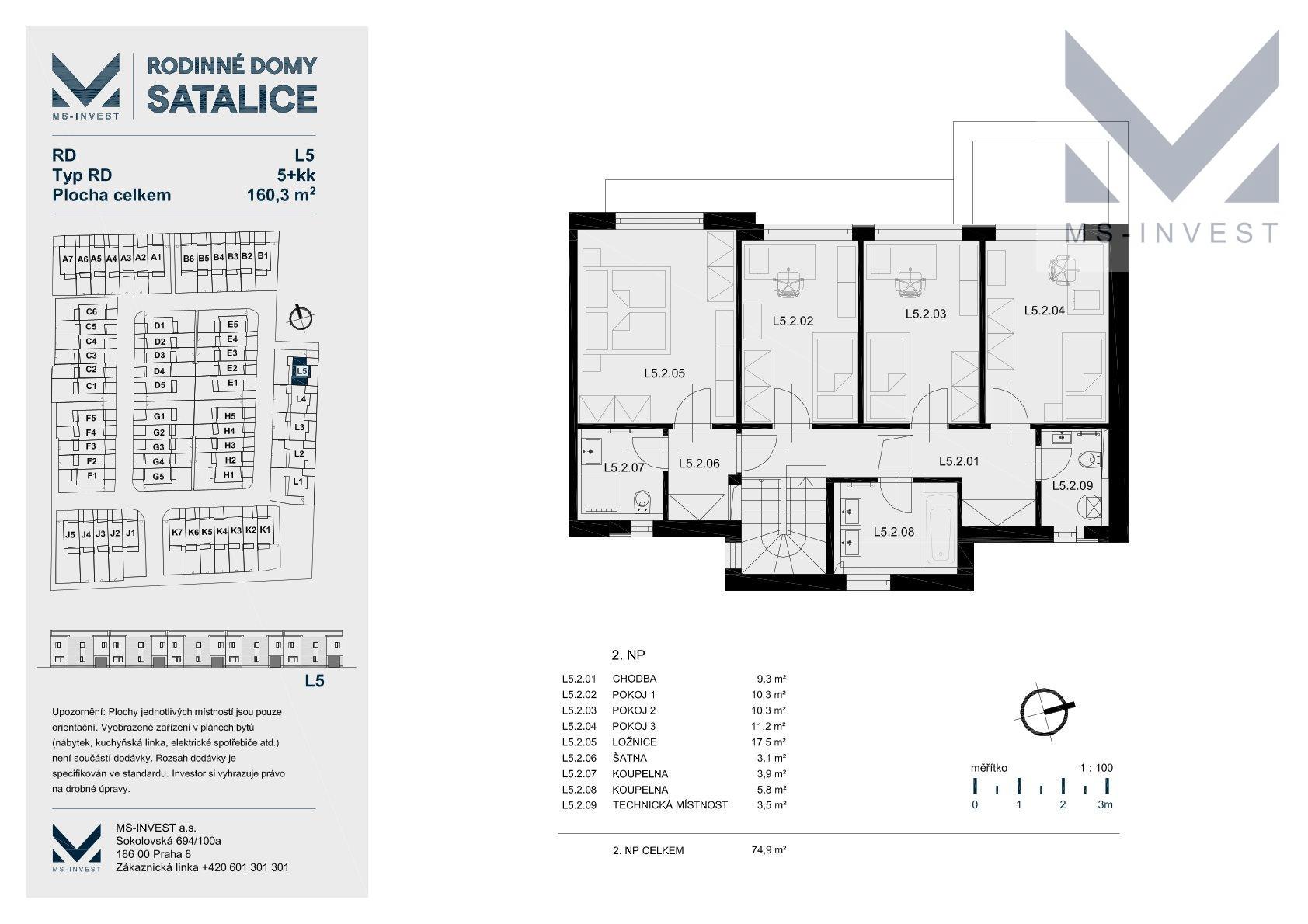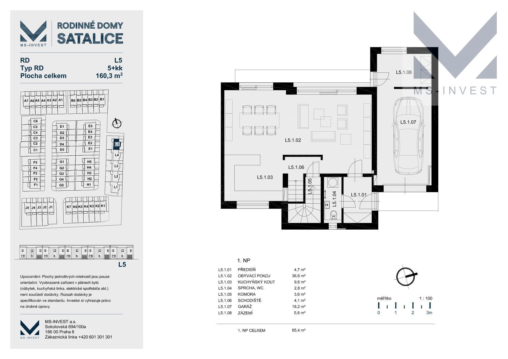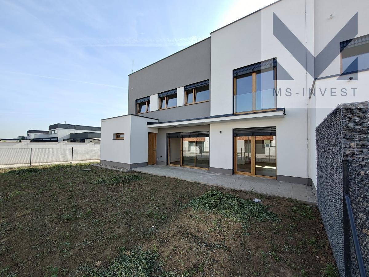 Nabízený krajní dům v projektu L-5 velikosti 5+kk a celkové podlahové ploše 160 m2 s největším pozemkem o ploše 321m2 s příjezdem u ulice Za Školkou disponuje v 1. NP vlastní garáží, zázemím (skladem) za garáží se vstupem na zahradu, dále předsíní, komorou, sprchovým koutem s toaletou, velmi prostorným obývacím pokojem s kuchyňským koutem o ploše 46 m2 a navazující terasou propojující dům se zahradou. Ve 2. NP se nachází hlavní ložnice o ploše 17 m2, včetně samostatné koupelny se sprchovým koutem a WC, se vstupem z ložnice, dále další menší tři pokoje o velikostech okolo 11 m2, koupelna s vanou a dvěma umyvadly a další samostatné WC spojené s technickou místností. Pozemek má potom velikost 321 m2.