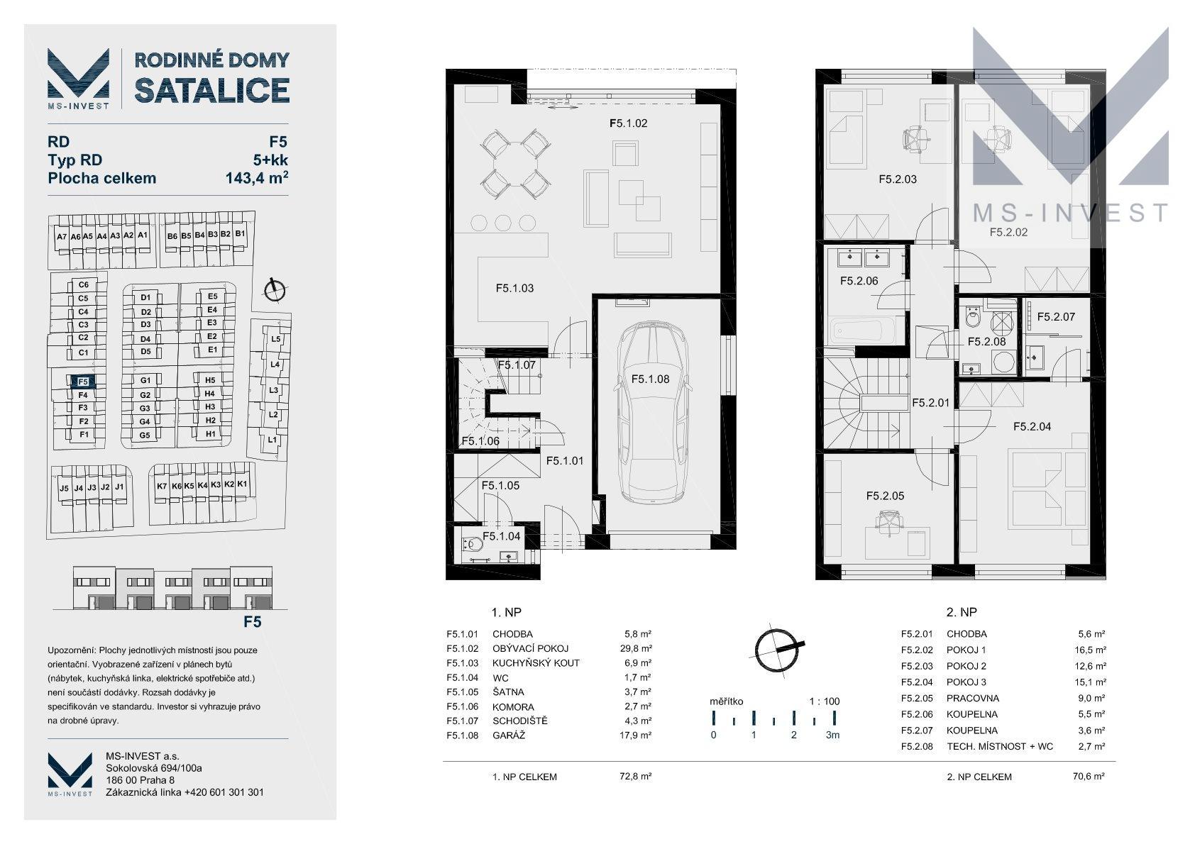 Nabízený krajní dům F-5, umístěný v rámci projektu RD Satalice v nově vzniklé ulici Hubačova, o velikosti 5+kk a celkové podlahové ploše 144 m2 disponuje v 1. NP vlastní garáží, šatnou, komorou, toaletou, prostorným obývací pokojem s kuchyňským koutem o ploše 37 m2 a navazující terasou propojující dům se zahradou. Zahrada je orientována na západ, sousedí se zahradami stávajících rodinných domů. Ve 2. NP se nachází hlavní ložnice o ploše 17 m2, včetně samostatné koupelny se sprchovým koutem a vstupem přímo z ložnice, dále 2 další ložnice, pracovna, další koupelna s vanou a samostatné WC spojené s technickou místností. Pozemek tohoto domu má velikost 295 m2 a jde o jeden z větších pozemků v projektu.