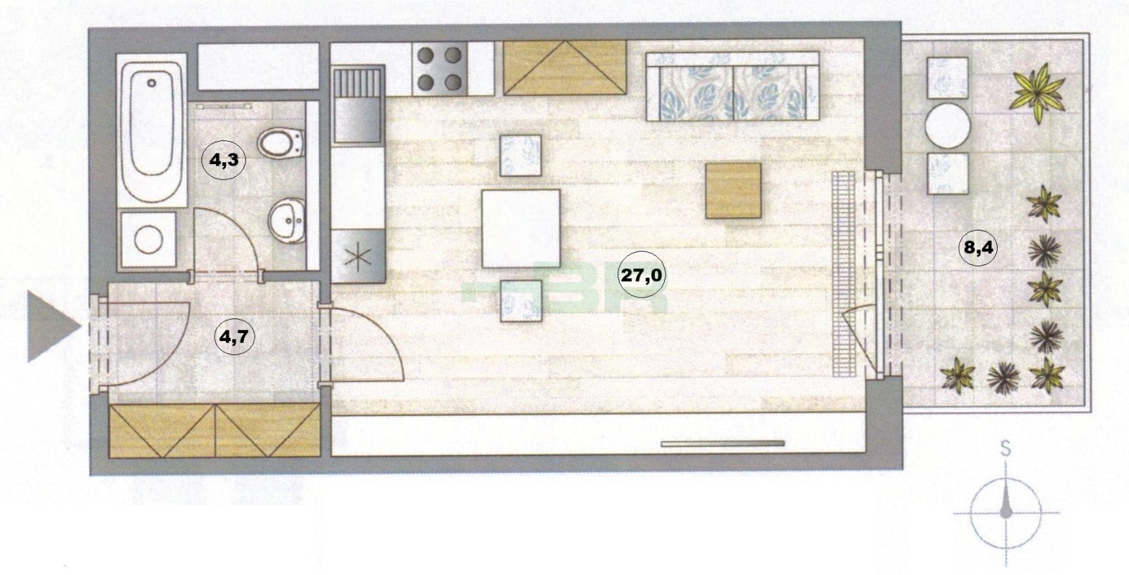 Byt 1+kk (36 m2) s balkonem (8,4 m2), sklepem (2,9 m2) a parkovacím stáním (+ 1.000,-Kč/měs.). Byt ne 2. NP patro z pěti s výtahem.
