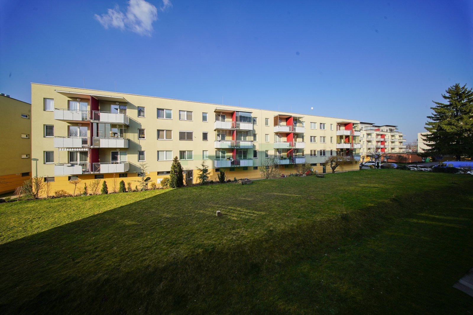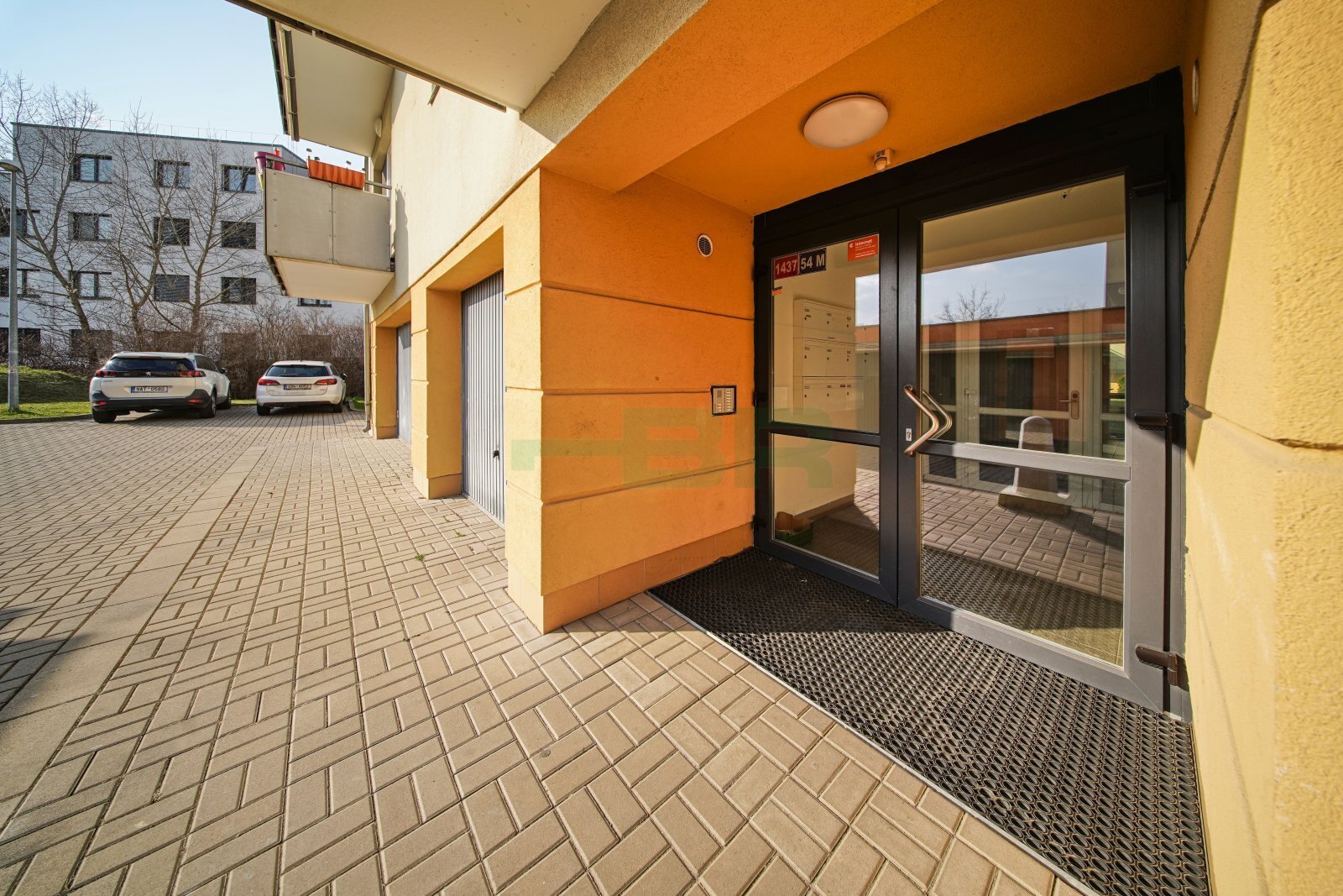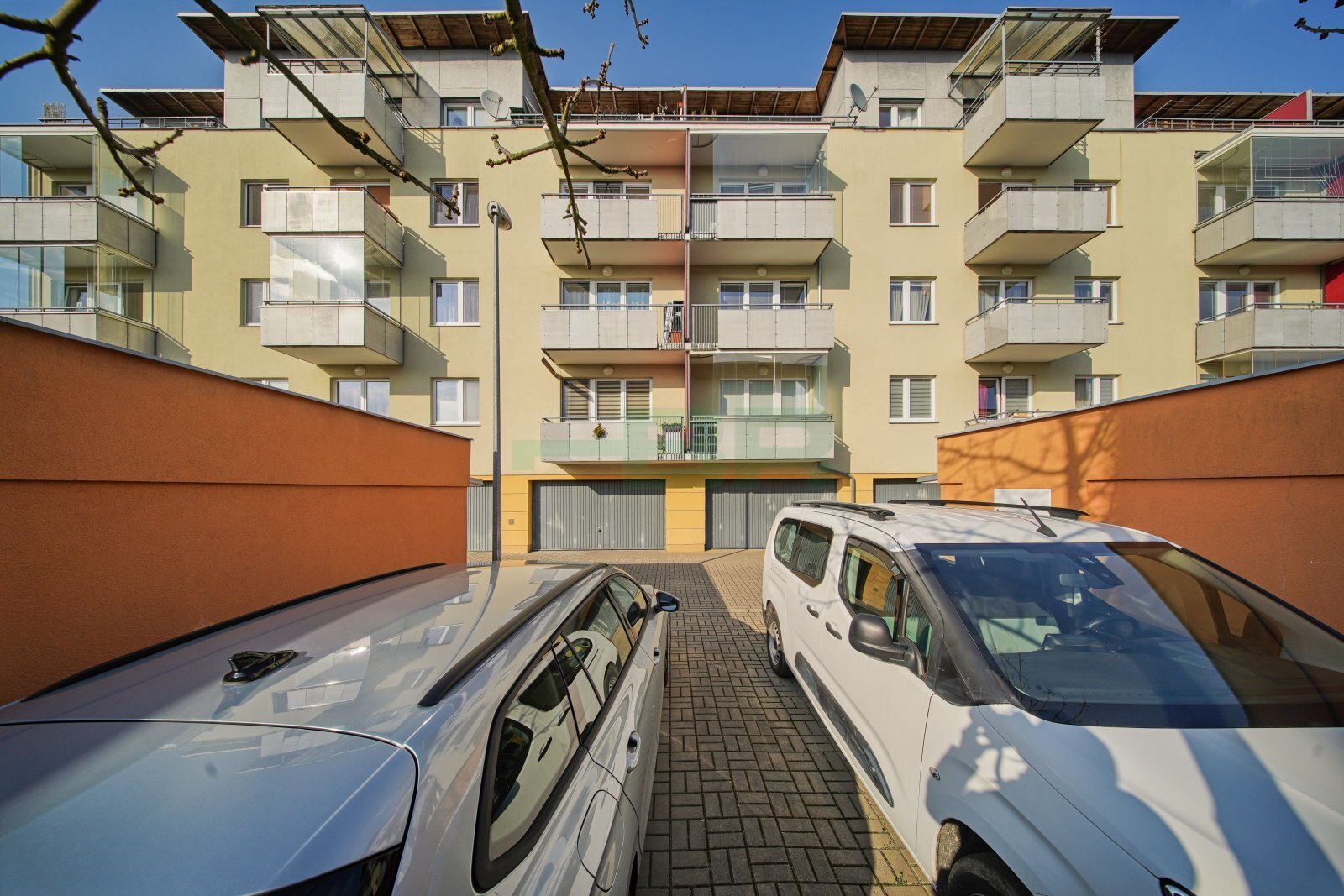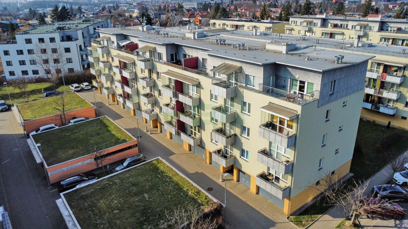 Byt 2+kk (54,9 m2) se zastřešeným balkonem (5 m2), komorou před bytem (4,4 m2) a garáží (2,84 x 5,85 = 16,6 m2) přímo před vchodem (+ 2.500,-Kč/měs.). 1. patro ze 4 s výtahem. Parapety 385 cm na úrovní!
