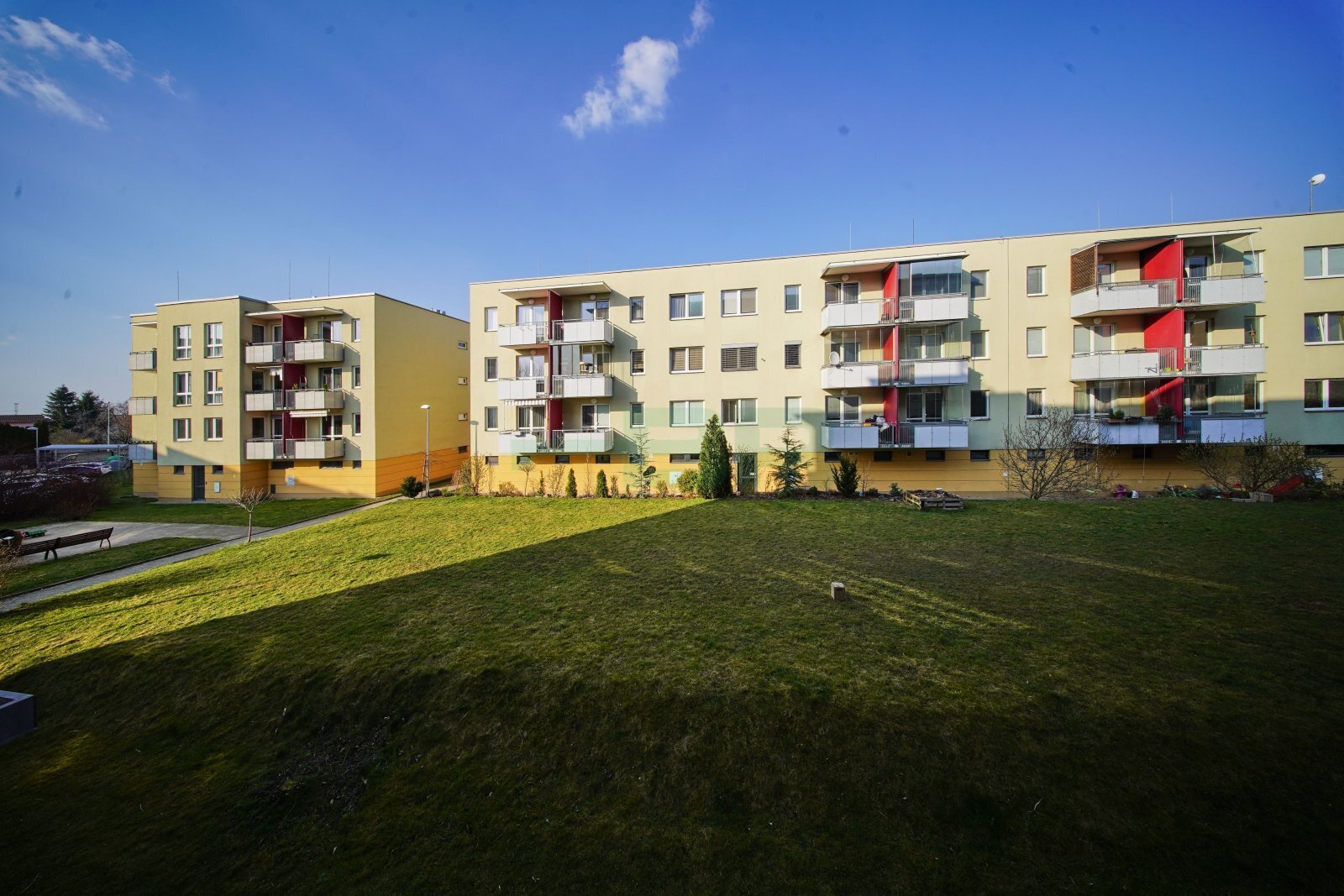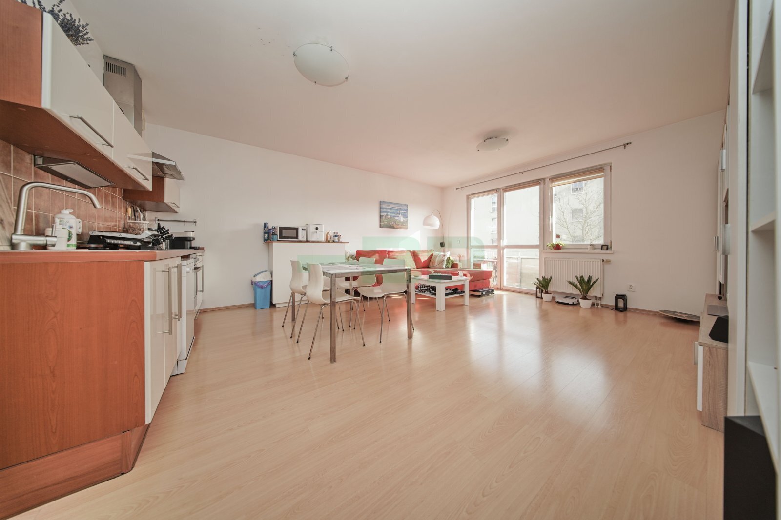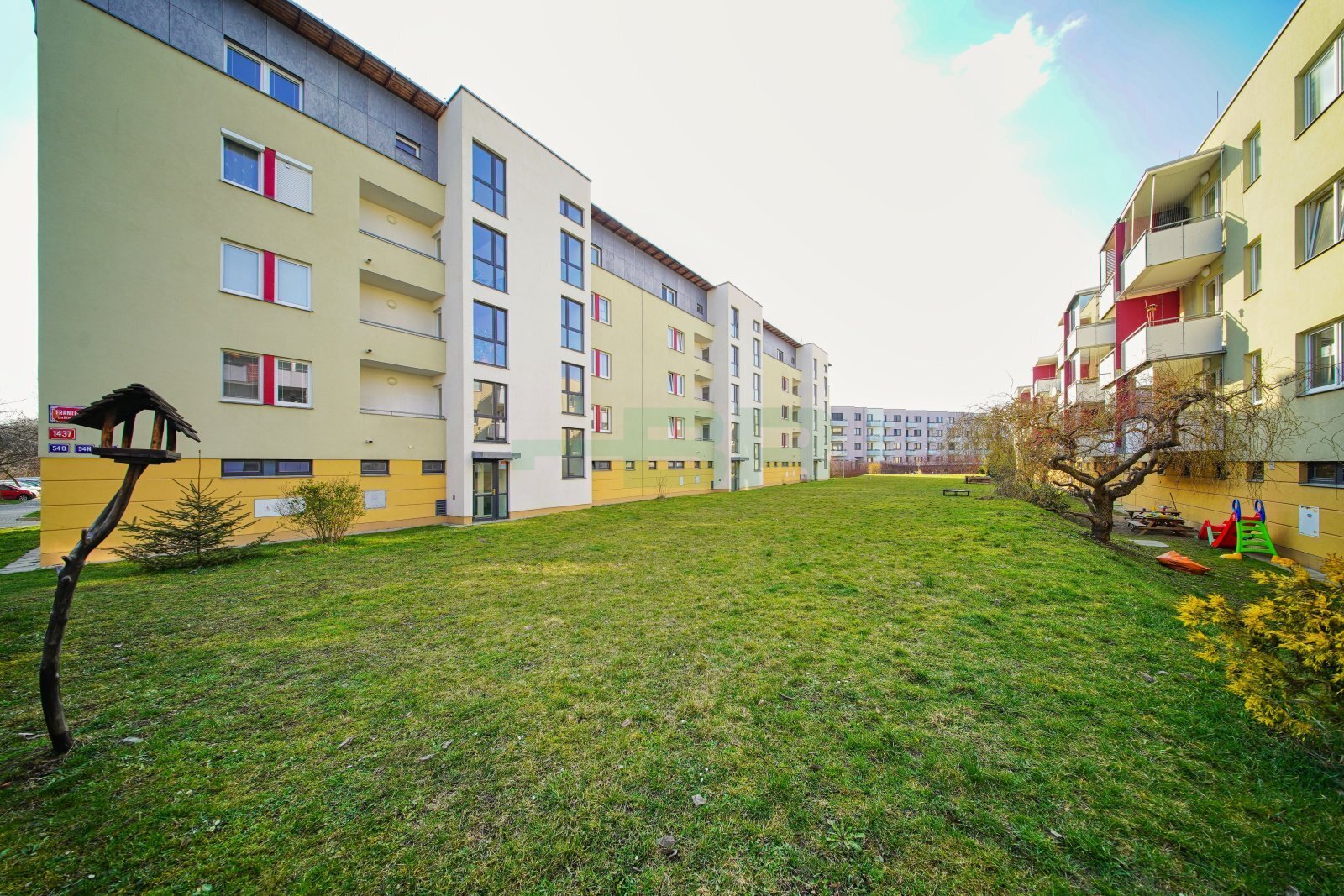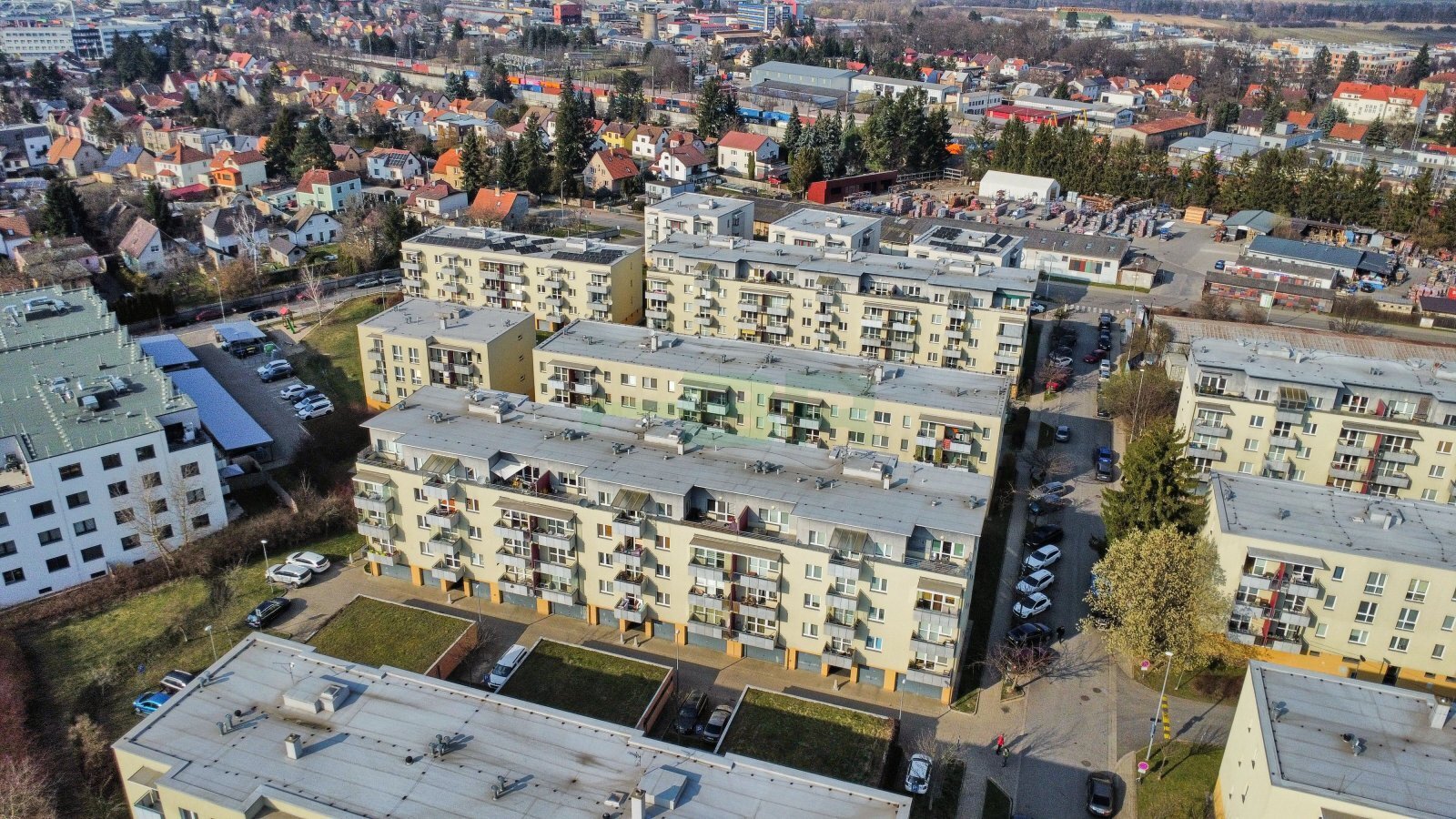 Byt 2+kk (54,9 m2) se zastřešeným balkonem (5 m2), komorou před bytem (4,4 m2) a garáží (2,84 x 5,85 = 16,6 m2) přímo před vchodem (+ 2.500,-Kč/měs.). 1. patro ze 4 s výtahem. Parapety 385 cm na úrovní!