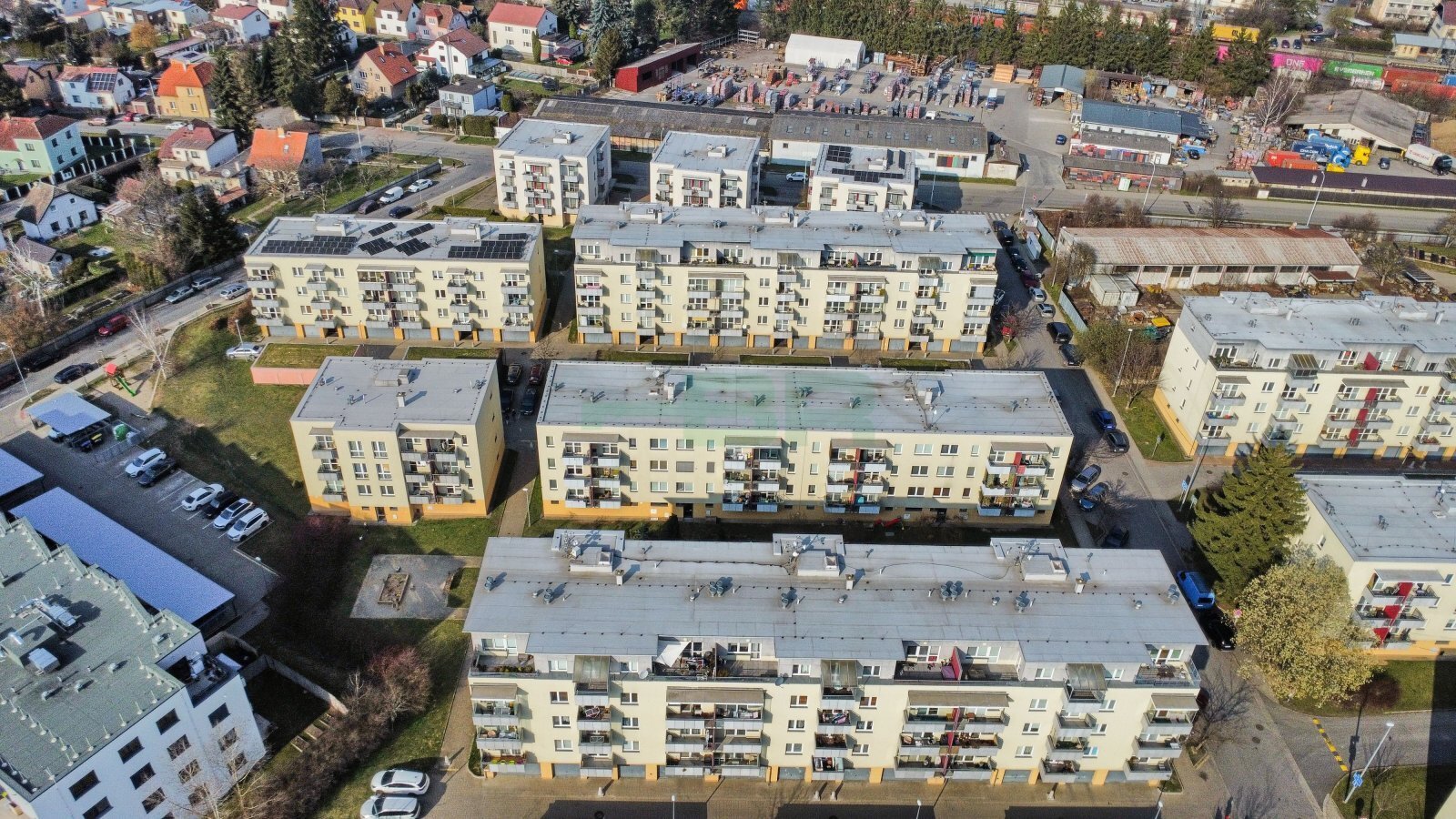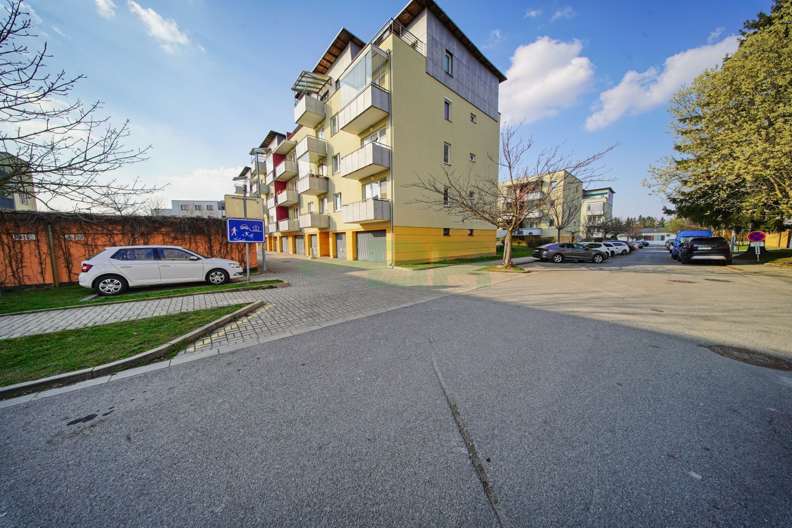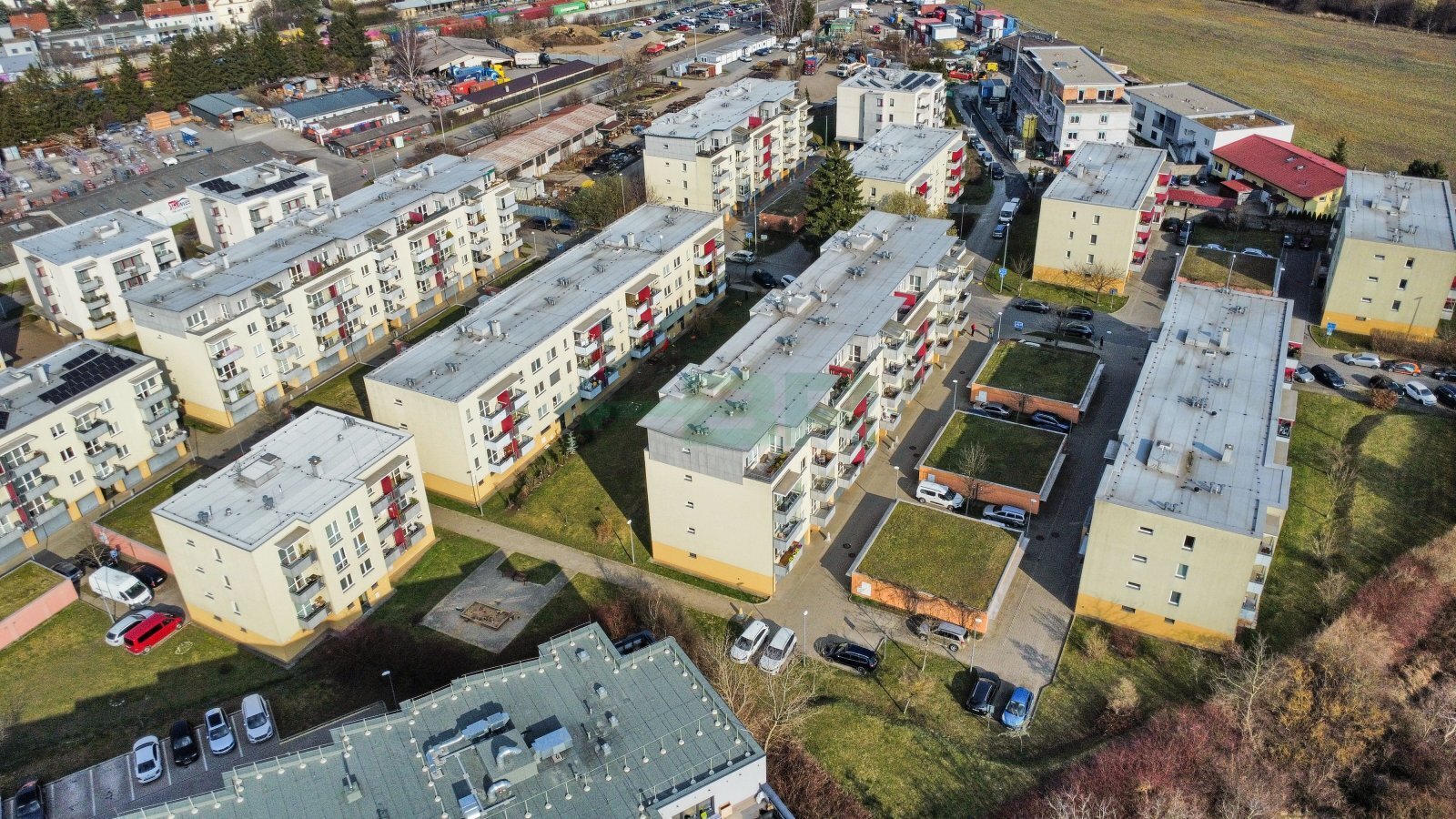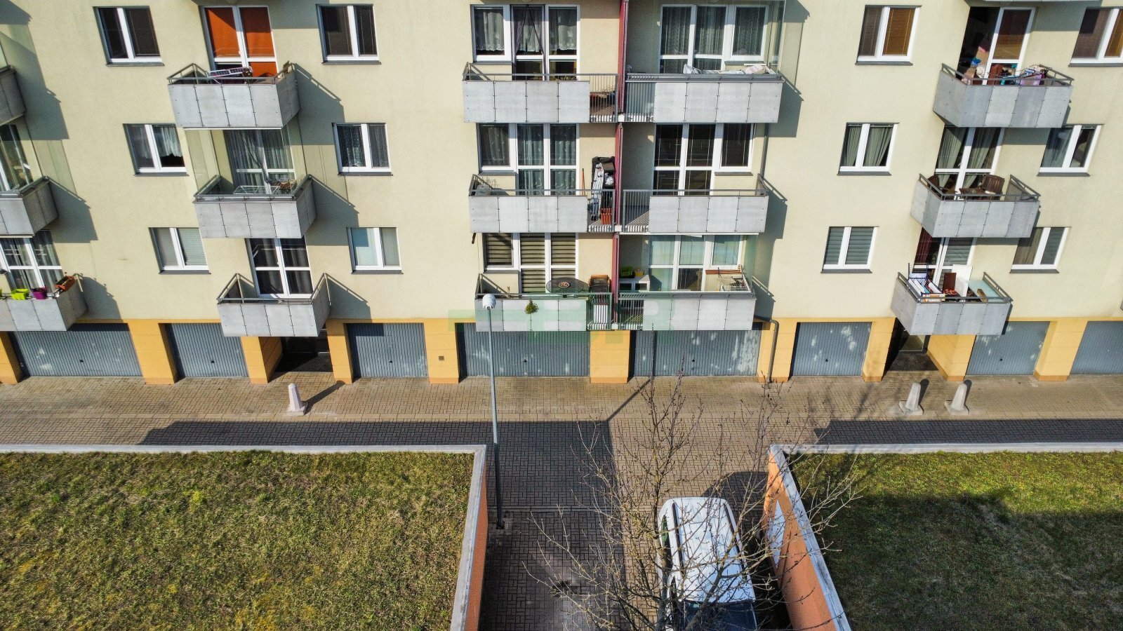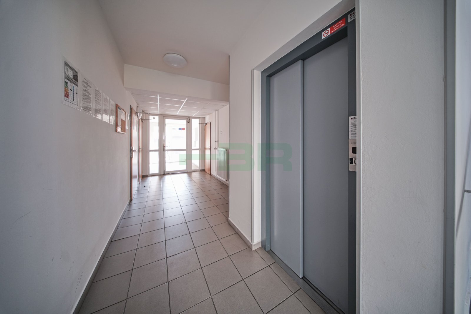 Byt 2+kk (54,9 m2) se zastřešeným balkonem (5 m2), komorou před bytem (4,4 m2) a garáží (2,84 x 5,85 = 16,6 m2) přímo před vchodem (+ 2.500,-Kč/měs.). 1. patro ze 4 s výtahem. Parapety 385 cm na úrovní!